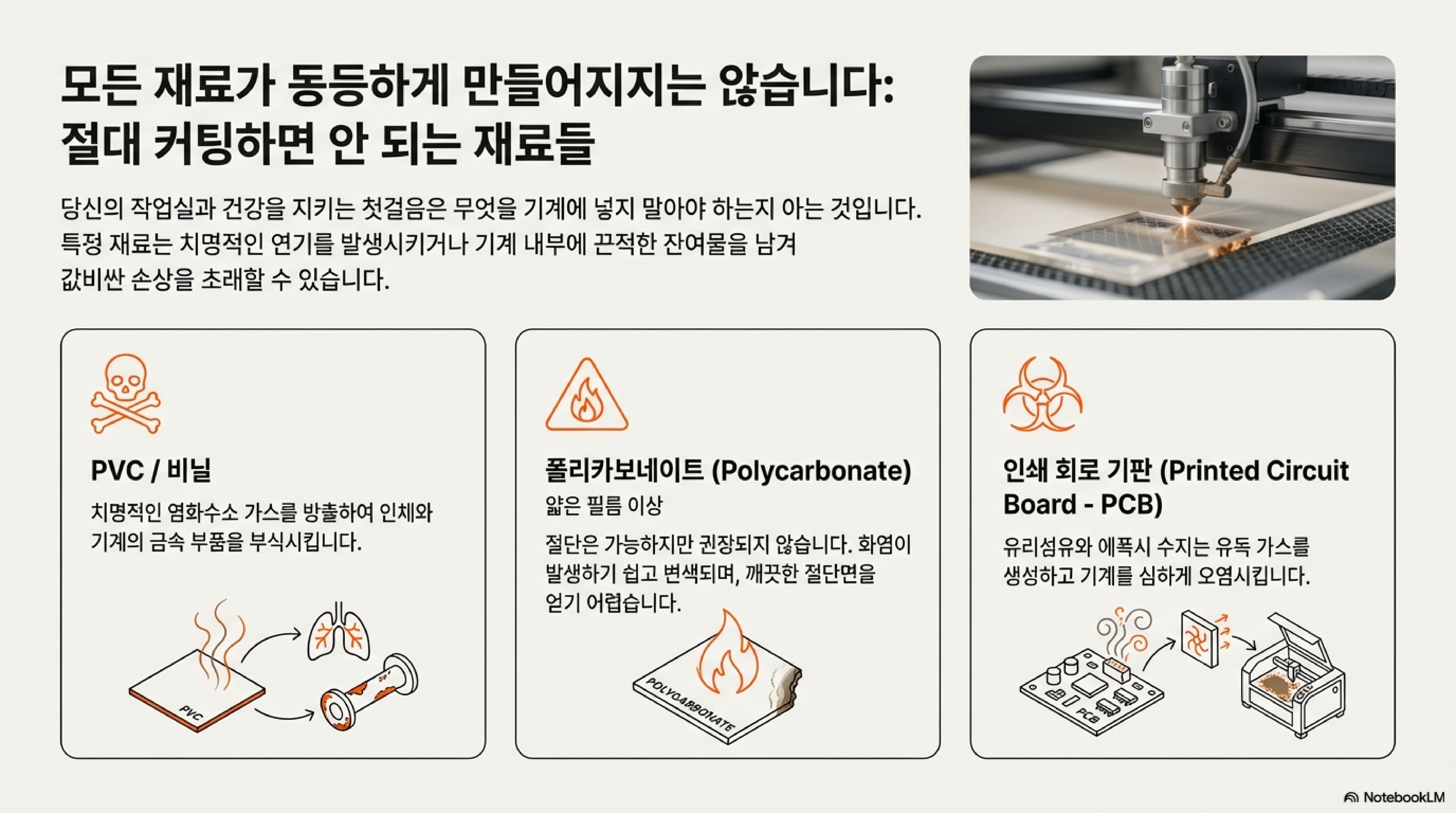 모든 것은 올바른 재료를 선택하는 것에서 시작됩니다. 특히 투명 플라스틱은 모두 비슷해 보이지만, 그 성분과 특성은 천차만별입니다. 가장 먼저 기억해야 할 철칙은 PVC(폴리염화비닐)나 비닐이 포함된 재료는 절대 사용해서는 안 된다는 것입니다. 이 재료들은 가공 시 치명적인 유독 가스를 발생시켜 사람과 기계 모두에 심각한 손상을 입힐 수 있습니다.