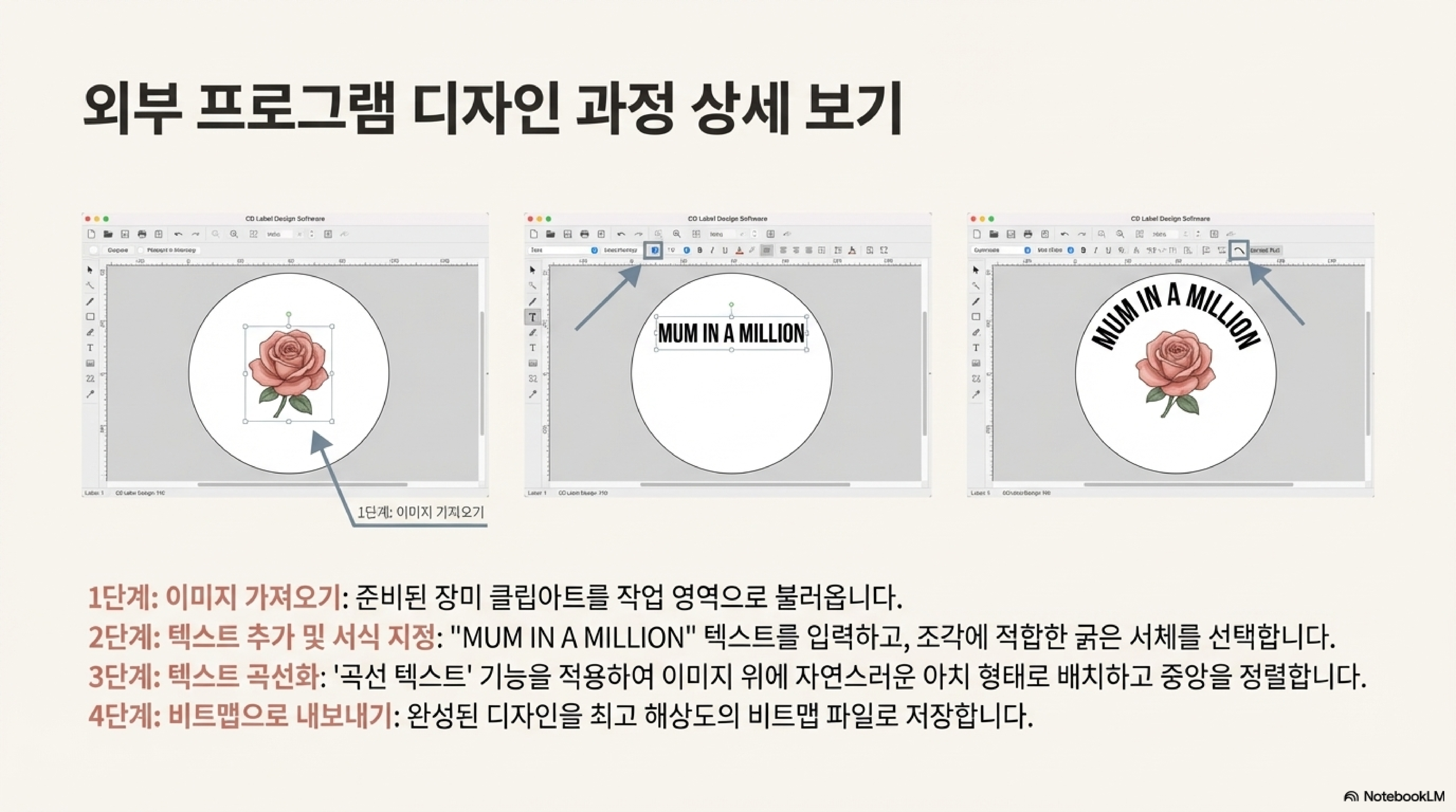 레이저 커터 전용 프로그램인 RDWorks는 디자인 작업에 몇 가지 명확한 한계를 가지고 있었습니다. 특히 텍스트를 곡선으로 만드는 기능이 부족하여, 장미 이미지 위에 'Mum in a Million'이라는 글자를 아치형으로 배치하는 데 어려움이 있었습니다.
