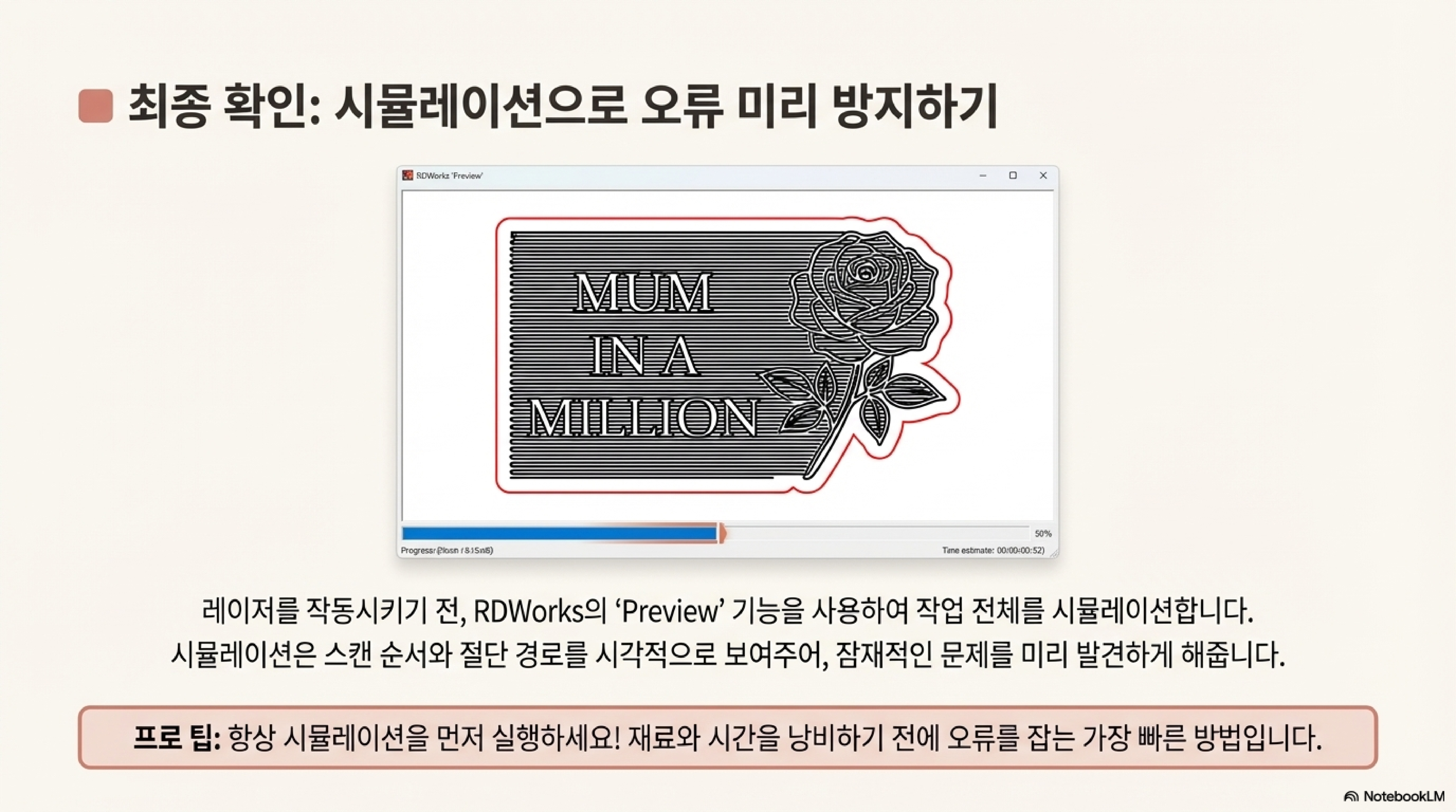 먼저, 실제 재료를 낭비하기 전에 '미리보기(Preview)'와 '시뮬레이션(Simulation)' 기능을 통해 작업 시간과 결과를 예측하는 것이 중요합니다. 다음으로, 컴퓨터에서 기계로 파일을 전송하는 과정에서 몇 가지 실용적인 팁이 필요했습니다.