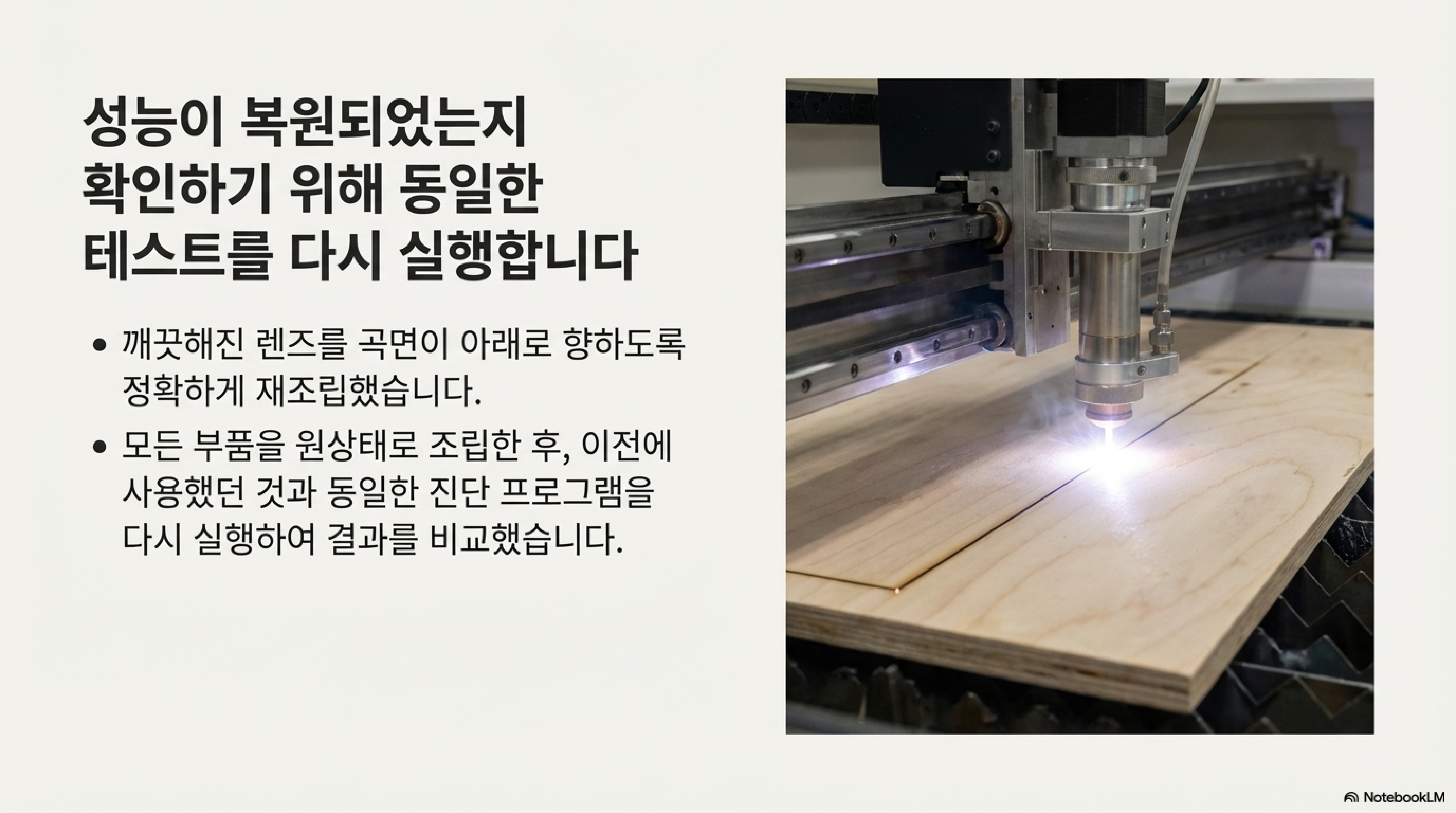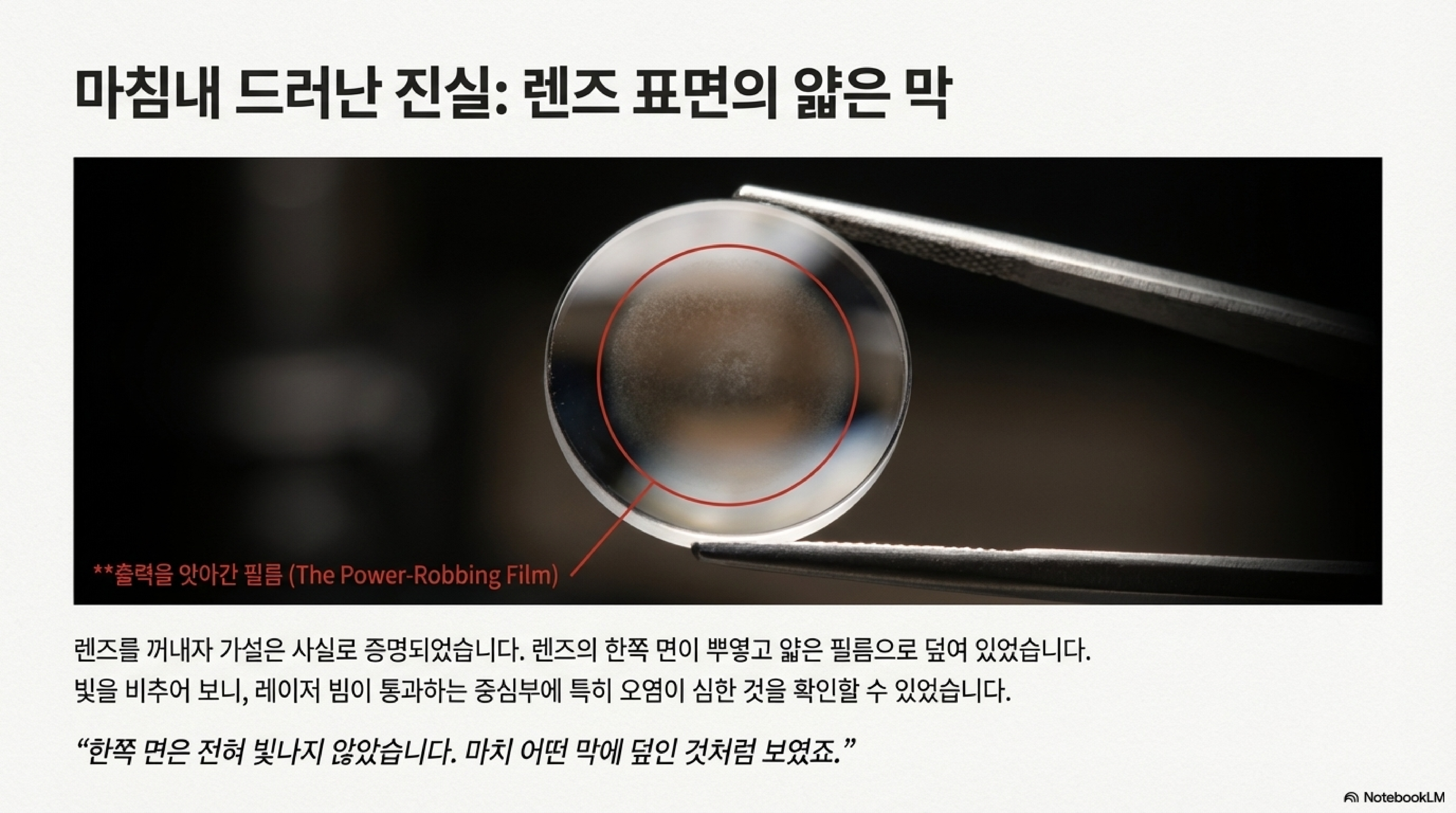 원인을 찾기 위해 렌즈를 분해하여 확인했을 때, 처음에는 아무 문제도 없어 보였습니다. 하지만 빛에 비추어 자세히 살펴보니, 눈에 거의 보이지 않는 얇은 "필름" 같은 막이 렌즈 표면을 덮고 있었습니다. 바로 이것이 레이저 출력을 절반으로 떨어뜨린 주범이었습니다.