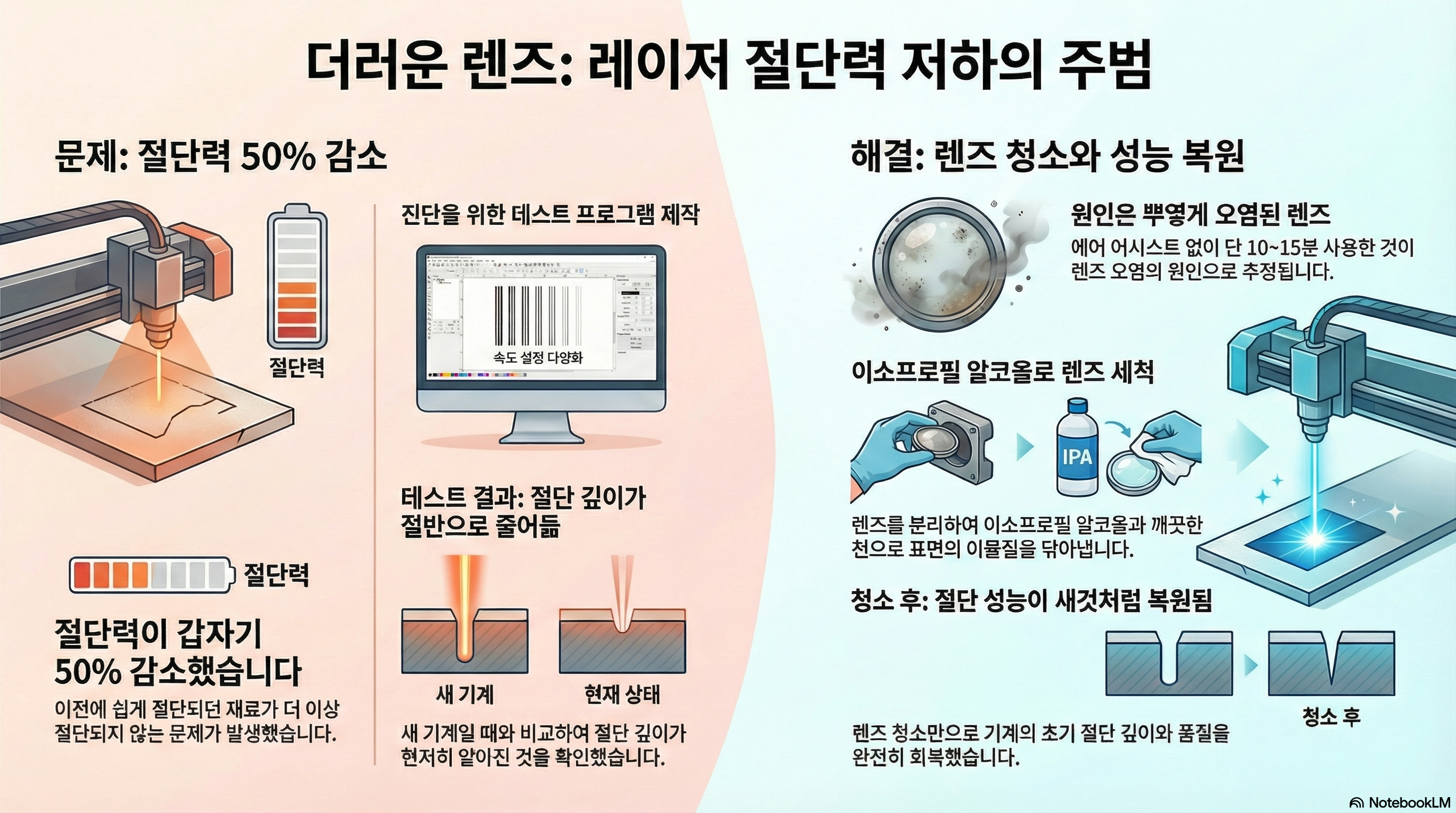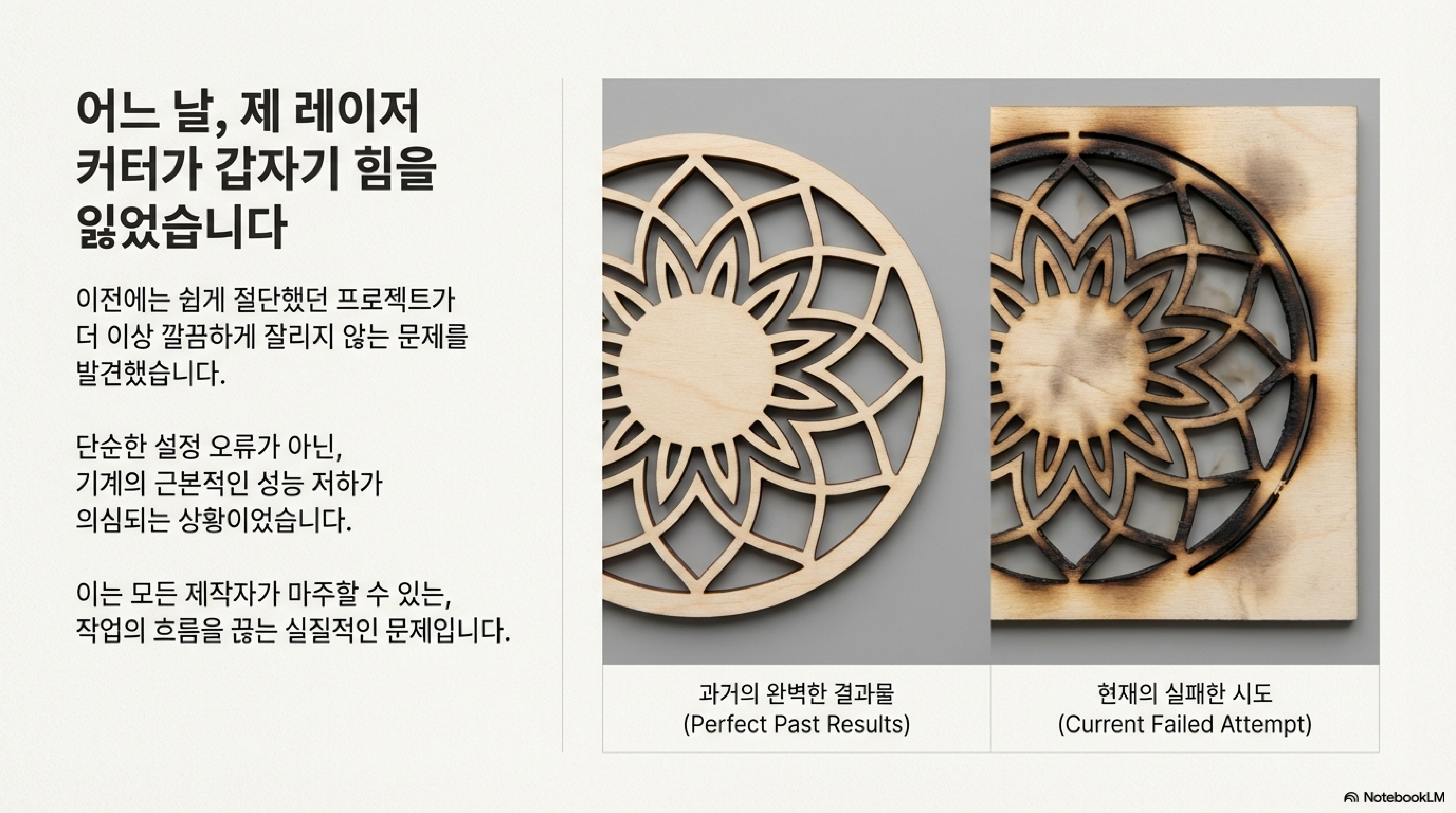 얼마 전까지만 해도 손쉽게 잘라내던 작업이 갑자기 버거워진 경험, 없으신가요? 잘 작동하던 레이저 커터의 출력이 눈에 띄게 약해져 답답한 마음에, 저는 소매를 걷어붙이고 문제의 근원을 파헤쳐 보기로 했습니다. 제가 발견한 것은 바로 눈앞에 숨어 있었고, 이는 모든 메이커가 알아야 할 교훈이었습니다.