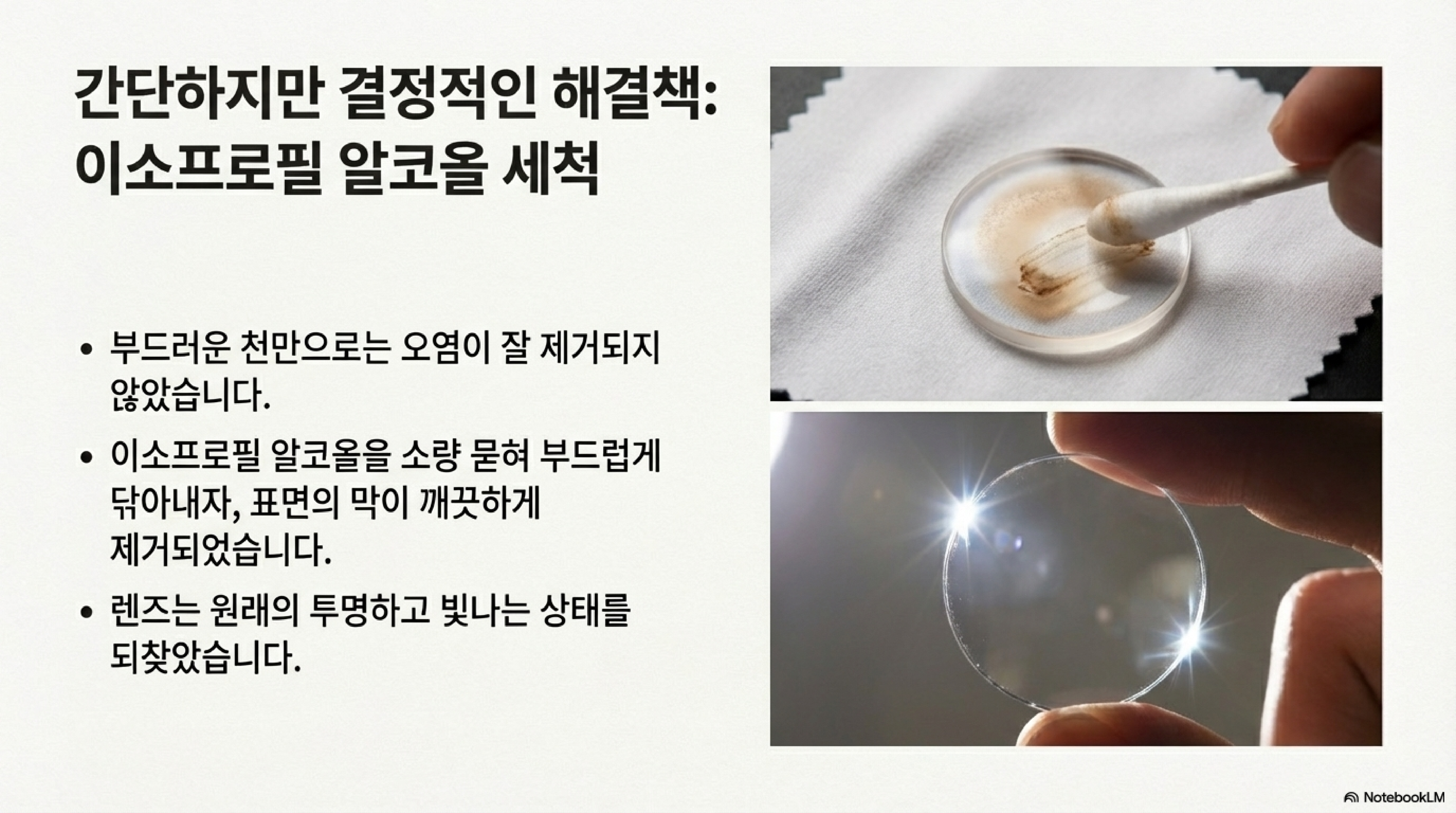 놀랍게도, 이 50%에 달하는 심각한 성능 저하 문제는 이소프로필 알코올(isopropyl alcohol)을 이용한 간단한 렌즈 세척만으로 해결되었습니다. 세척 후 다시 테스트를 진행하자, 성능은 "거의 정상으로 돌아왔습니다." 문제의 심각성에 비해 해결책이 너무나 간단하다는 점이 정말 인상적이었습니다.