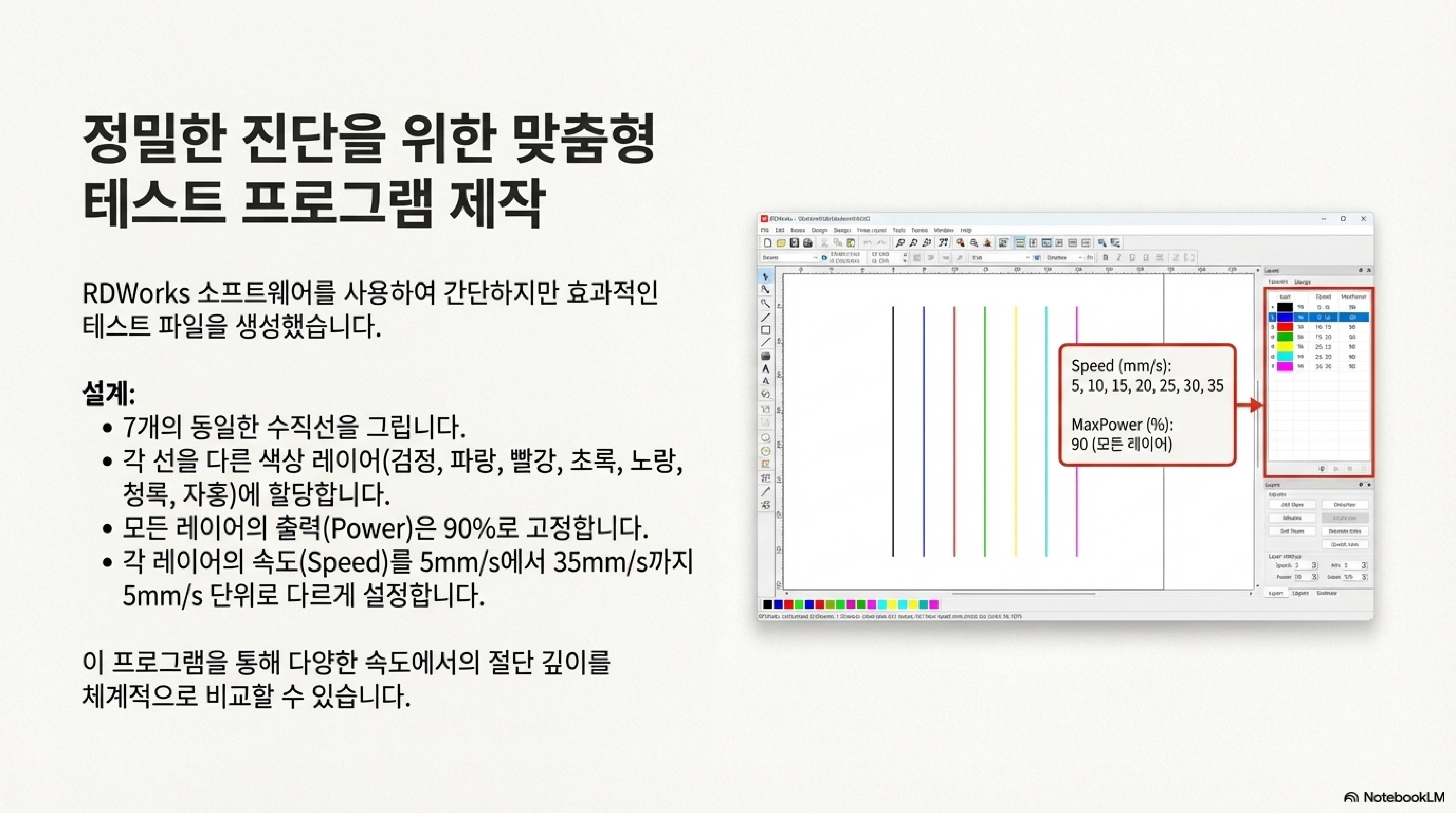 단순히 감에 의존하기보다는, 체계적으로 접근하는 것이 언제나 더 좋은 결과를 가져온다고 생각합니다. 그래서 저는 간단하지만 효과적인 진단 도구를 직접 만들었습니다. 소프트웨어에서 검은색, 파란색, 빨간색 등 각기 다른 색상의 선(레이어)에 5mm/s부터 35mm/s까지 서로 다른 절단 속도를 할당하는 방식이었죠. 이 방법을 통해 기계의 전반적인 '광학 경로의 효율성'을 객관적인 수치로 명확하게 확인할 수 있었습니다.