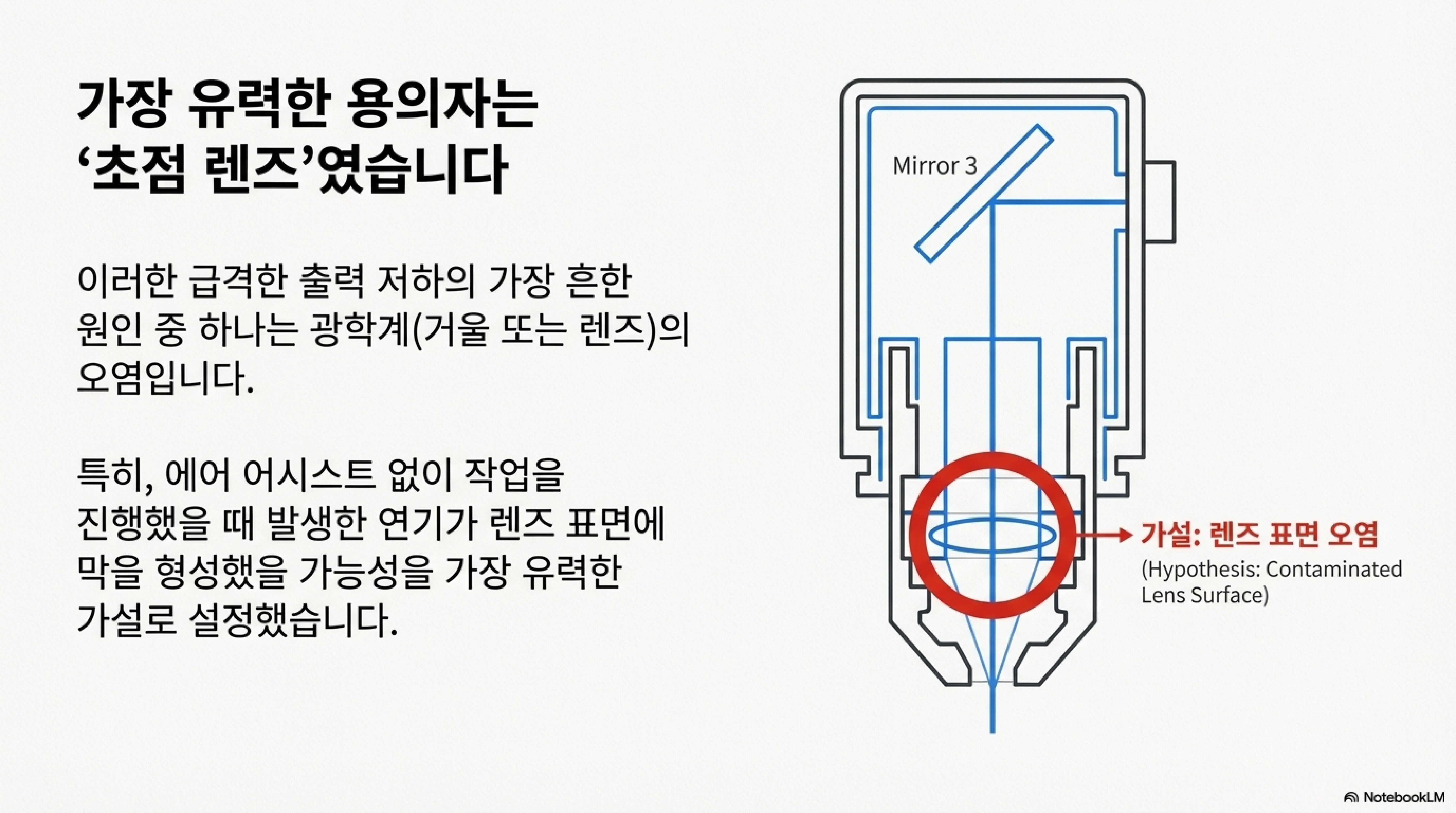 원인을 찾기 위해 렌즈를 분해하여 확인했을 때, 처음에는 아무 문제도 없어 보였습니다. 하지만 빛에 비추어 자세히 살펴보니, 눈에 거의 보이지 않는 얇은 "필름" 같은 막이 렌즈 표면을 덮고 있었습니다. 바로 이것이 레이저 출력을 절반으로 떨어뜨린 주범이었습니다.