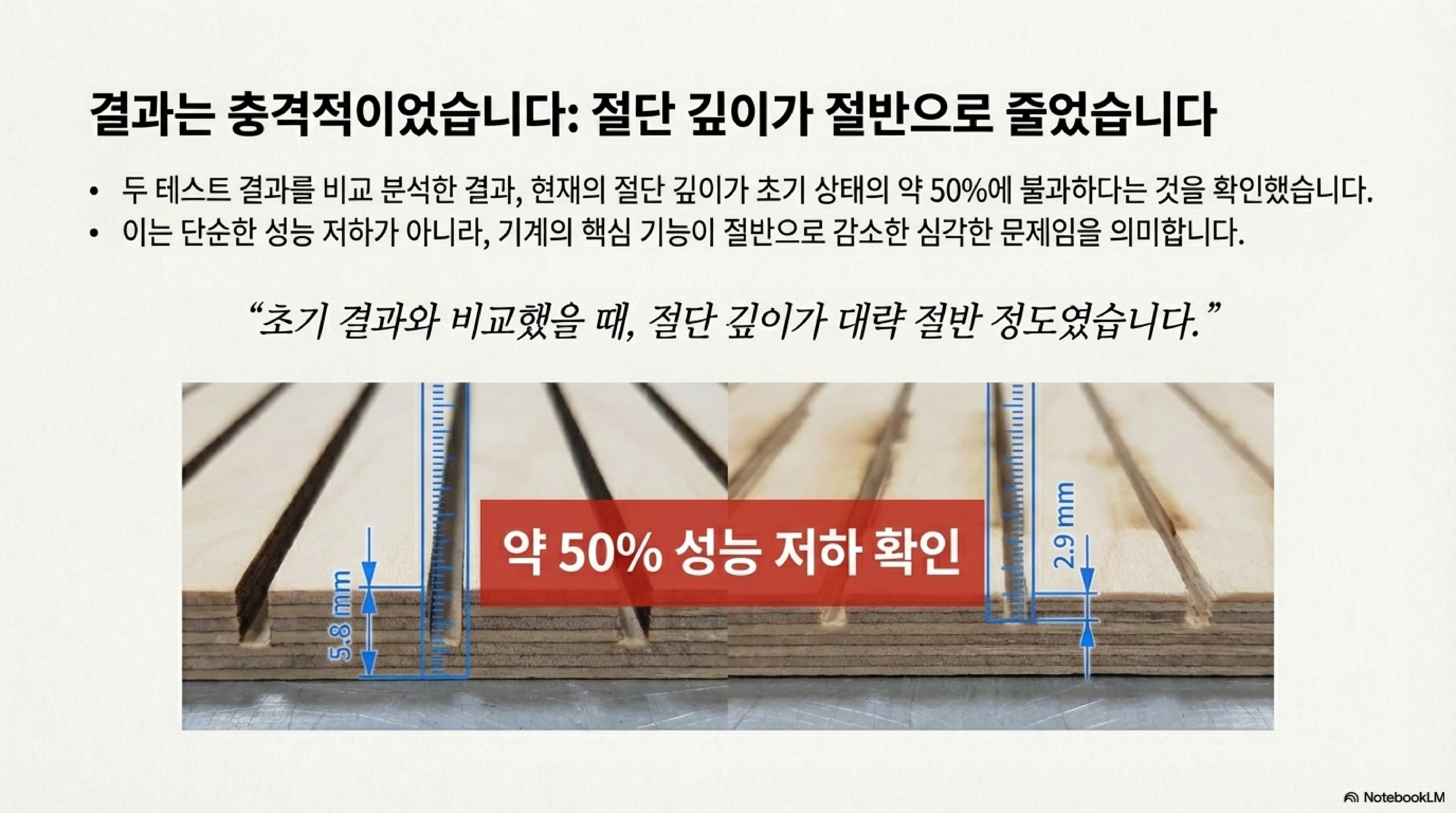 문제의 시작은 이전에는 쉽게 절단했던 프로젝트를 기계가 더 이상 처리하지 못하는 것을 발견하면서부터였습니다. 뭔가 잘못되었다는 직감이 들어, 기계가 새것이었을 때와 동일한 조건으로 간단한 성능 테스트를 진행했습니다. 그 결과는 충격적이었습니다. 절단 깊이가 초기 성능의 "약 절반" 수준으로 급감해 있었습니다.