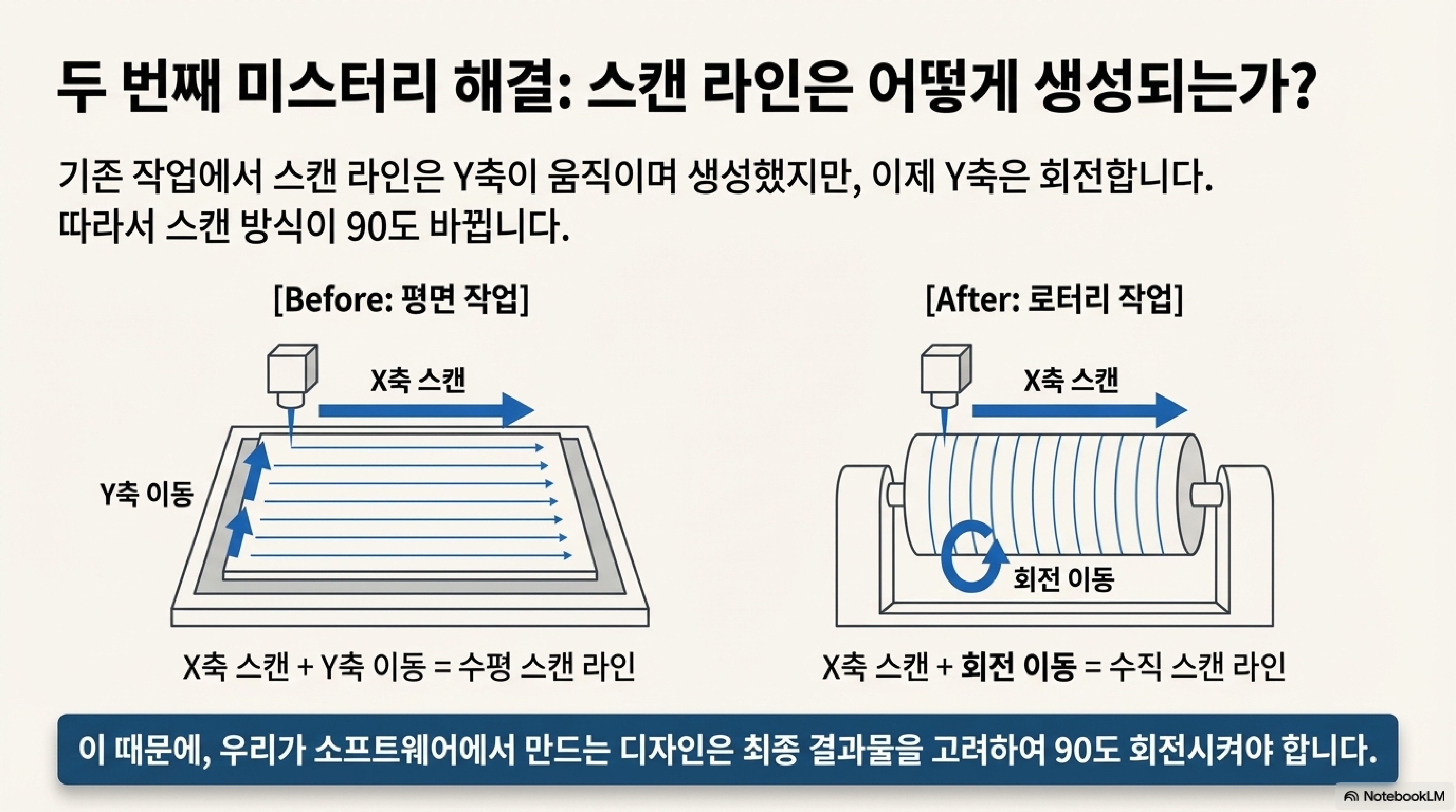 여기서 결정적인 결론이 나옵니다. 디자인이 원통을 따라 올바르게 감싸도록 만들려면, 프로그램의 디자인 파일 자체를 평평한 표면에 작업할 때와는 다르게 90도 회전시켜야 합니다. 이것은 프로그램을 작성하기 전에 반드시 이해해야 하는 핵심 개념입니다. 생각을 바꾸면 쉽습니다. 원통의 표면을 벗겨내 평평한 종이처럼 펼쳤다고 상상해 보세요. 레이저는 이제 가로 줄이 아닌 세로 줄을 따라 색칠하는 것과 같습니다.