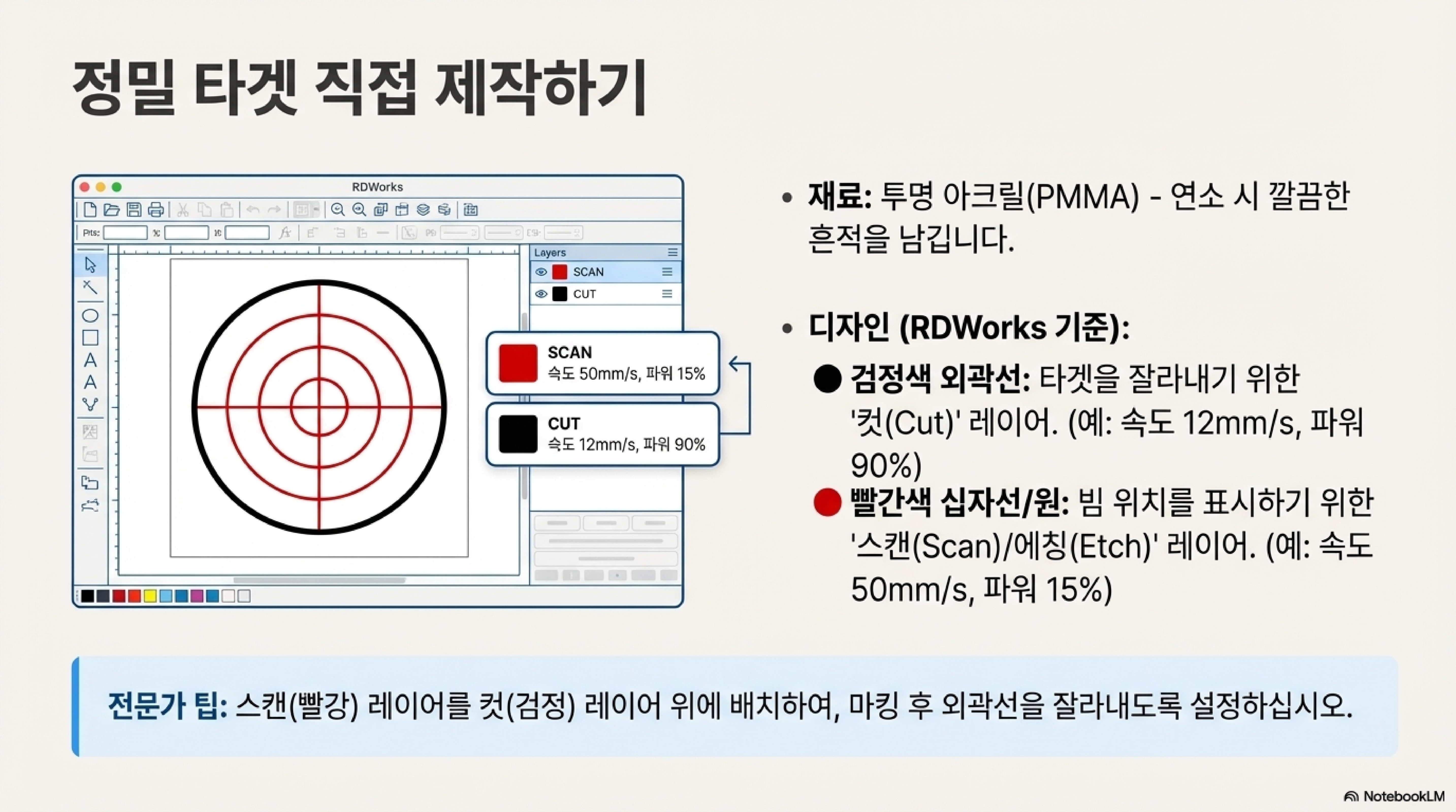 - 레이어 설정: RDWorks에서 레이어를 분리합니다. 빨간색 선(십자선, 동심원)은 낮은 파워로 표면에 자국만 남기는 '에칭'으로, 검은색 외곽선은 높은 파워로 잘라내는 '컷팅'으로 설정합니다.