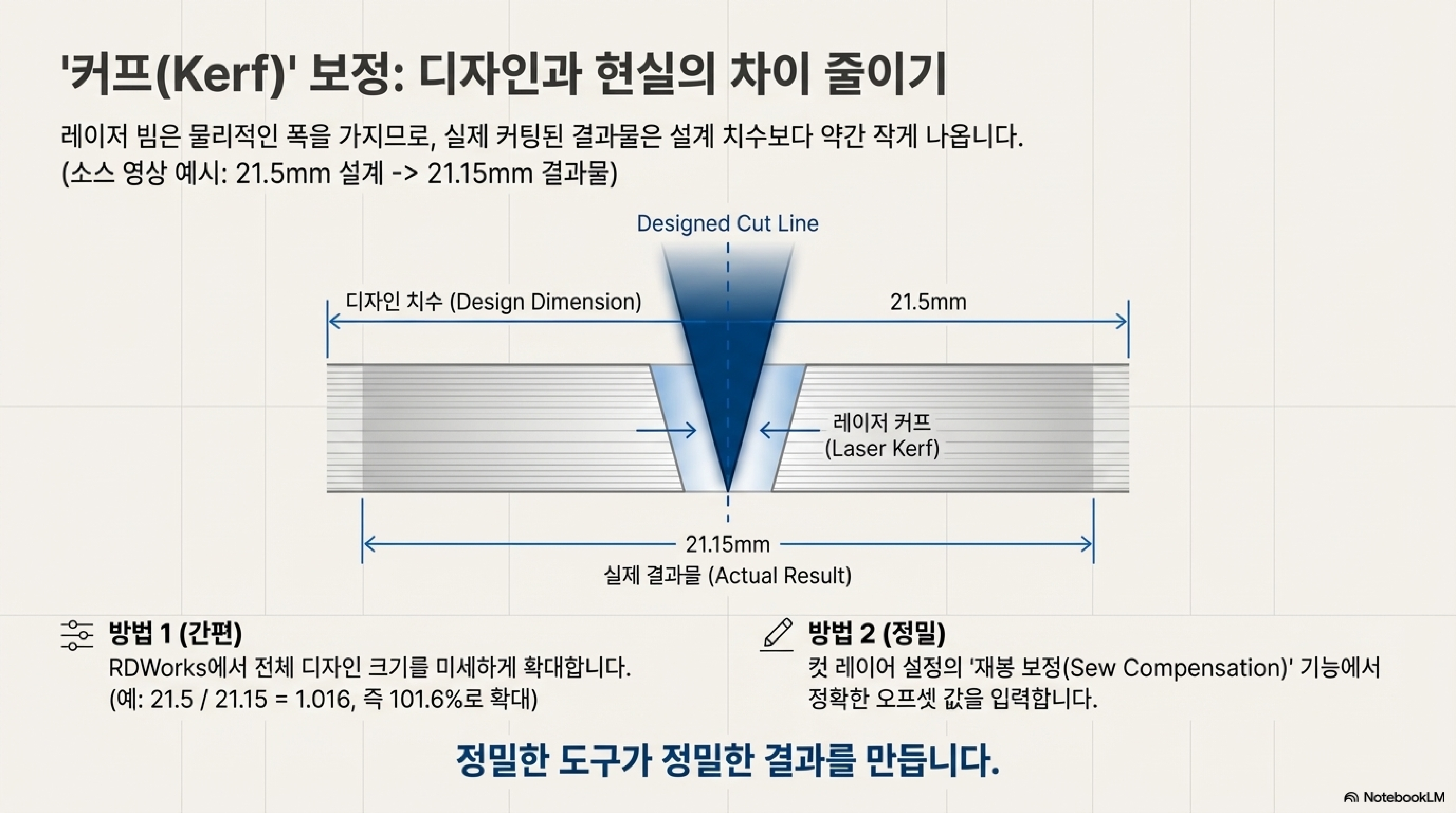 전문가 수준의 정밀도를 원한다면 한 단계 더 나아가야 합니다. 소프트웨어에서 21.5mm로 설계한 원이 실제로는 21.15mm로 잘리는 것처럼, 설계 치수와 실제 결과물 사이에는 미세한 오차가 발생합니다. 이는 레이저 빔 자체가 가진 폭, 즉 '커프(kerf)' 때문입니다. 이 오차를 보정하는 두 가지 방법이 있습니다.