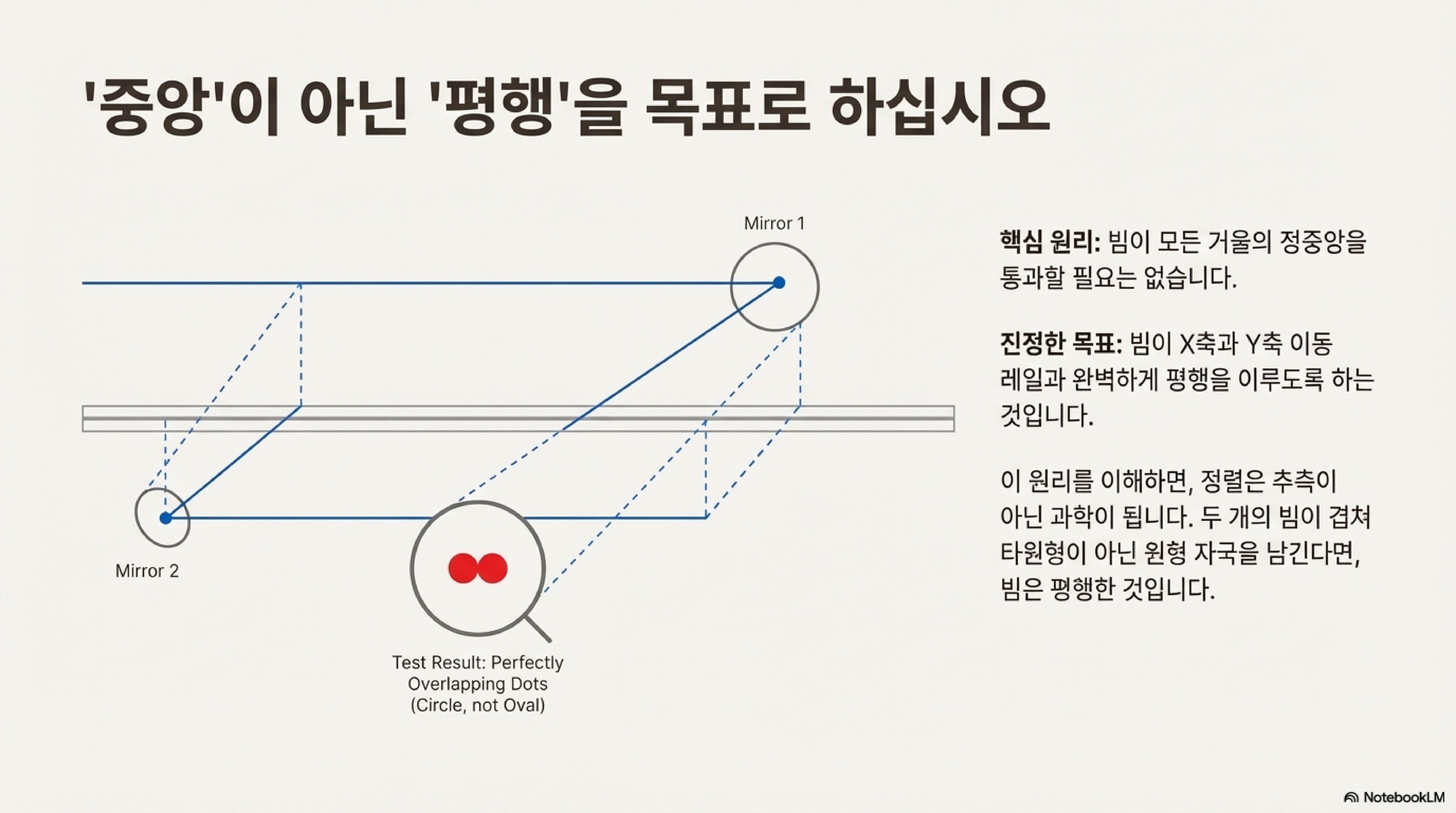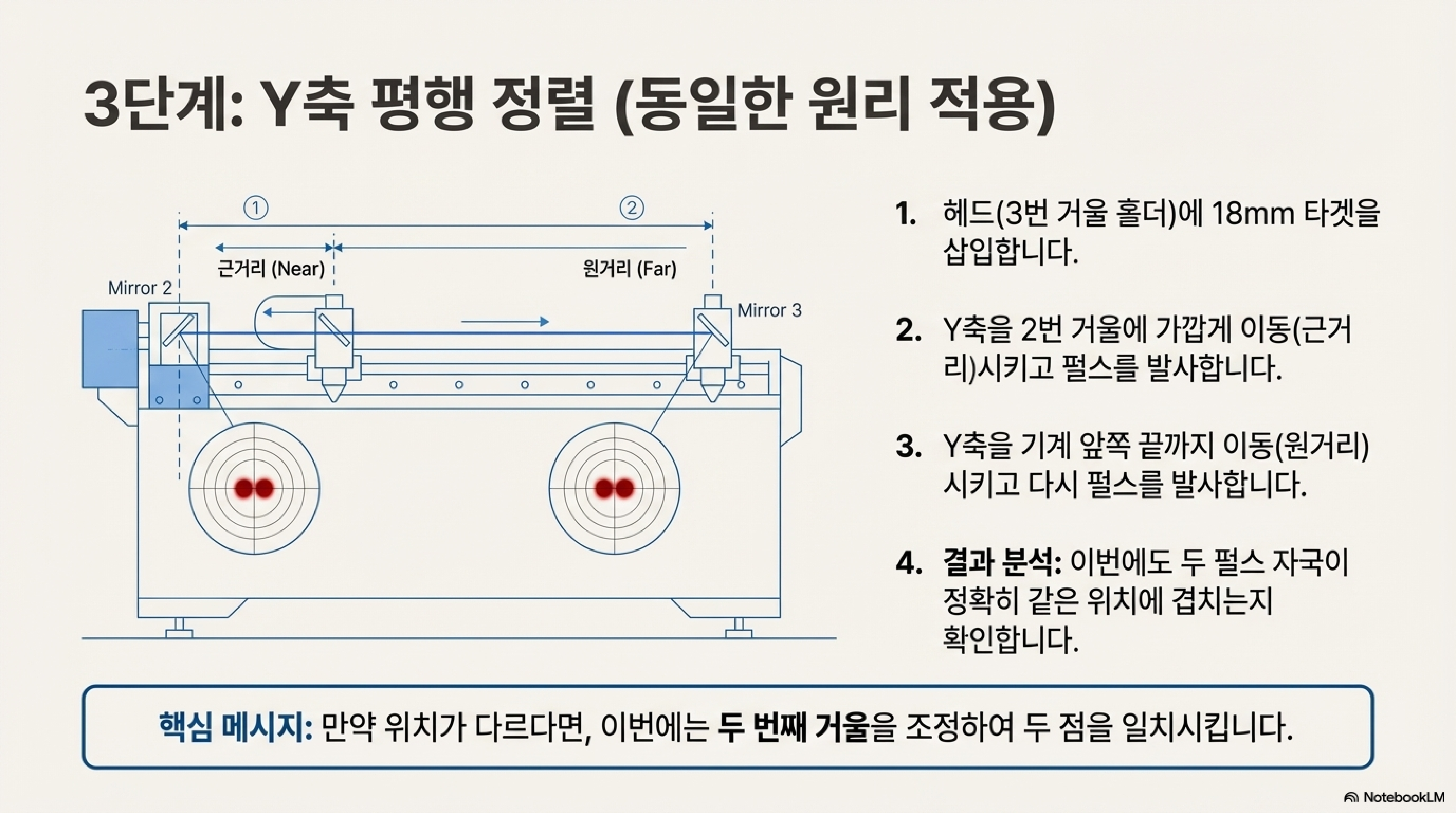 미러 정렬에 대한 가장 큰 오해는 레이저 빔을 반드시 거울의 '정중앙'에 맞춰야 한다는 생각입니다. 하지만 이것은 잘못된 목표입니다. 정렬의 진짜 목표는 빔이 X축과 Y축 레일을 따라 이동할 때, 축과 완벽하게 '평행'을 유지하도록 만드는 것입니다.