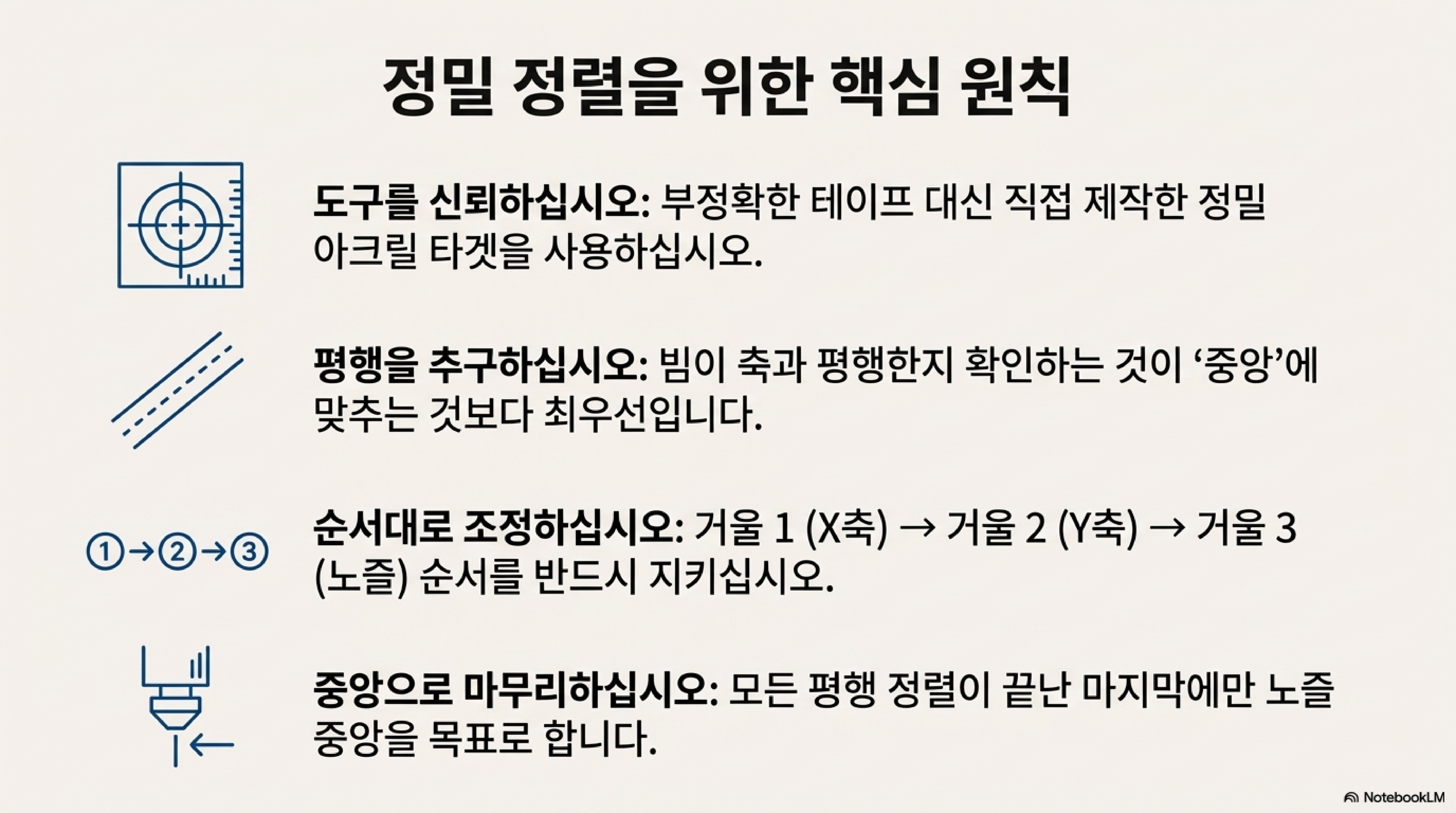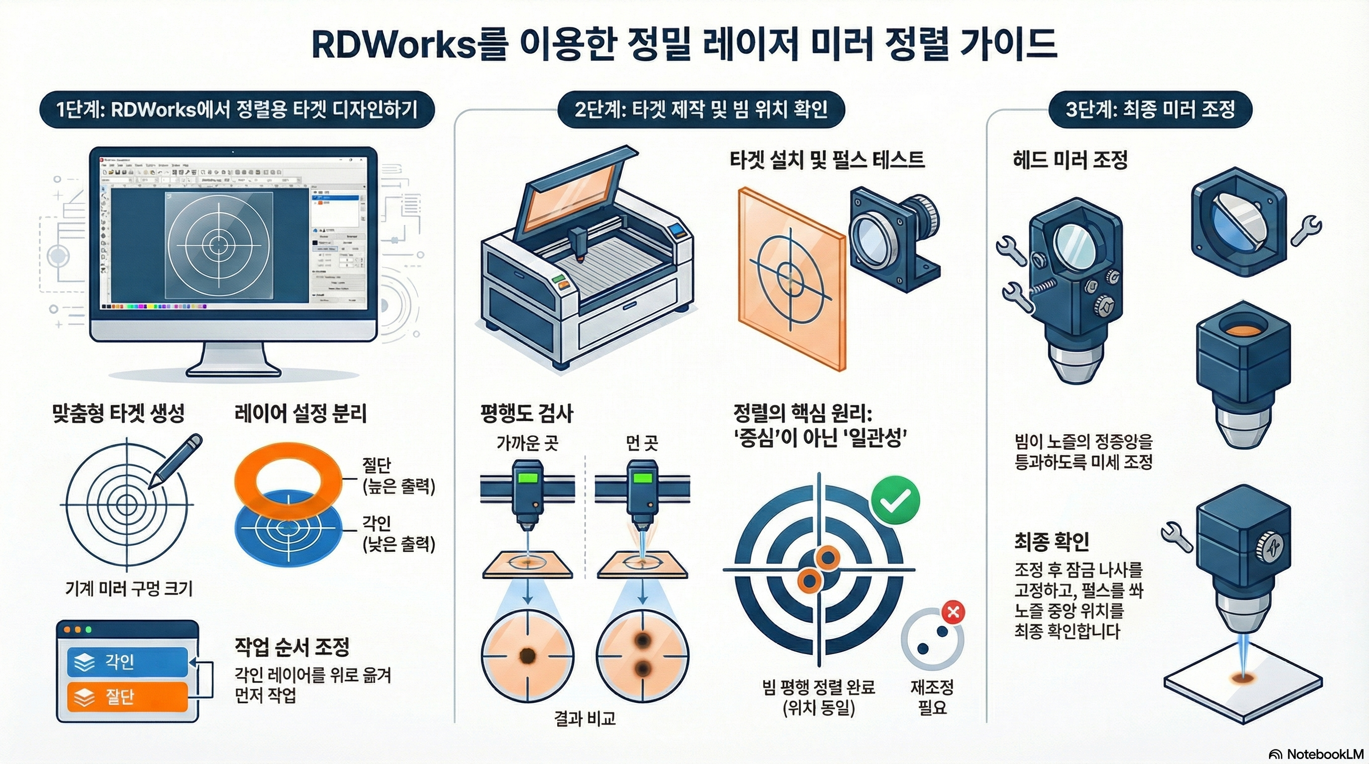 레이저 커터 미러 정렬의 핵심은 불친절한 매뉴얼을 맹목적으로 따르는 것이 아니라, '왜' 그렇게 해야 하는지 근본 원리를 이해하는 데 있습니다. '중심'이라는 함정에서 벗어나 '평행'이라는 진짜 목표를 인지하고, 레이저 커터라는 최고의 도구를 활용해 스스로 문제를 해결하는 것. 이것이 바로 오늘 우리가 함께 탐구한 비밀입니다.
