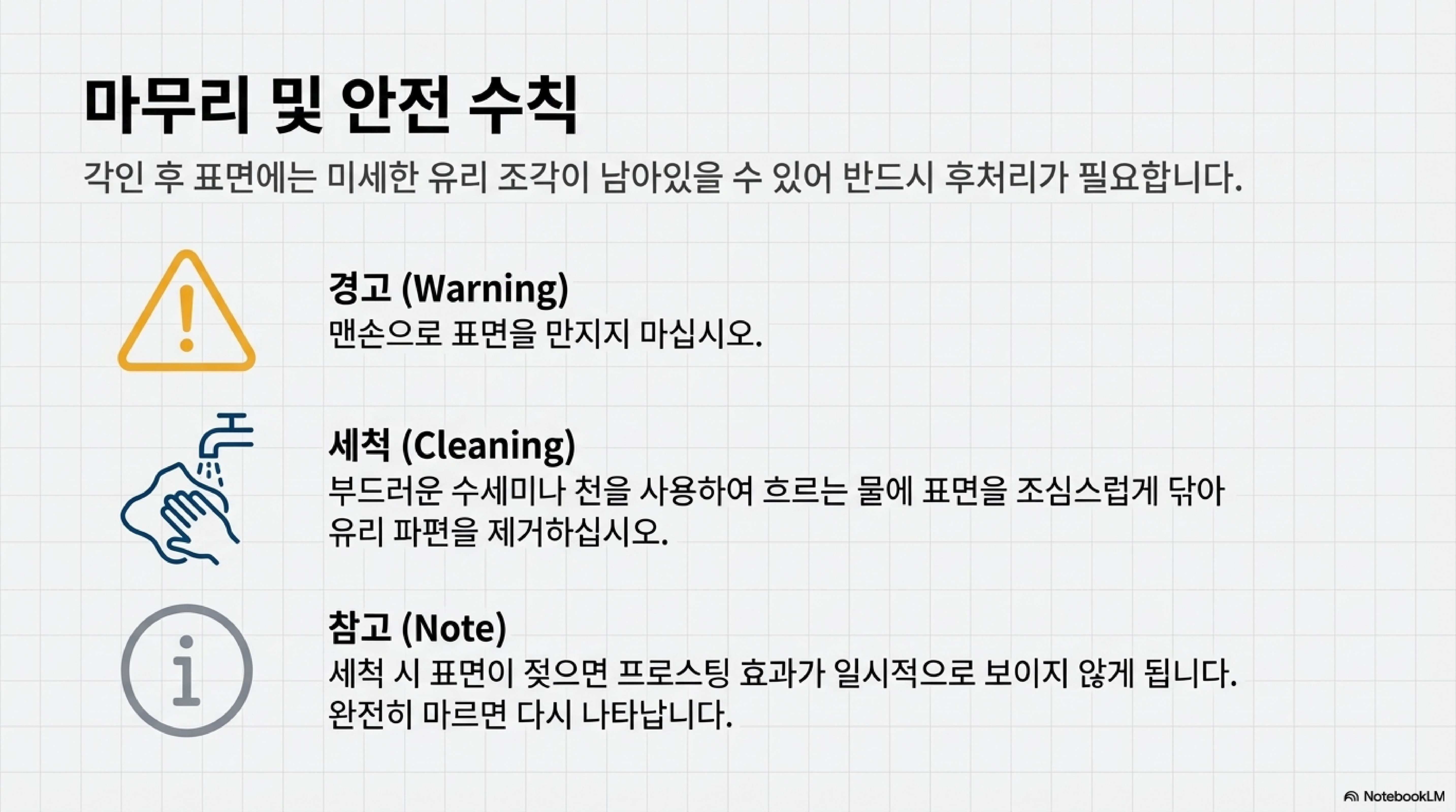 각인 직후 표면을 만져보면 마치 미세한 유리 조각들이 붙어있는 듯한 거친 느낌이 듭니다. 보기에는 아름답지만, 이 상태는 안전하지 않으므로 반드시 조심스럽게 다루어야 합니다.