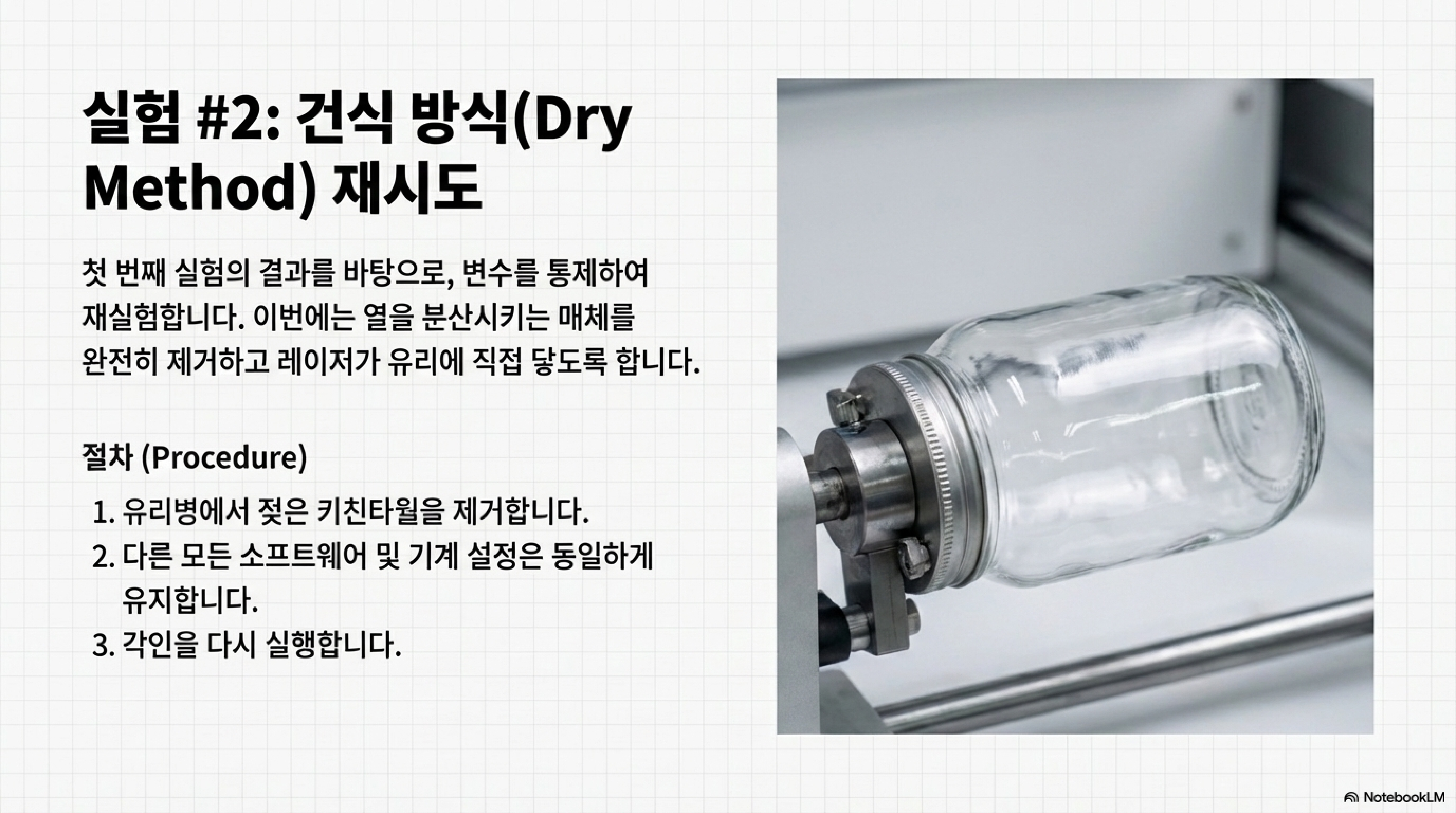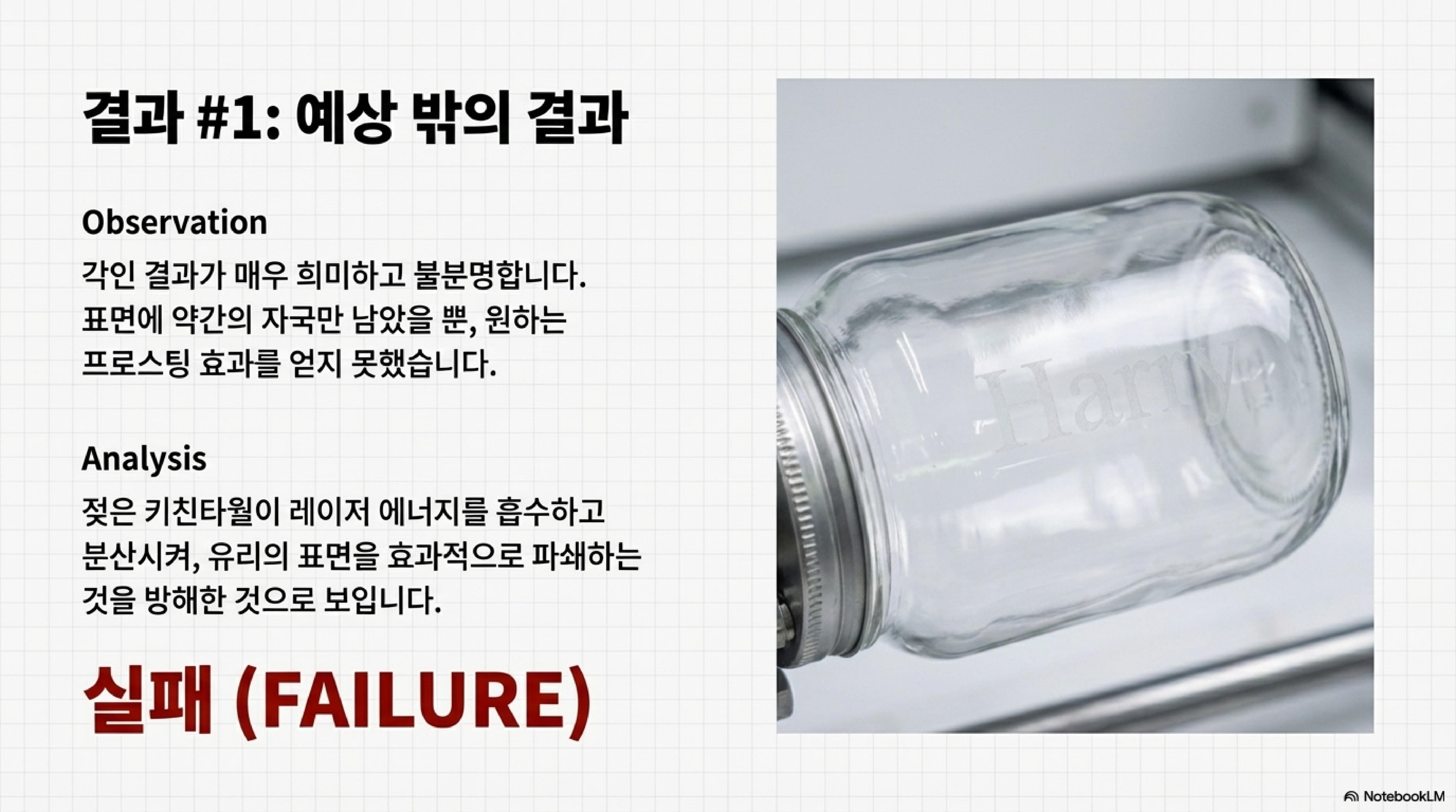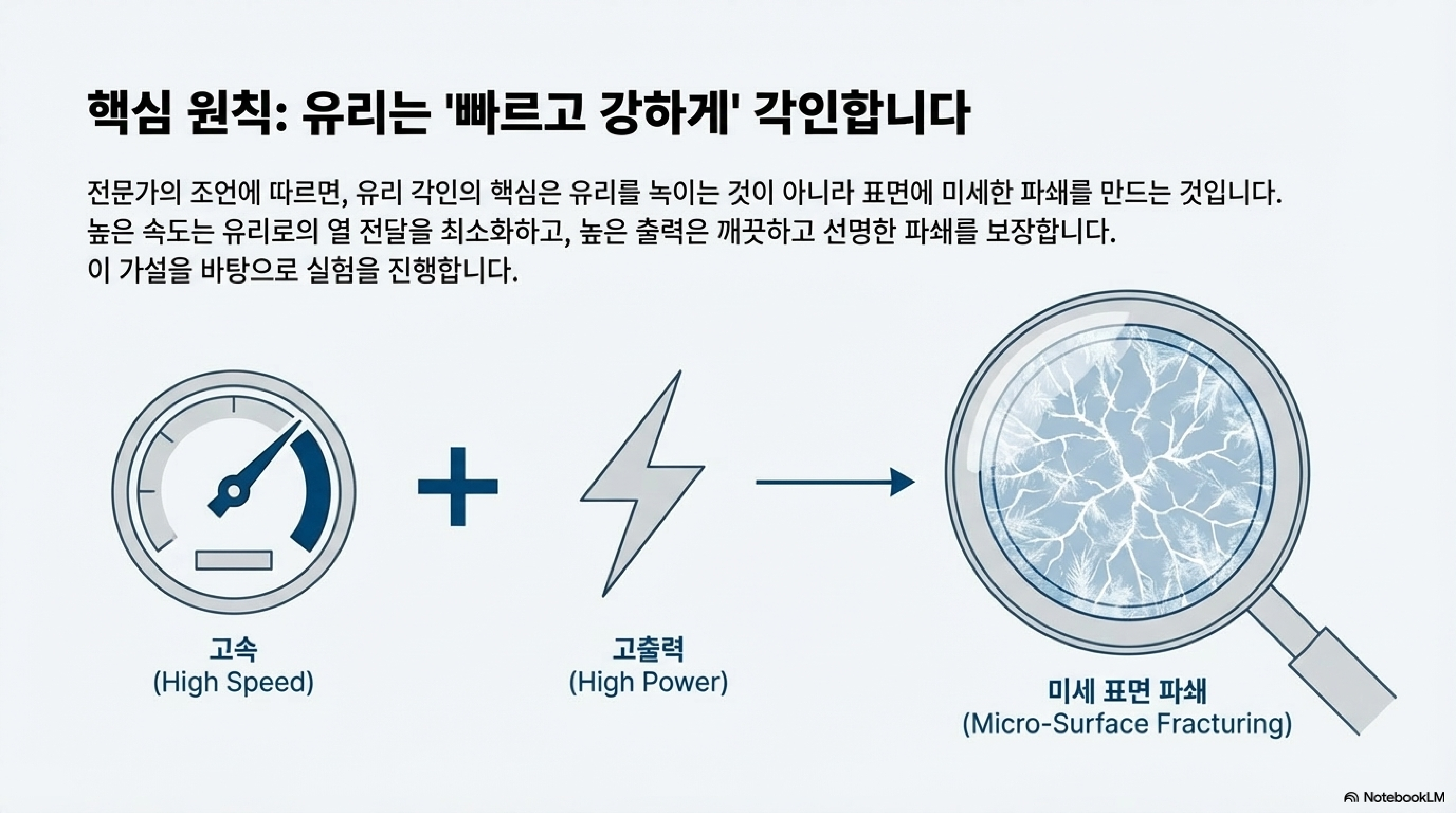 그렇다면 이 '황금률'은 왜 실패했을까요? 제 가설은 이렇습니다. 젖은 종이타월이 유리를 식히는 역할을 하는 동시에, 레이저 에너지의 상당 부분을 흡수해 버렸기 때문일 겁니다. 강력하고 날카로운 충격이 필요한데, 에너지가 분산되면서 표면에 희미한 자국만 남긴 것이죠. 좋은 의도의 과정이 오히려 핵심 원리를 방해한 셈입니다.