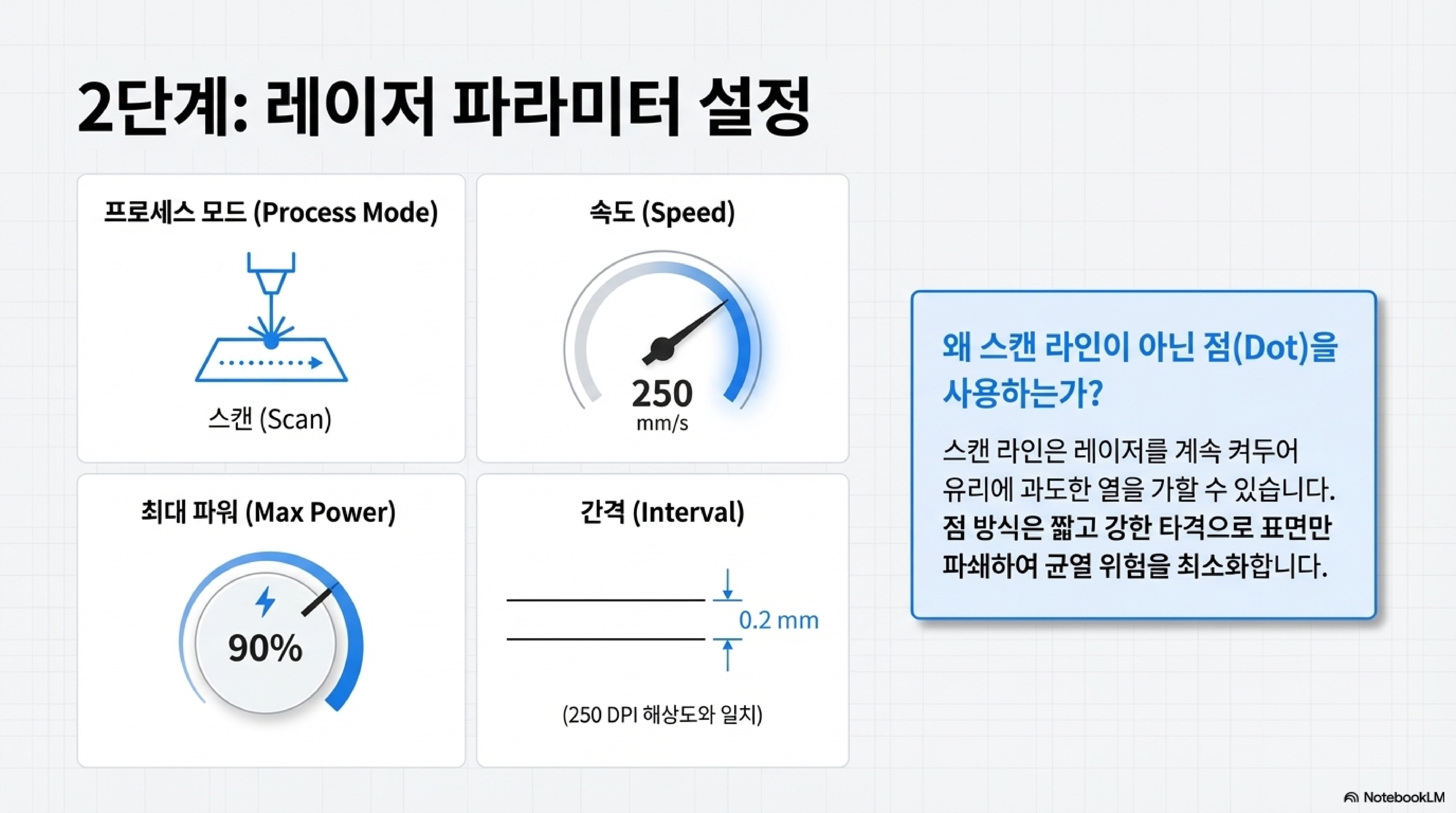 레이저 유리 각인의 가장 중요한 철학은 "빠르고 강하게 치는 것(hit it fast and hit it hard)"입니다. 이번 실험에서 성공적인 결과를 이끌어낸 핵심 설정은 다음과 같습니다.
