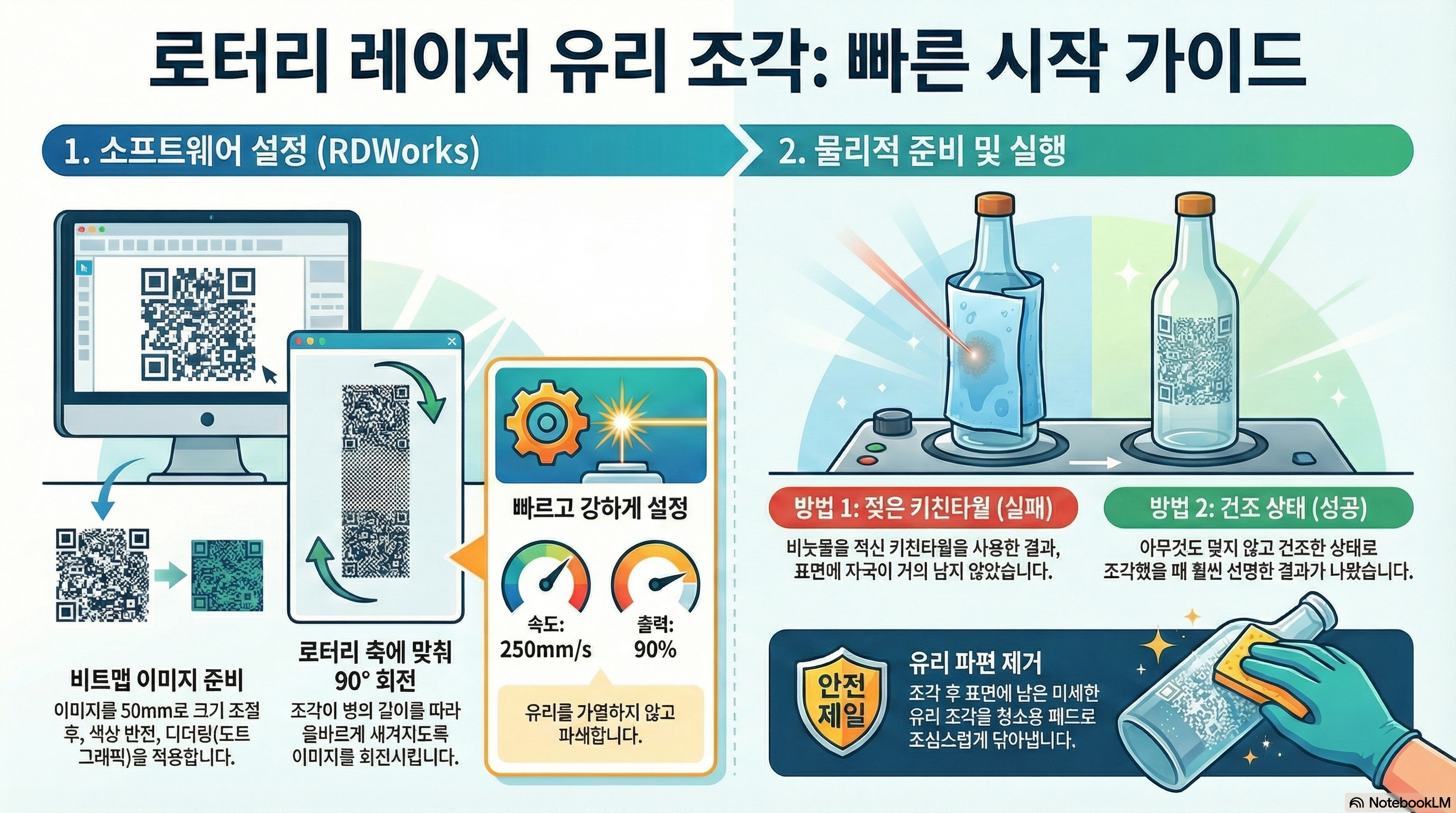 레이저 유리 각인에 도전해 본 분이라면 누구나 유리가 산산조각 날까 봐 걱정했던 경험이 있을 겁니다. 그 섬세함과 아름다움만큼이나 다루기 까다로운 소재이기 때문이죠. 그래서 우리 대부분은 온라인에서 '황금률'처럼 여겨지는 젖은 종이타월 기법을 사용하곤 합니다. 유리를 차갑게 유지해 파손을 막는다는 논리입니다. 하지만 만약 그 방법이 사실은 최선이 아니라면 어떨까요? 제가 직접 진행한 실험에서 얻은 놀랍고도 반가운 발견을 공유합니다.