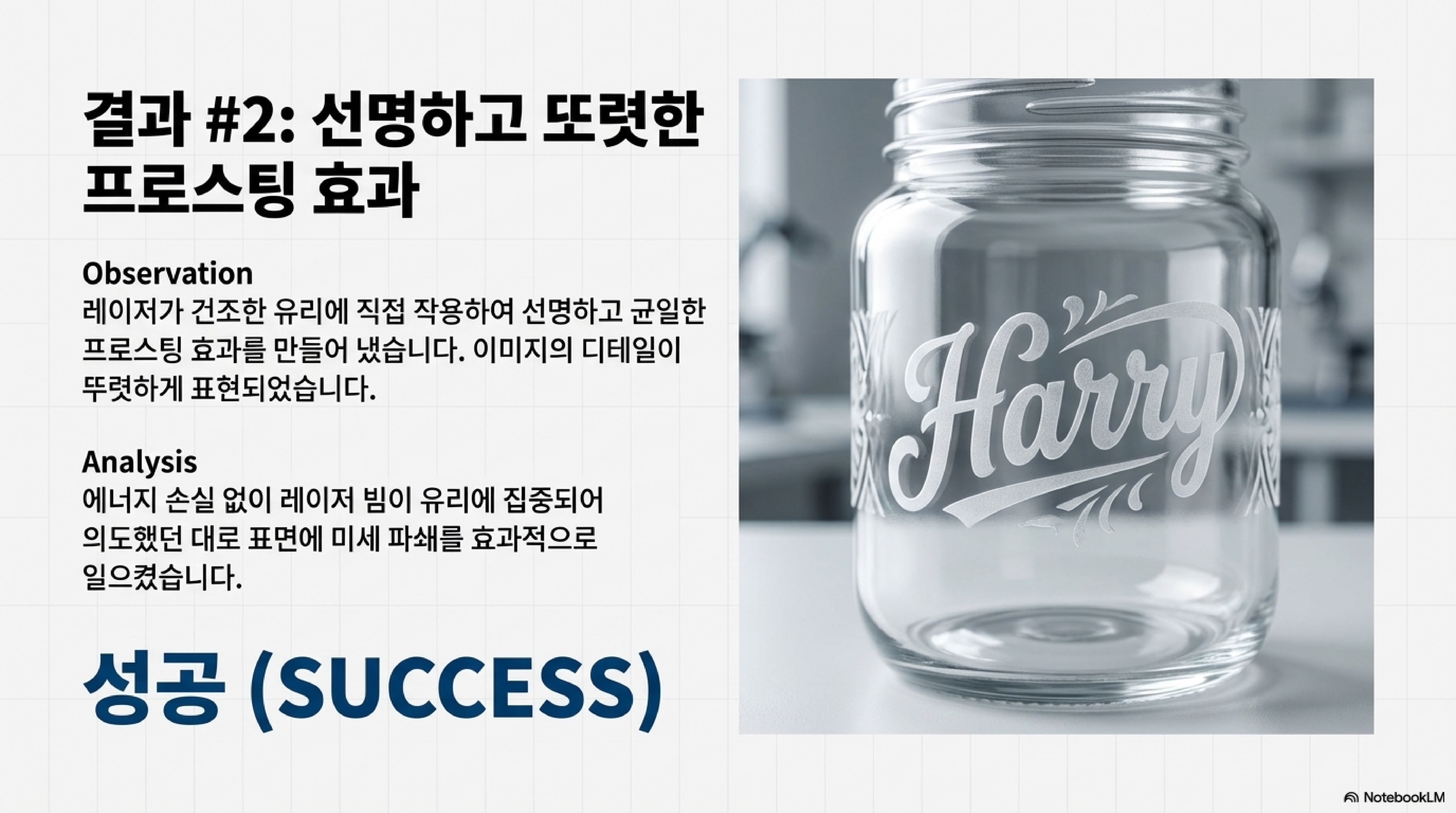 그렇다면 이 '황금률'은 왜 실패했을까요? 제 가설은 이렇습니다. 젖은 종이타월이 유리를 식히는 역할을 하는 동시에, 레이저 에너지의 상당 부분을 흡수해 버렸기 때문일 겁니다. 강력하고 날카로운 충격이 필요한데, 에너지가 분산되면서 표면에 희미한 자국만 남긴 것이죠. 좋은 의도의 과정이 오히려 핵심 원리를 방해한 셈입니다.