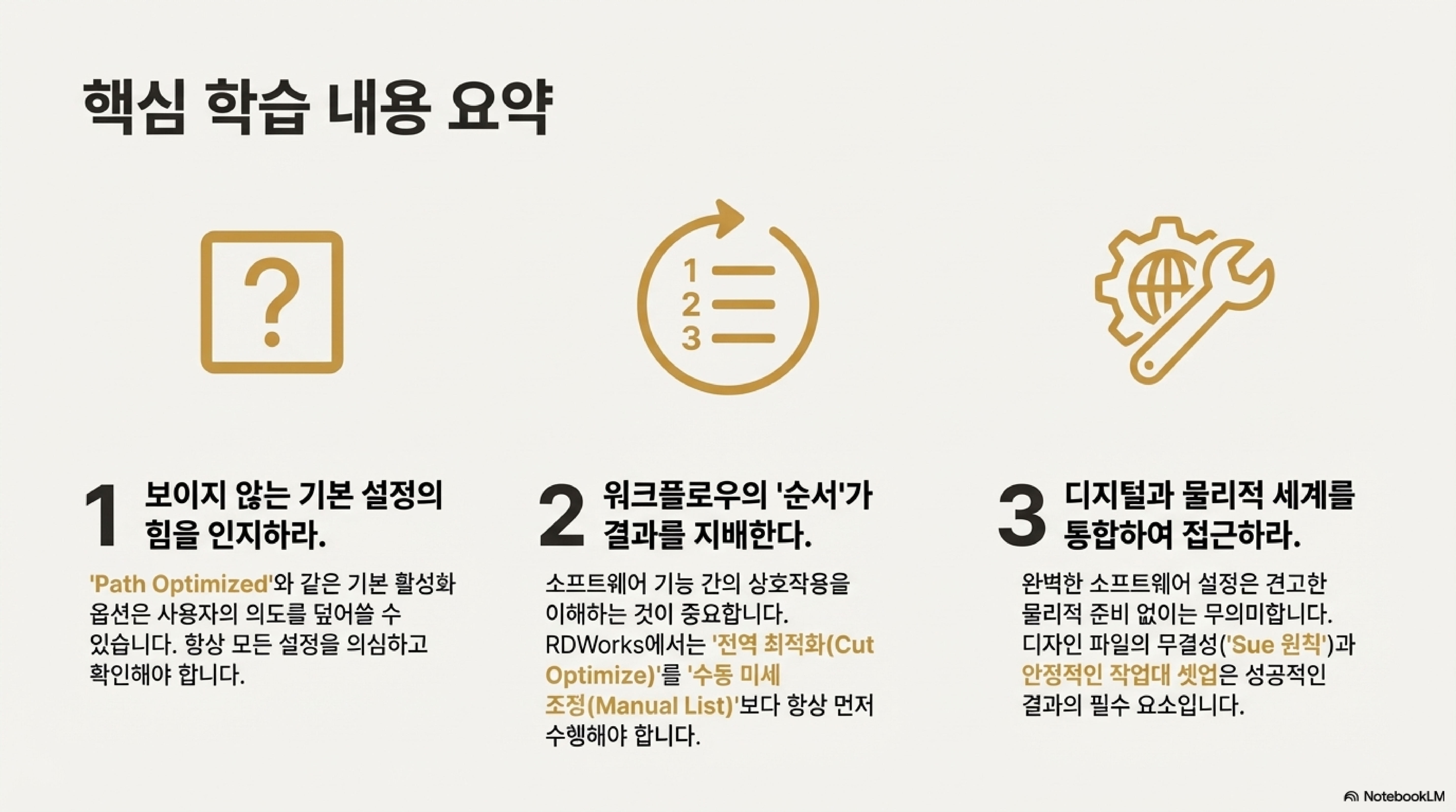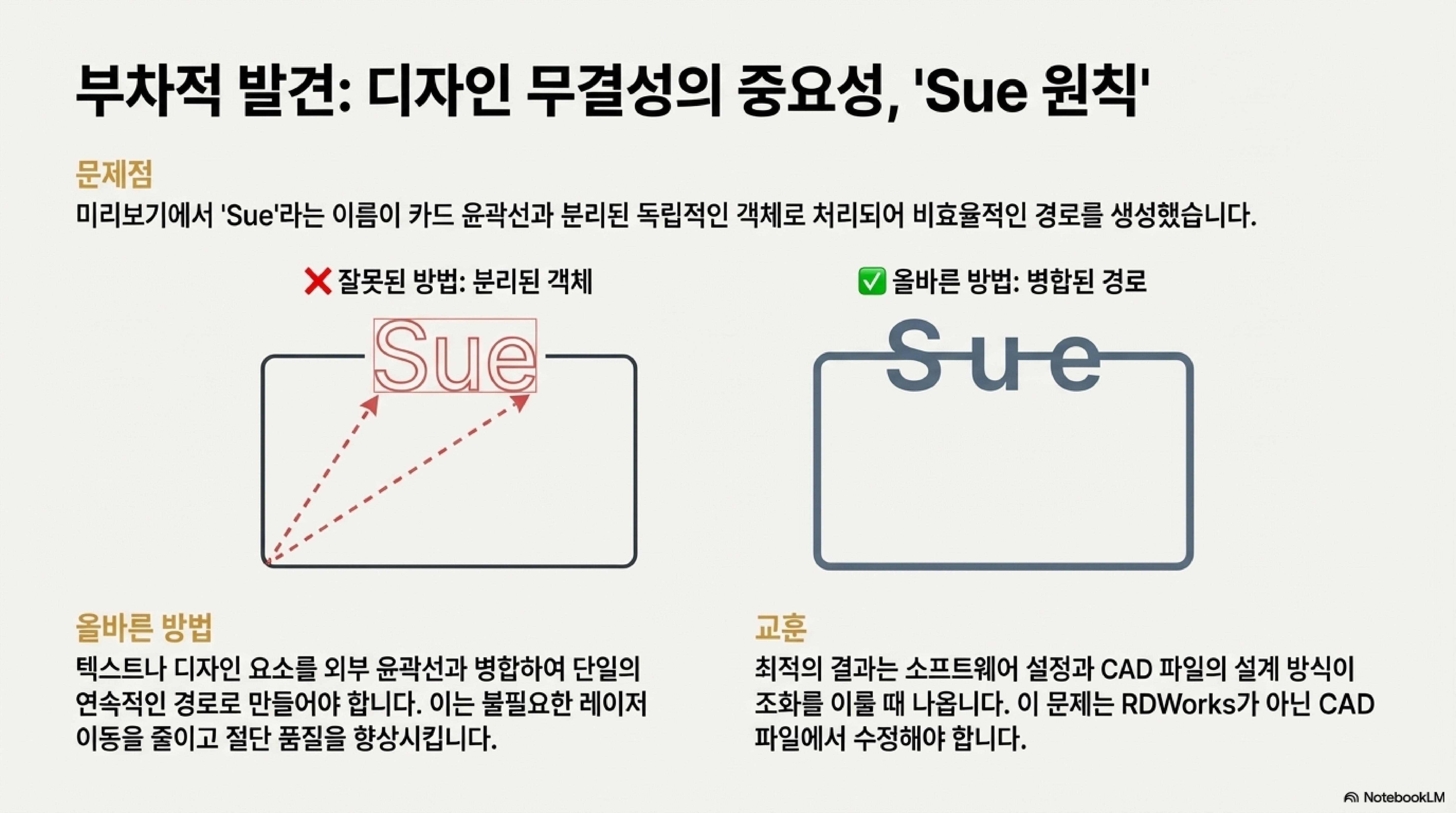 범인은 바로 RDWorks의 'Path optimized' (경로 최적화)라고 표시된 작고 눈에 띄지 않는 체크박스였습니다. 이 옵션은 기본적으로 켜져 있으며, 사용자가 수동으로 설정한 절단 순서를 무시하고 자체적으로 경로를 최적화합니다. 이 체크박스를 해제하는 것이 제어권을 되찾기 위한 첫 번째 핵심 열쇠였습니다.