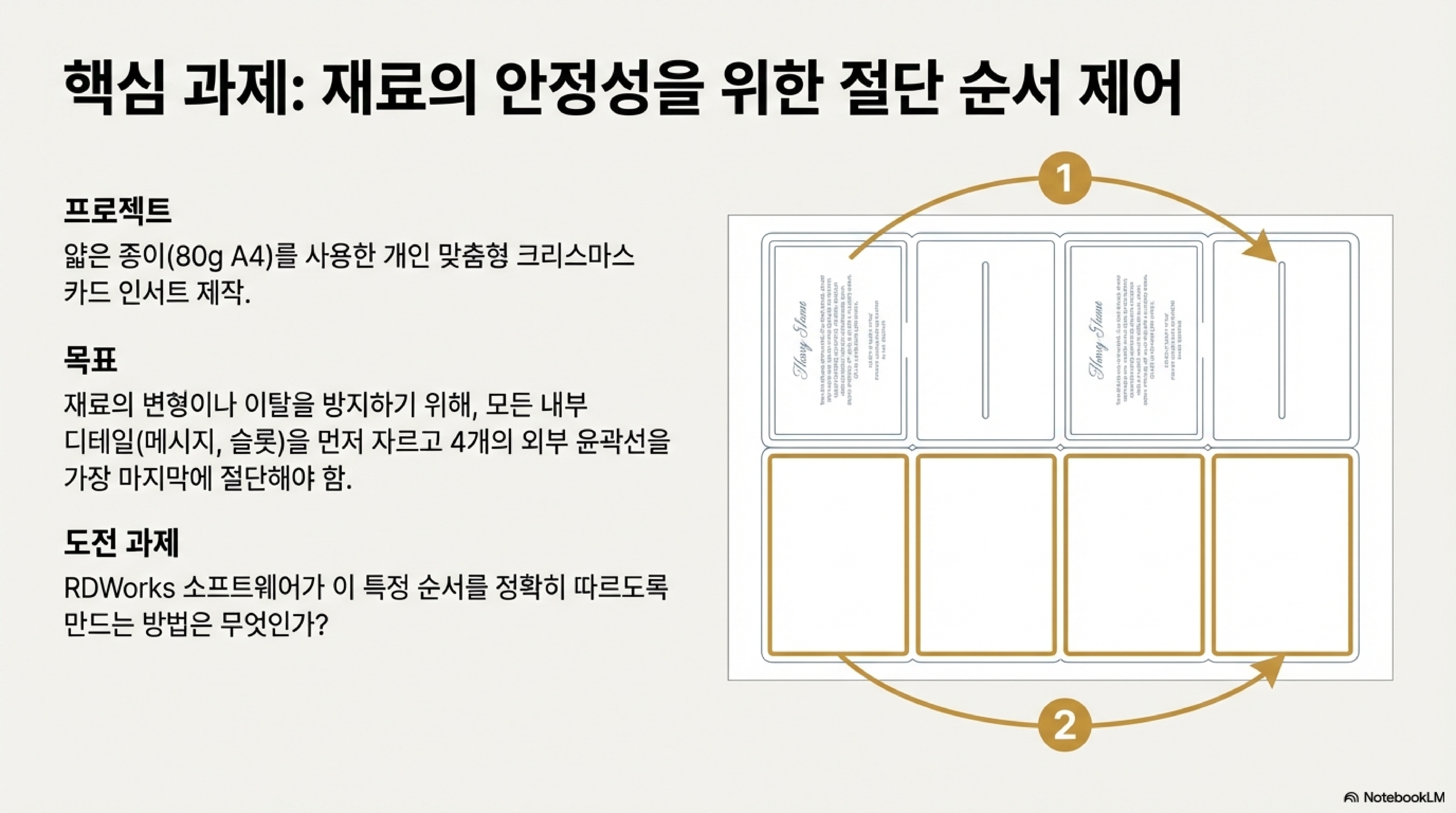 정교한 기계가 명백한 지시를 따르지 않을 때 메이커들이 겪는 답답함은 누구나 공감할 것입니다. 재료와 시간을 절약하기 위해 완벽한 절단 순서를 세심하게 계획했지만, 기계는 제멋대로 움직입니다. 이 문제는 얇은 A4 용지 한 장에서 네 개의 섬세한 크리스마스 카드 속지를 만드는 프로젝트를 진행하던 중 발생했습니다. 종이의 구조적 안정성을 마지막 순간까지 유지하려면 절단 순서가 무엇보다 중요했습니다. 하지만 이 간단한 목표는 RDWorks의 혼란스러운 경로 제어 세계를 깊이 파고드는 계기가 되었고, 그 과정에서 몇 가지 놀라운 발견을 하게 되었습니다.