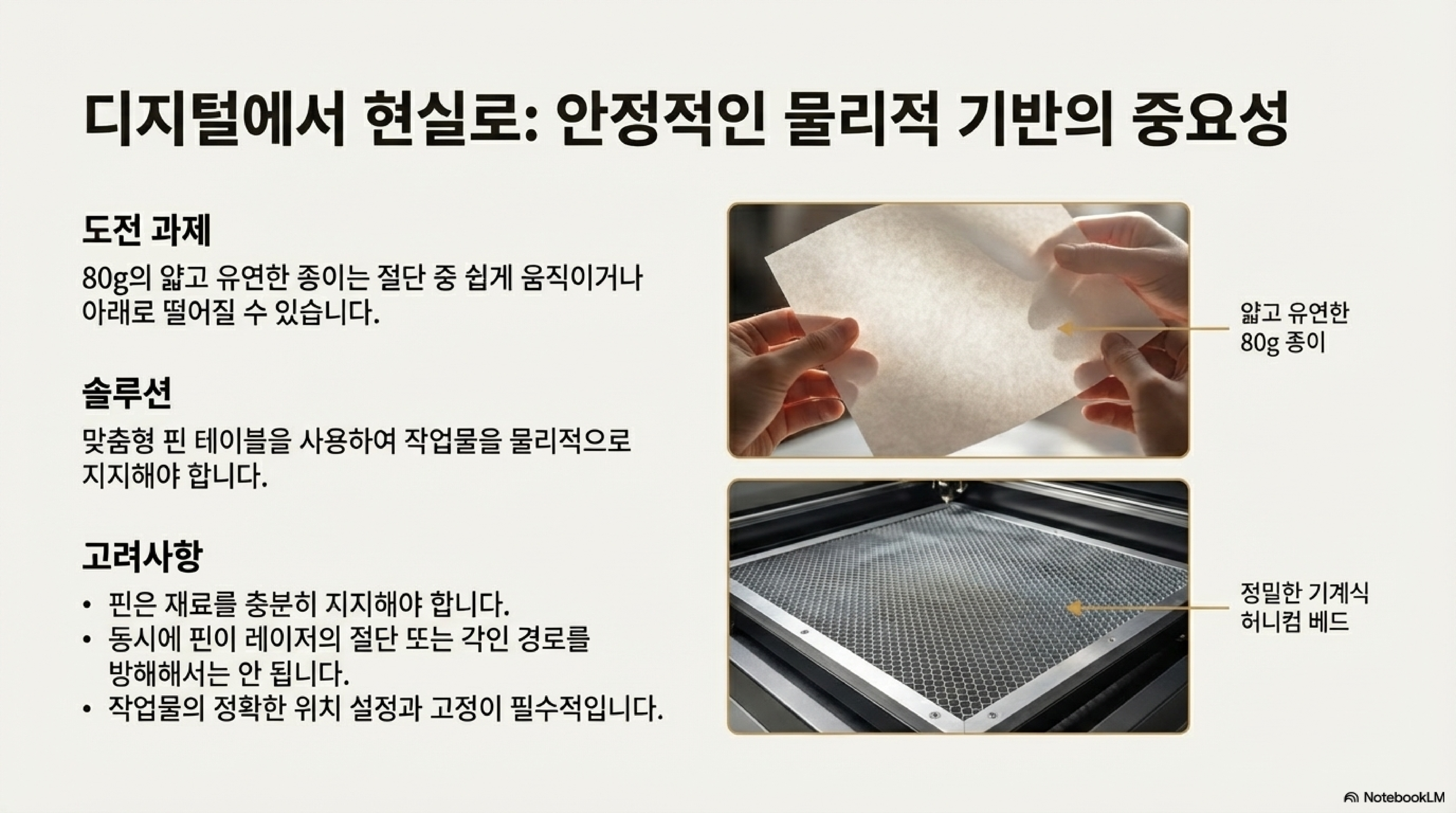 첫 번째 목표는 명확했습니다. 얇은 A4 용지 한 장에서 네 개의 속지를 잘라내야 했기 때문에, 모든 내부 패턴과 글자를 먼저 자르고 네 개의 주요 외곽선은 맨 마지막에 잘라내야 했습니다. 그래야만 마지막 절단이 끝날 때까지 종이 전체가 튼튼하게 고정되어 있을 테니까요.