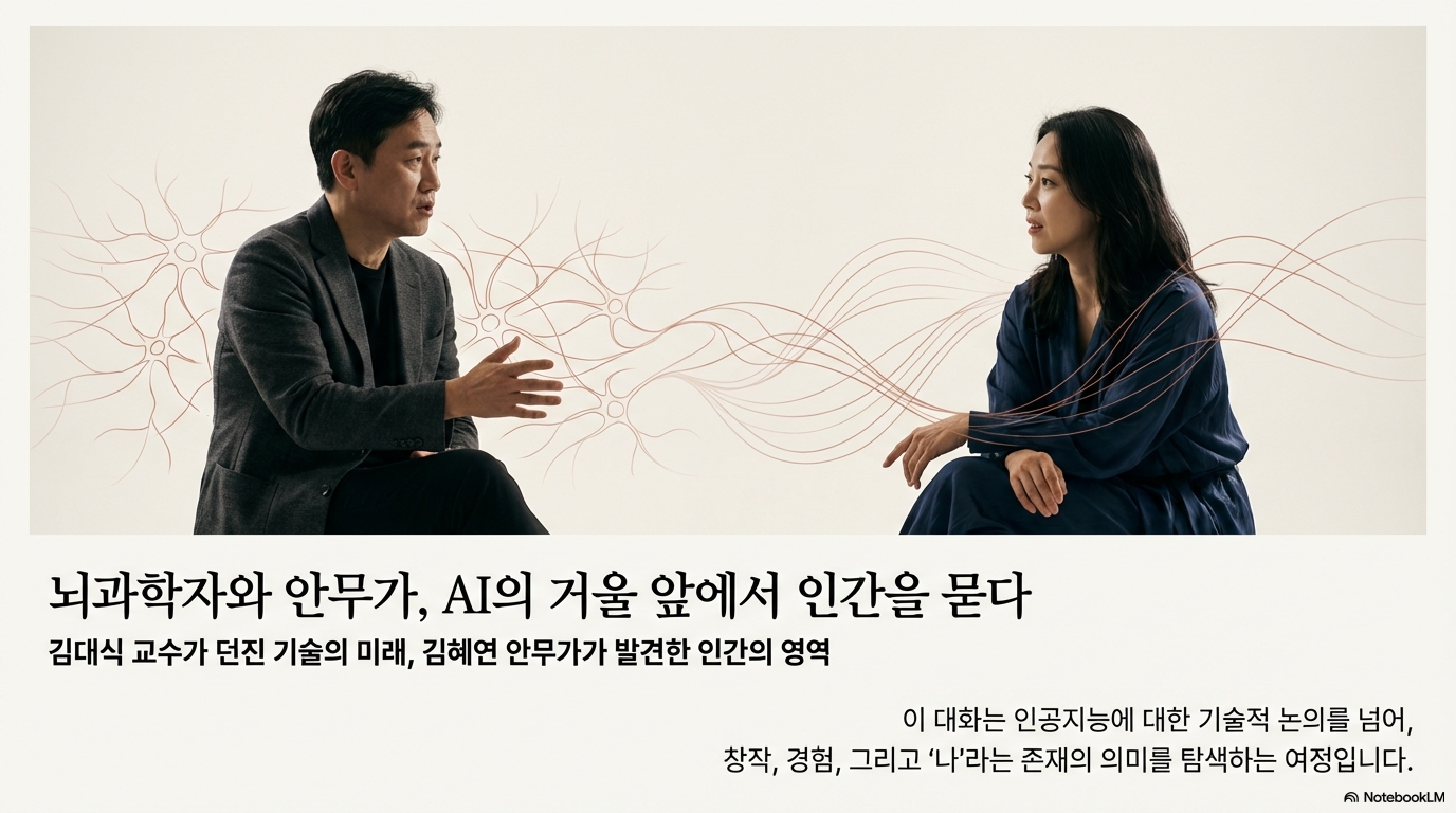 AI가 쓴 시를 읽고 해킹당했다? 뇌과학자와 안무가가 밝힌 AI 시대의 가장 놀라운 통찰 5가지서론: AI 시대, 인간을 다시 묻다인공지능이 그림을 그리고, 음악을 만들고, 심지어 영화배우의 자리까지 넘보고 있습니다. 과학자와 예술가. 언뜻 보면 전혀 다른 세상에 속한 듯 보이지만, 두 전문가는 "아무도 가보지 않은 길을 간다"는 본질을 공유합니다. 뇌과학자 김대식 교수와 AI를 창작의 파트너로 삼은 김혜연 안무가 역시 마찬가지입니다. 미지의 세상을 탐험하는 두 사람의 대화는 'AI가 인간을 어디까지 대체할 수 있는가'라는 보편적 질문을 넘어, 우리가 미처 생각지 못했던 놀라운 통찰로 우리를 이끕니다.기술의 최전선과 예술의 심장에서 길어 올린, AI 시대의 미래를 꿰뚫는 5가지 통찰을 소개합니다.----..