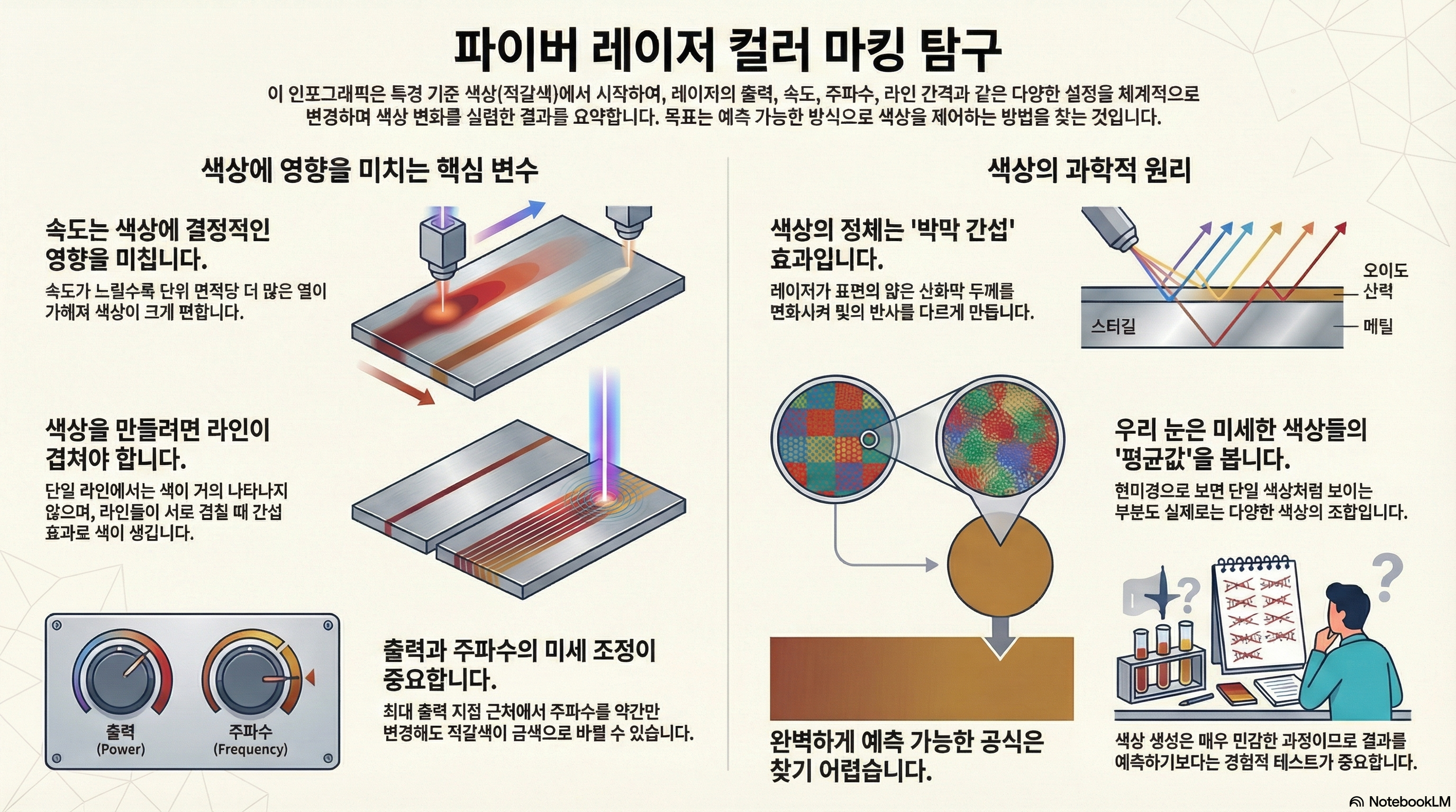 레이저로 색을 만든다고? 스테인리스 스틸 컬러 마킹에 대한 5가지 놀라운 진실서론: 무지갯빛 환상과 그 이면의 과학온라인에서 파이버 레이저로 스테인리스 스틸에 새긴 화려한 무지갯빛 작품을 본 적이 있나요? 영롱하게 빛나는 색상은 보는 이의 마음을 사로잡으며, 마치 마법처럼 느껴지기도 합니다. 이 기술이 얼마나 매력적으로 보이는지, 직접 시도해보고 싶은 마음이 드는 것은 당연합니다.하지만 이 아름다운 색상 뒤에는 단순한 '설정값 찾기' 이상의 깊은 복잡성과 놀라운 진실이 숨어있습니다. 이 글은 수백 번의 실험을 거쳐 발견된, 대부분의 사람들이 모르는 파이버 레이저 컬러 마킹의 핵심적인 통찰을 공유하기 위해 작성되었습니다. 정해진 공식이 아닌, 물리적 현상에 대한 깊은 이해가 어떻게 예측 불가능한 결과를 창..