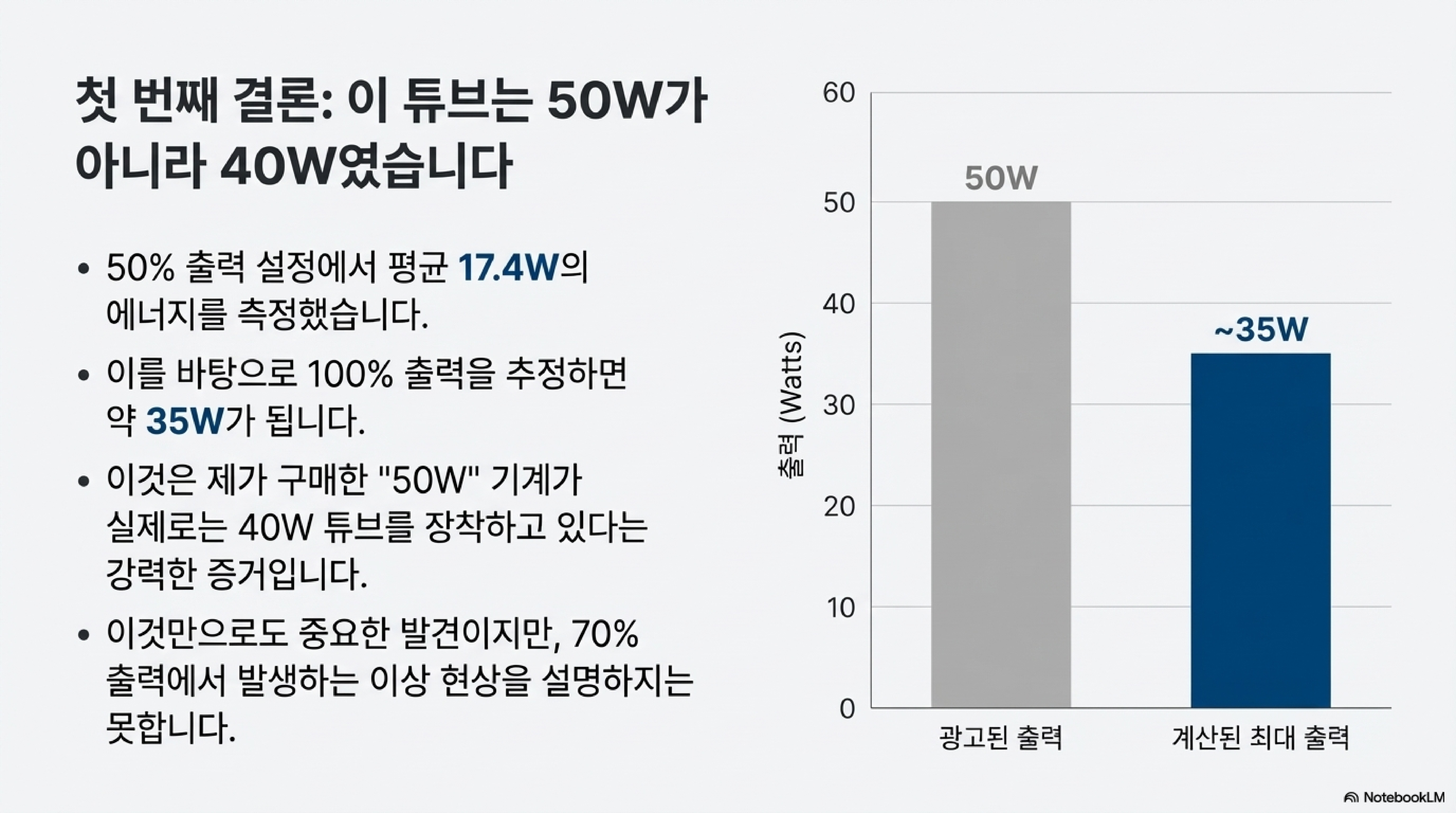 계산은 간단합니다. 50% 설정에서 1719와트의 출력이 나왔다면, 기계의 100% 최대 출력은 약 3438와트에 불과하다는 추정이 가능합니다. 이는 50와트가 아닌 40와트 튜브의 사양과 일치합니다. 이 사실은 기계가 사양보다 낮은 성능을 가졌다는 첫 번째 증거였습니다. 그리고 이어진 70% 테스트의 성능 붕괴는, 그저 사양이 낮은 것뿐만 아니라 튜브 자체가 고장 나고 있다는 결정적인 증거가 된 것입니다.