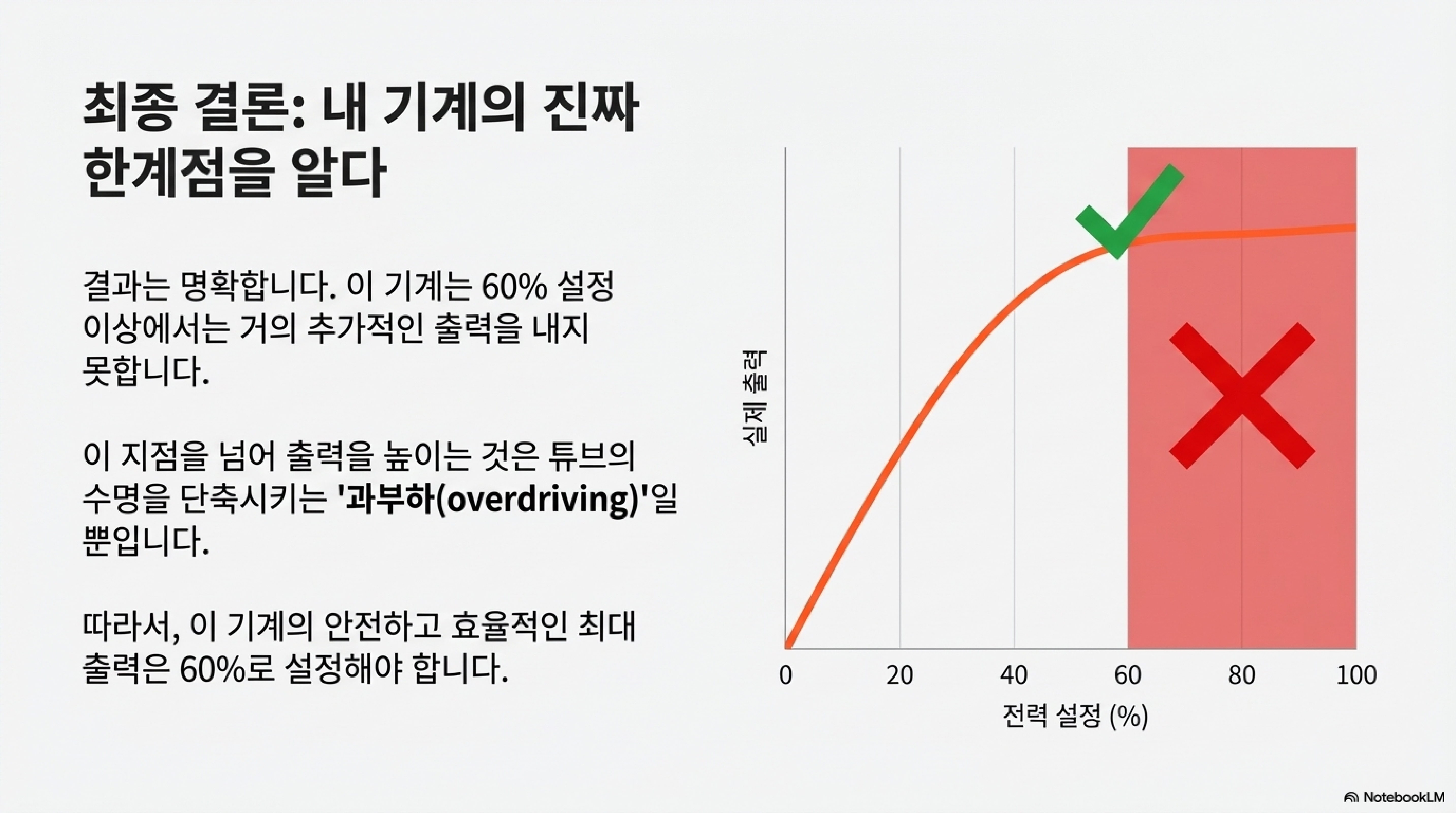 이는 출력 설정을 이 고원 지점 이상으로 높이는 것이 성능 향상에는 도움이 되지 않으면서, 오히려 튜브를 과도하게 구동시켜 손상만 가중시킨다는 것을 명확히 보여줍니다.