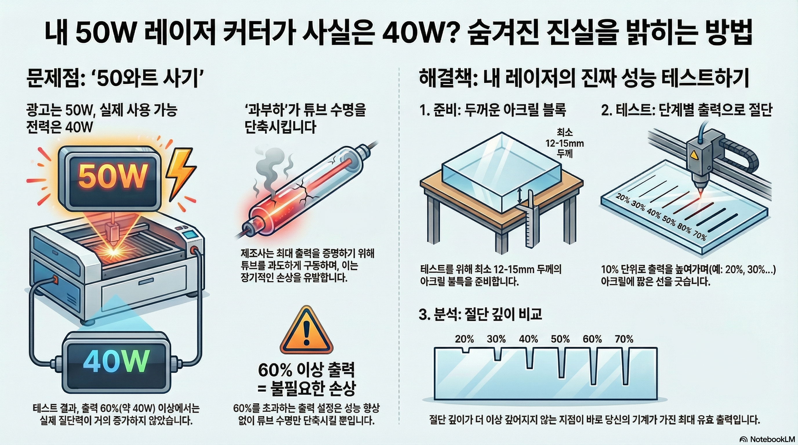 결국 당신이 50W 기계라고 믿고 구매한 것은, 실용적인 모든 목적에서 사실상 40W 기계인 셈입니다.