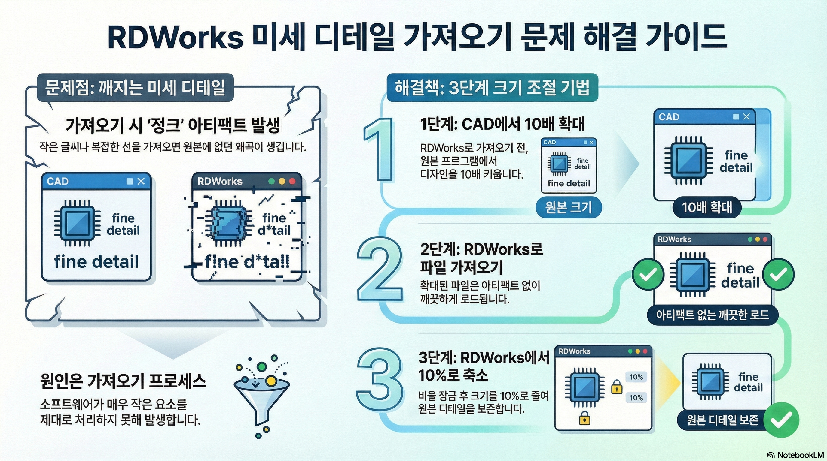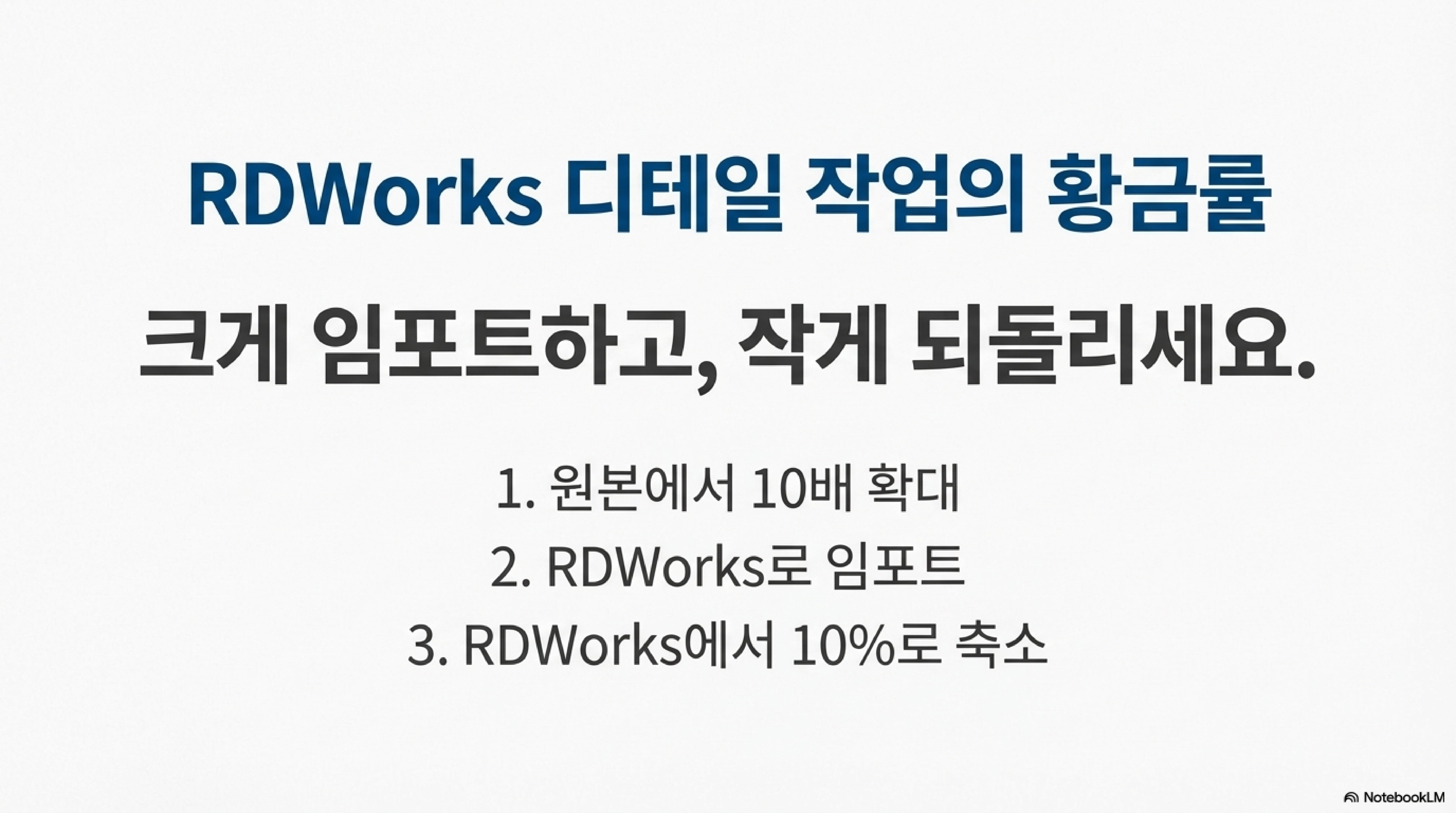 결국 핵심은 '크게 만들어서 가져온 뒤, 다시 작게 줄인다'는 간단한 원리입니다. 이 방법은 단순히 문제를 해결하는 기술을 넘어, 때로는 소프트웨어의 한계 밖에서 생각하는 역발상이 얼마나 중요한지를 보여주는 좋은 예입니다. 이 팁 하나만 기억해두면, 앞으로 RDWorks에서 정교한 디자인이 깨지는 문제로 스트레스받을 일은 없을 것입니다.