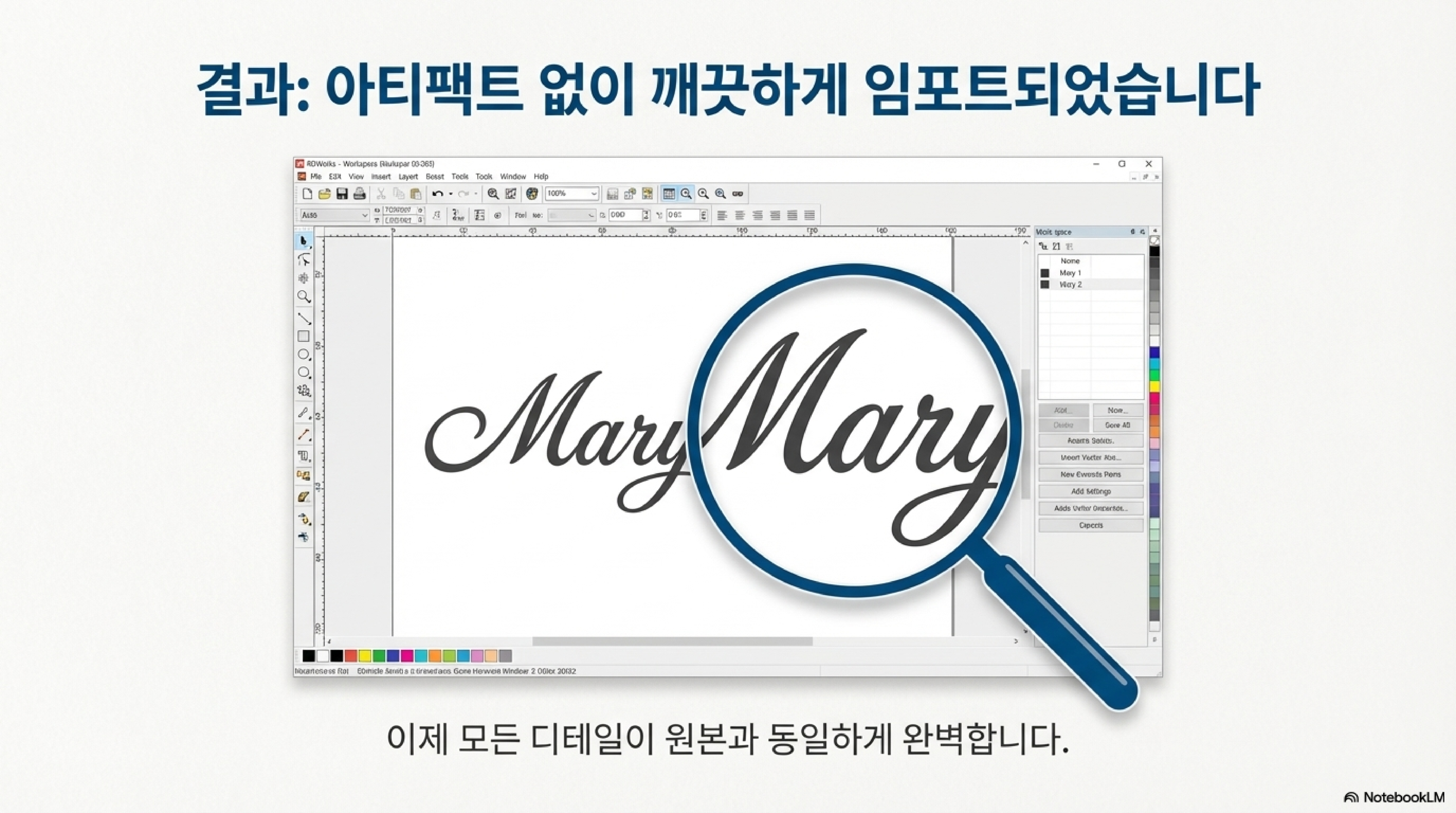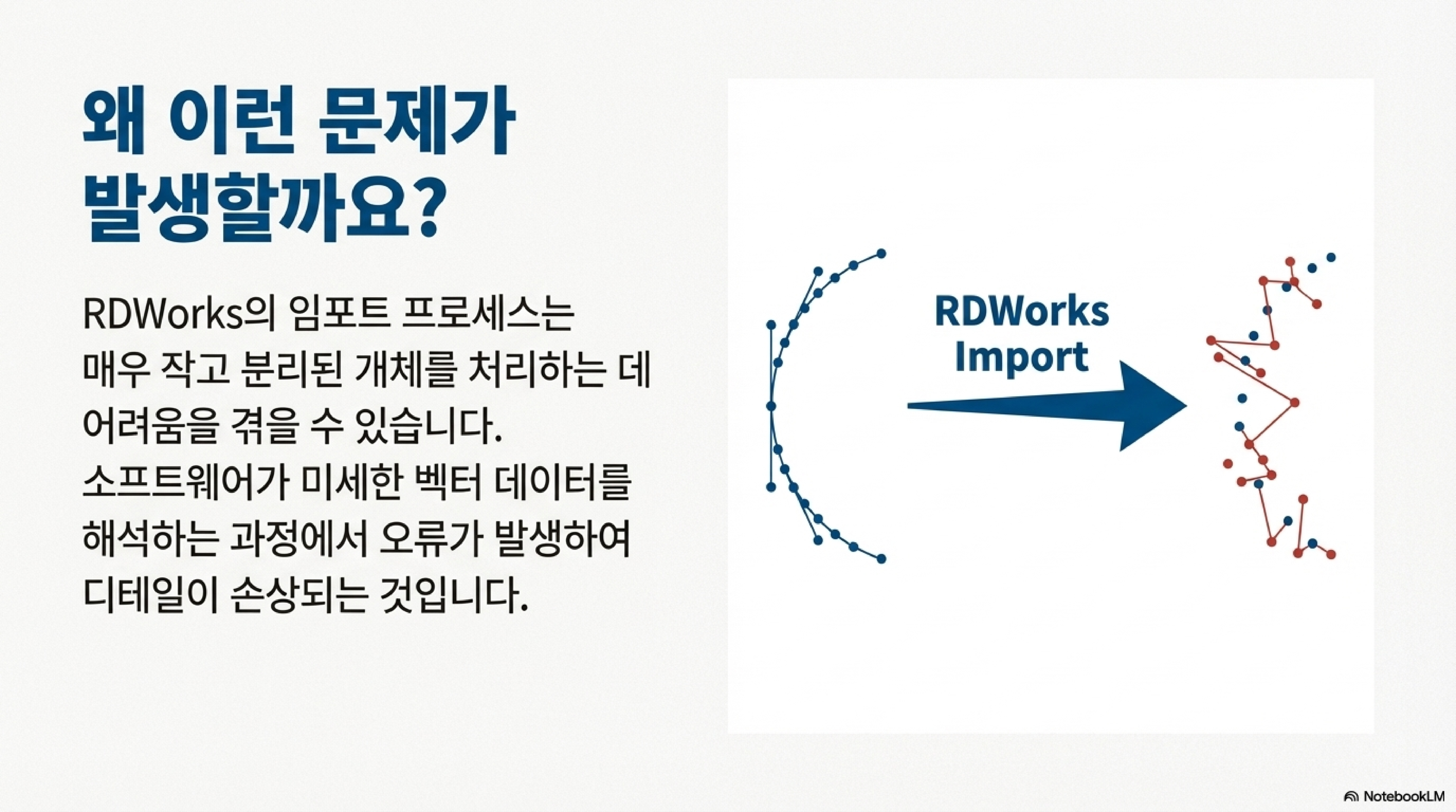 이 문제의 핵심은 RDWorks의 가져오기 프로세스가 아주 작은 디테일을 처리하는 데 한계가 있다는 점입니다. 소프트웨어가 복잡하고 작은 요소들을 불러올 때, 이를 제대로 인식하지 못하고 처리 과정에서 오류를 일으키는 것입니다.