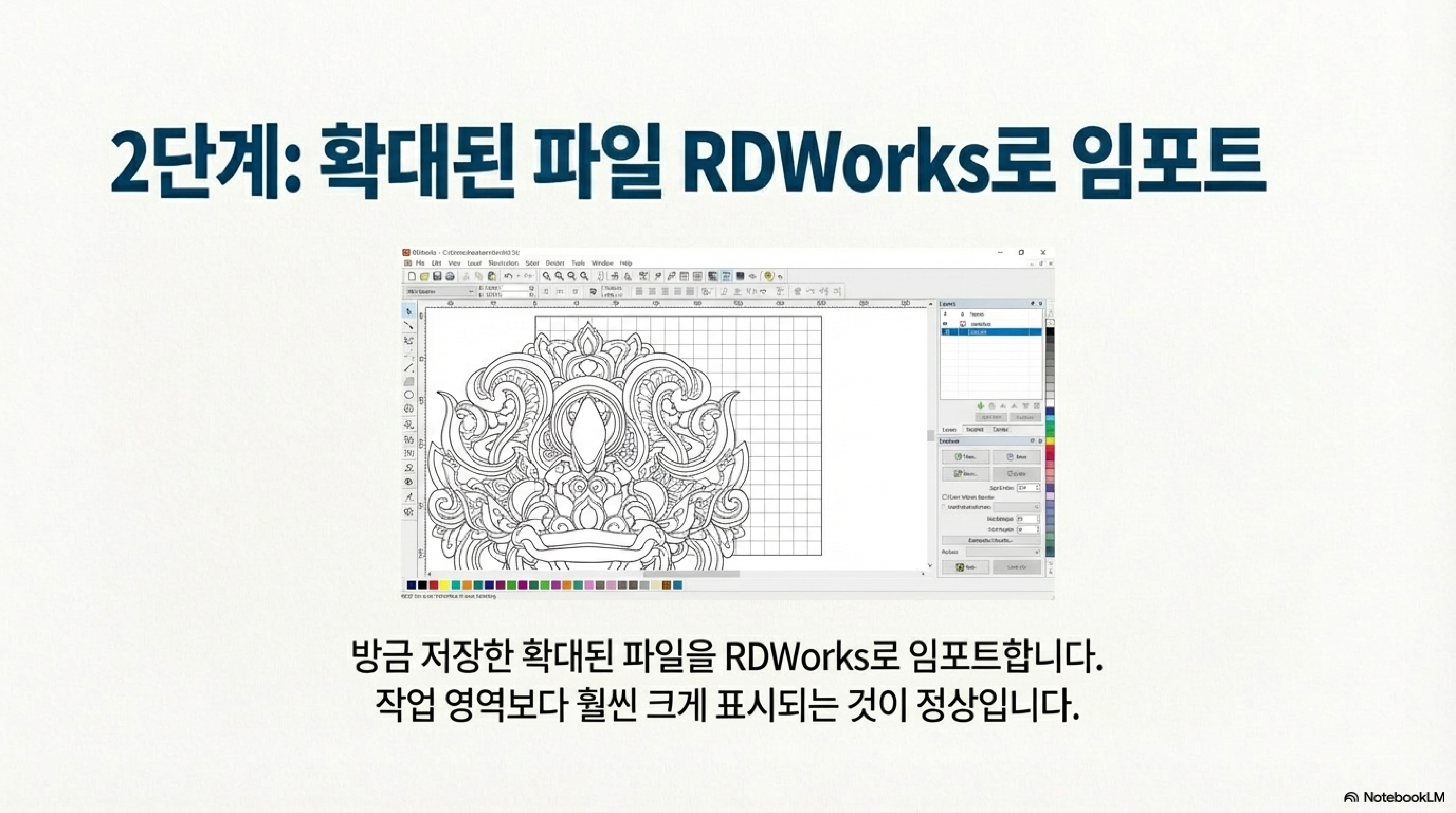 이 문제를 해결하는 방법은 역발상에서 나옵니다. 바로 RDWorks로 파일을 가져오기 전에, 원본 디자인의 크기를 의도적으로 크게 만드는 것입니다.
