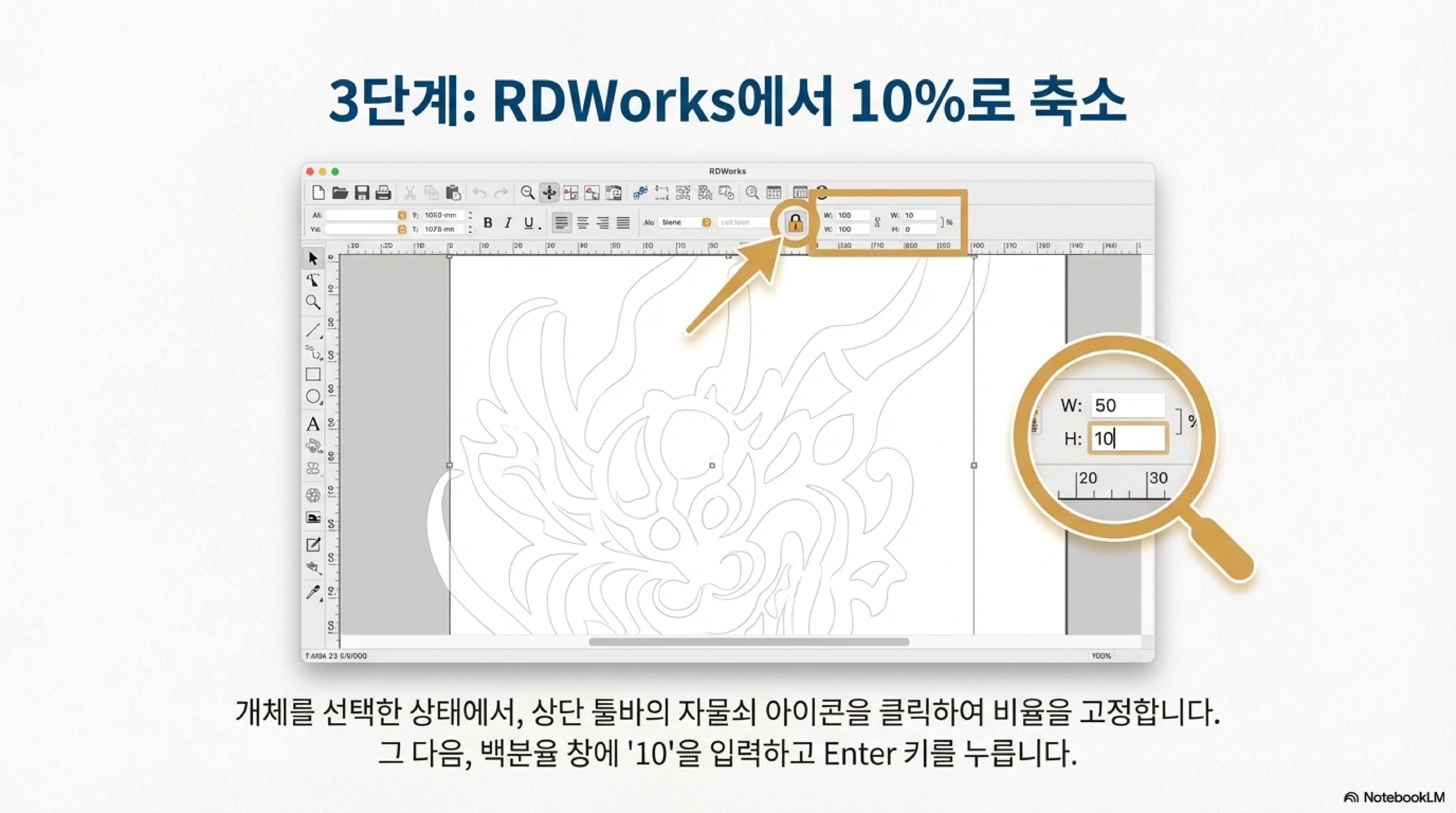 - 원본 파일에서 확대했던 비율만큼 다시 줄여줍니다. 예를 들어 원본 파일에서 10배로 키워서 가져왔다면, 비율 입력창에 '10%'라고 입력합니다.