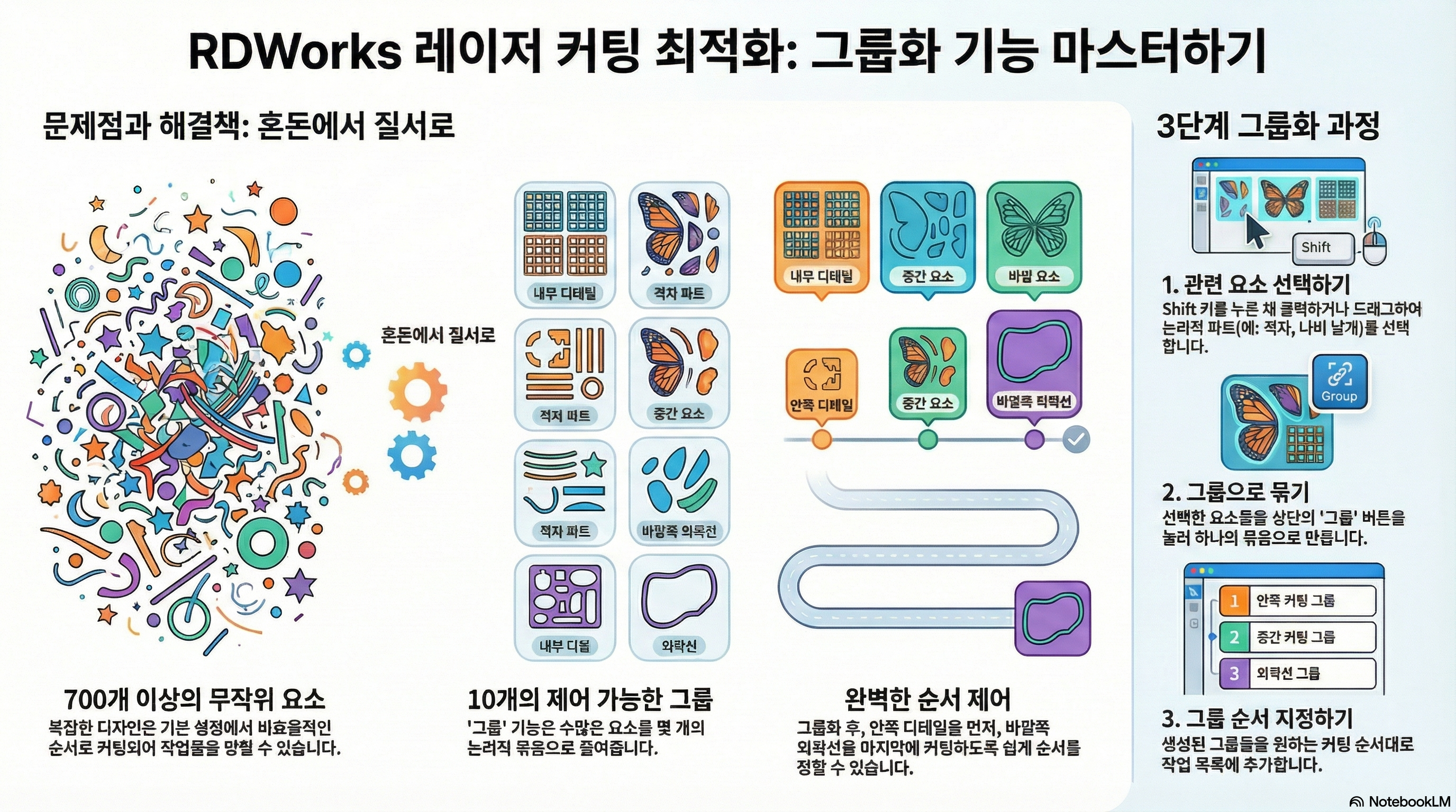 이 글의 핵심 메시지는 간단합니다. 가장 강력한 해결책은 종종 복잡하고 새로운 기술이 아니라, 우리가 매일 사용하면서도 미처 그 잠재력을 발견하지 못한 기본 기능 속에 숨어 있다는 것입니다. RDWorks의 '그룹' 기능은 수많은 레이저 커팅 사용자들의 작업대 위에 놓인, 저에게도 그랬듯이 숨겨진 보석과도 같았습니다.