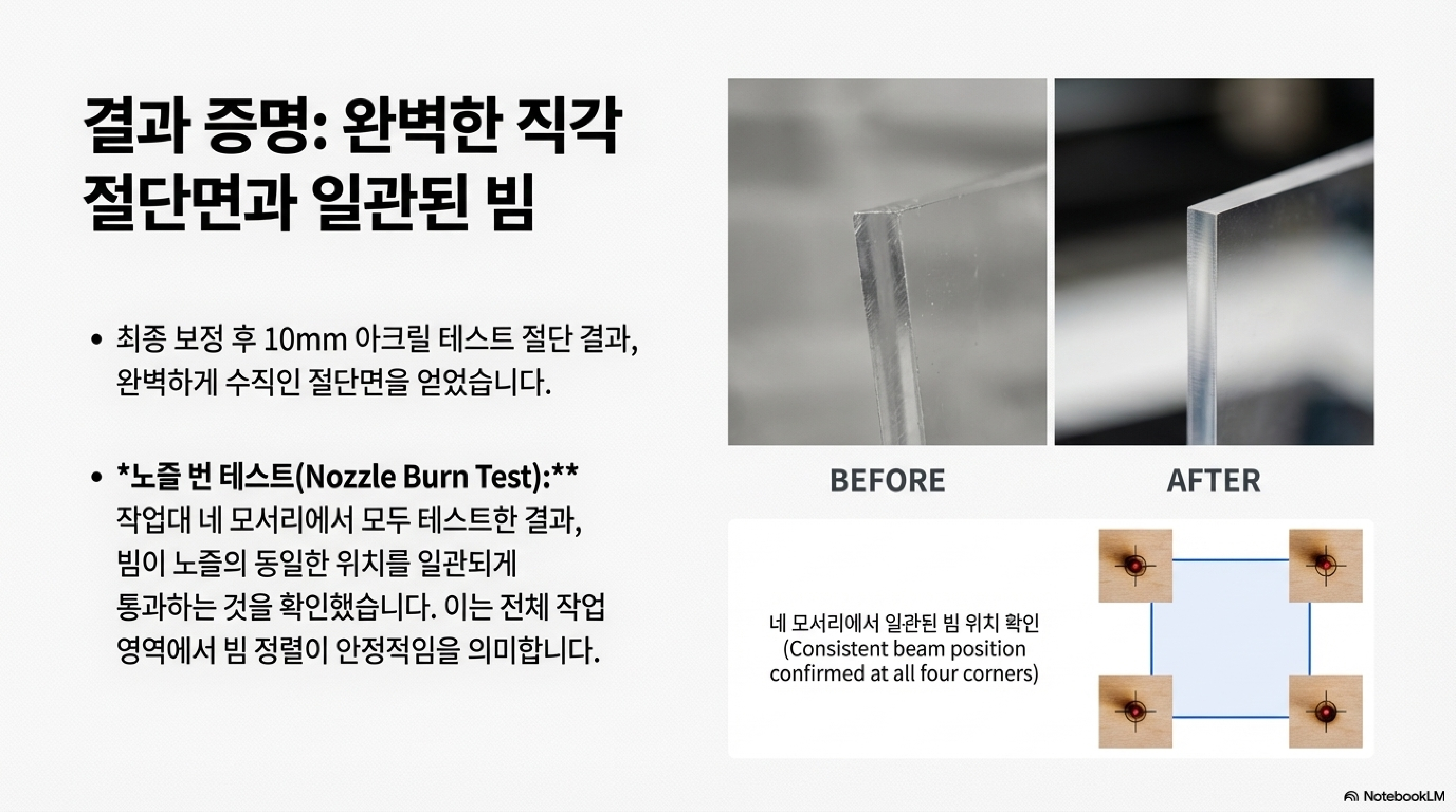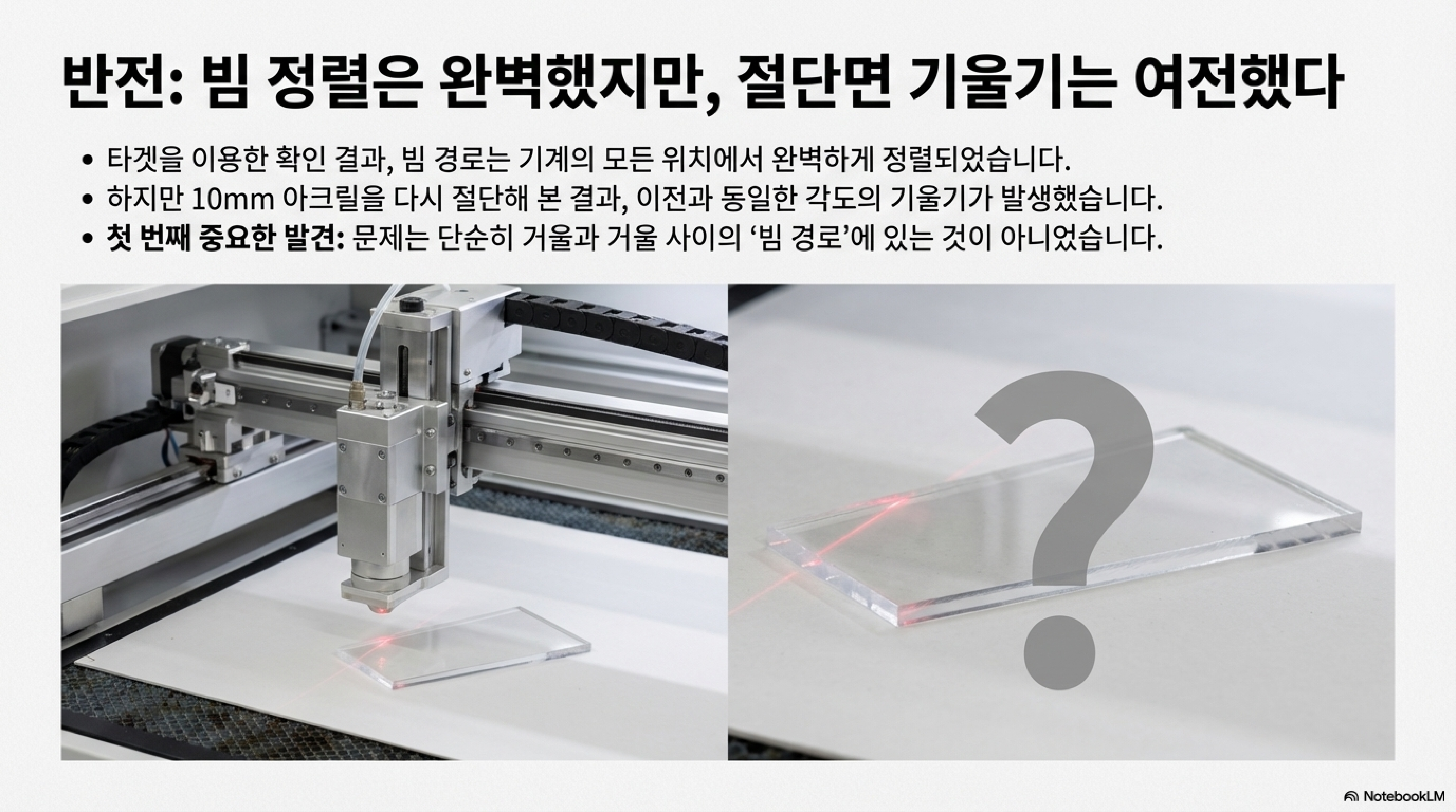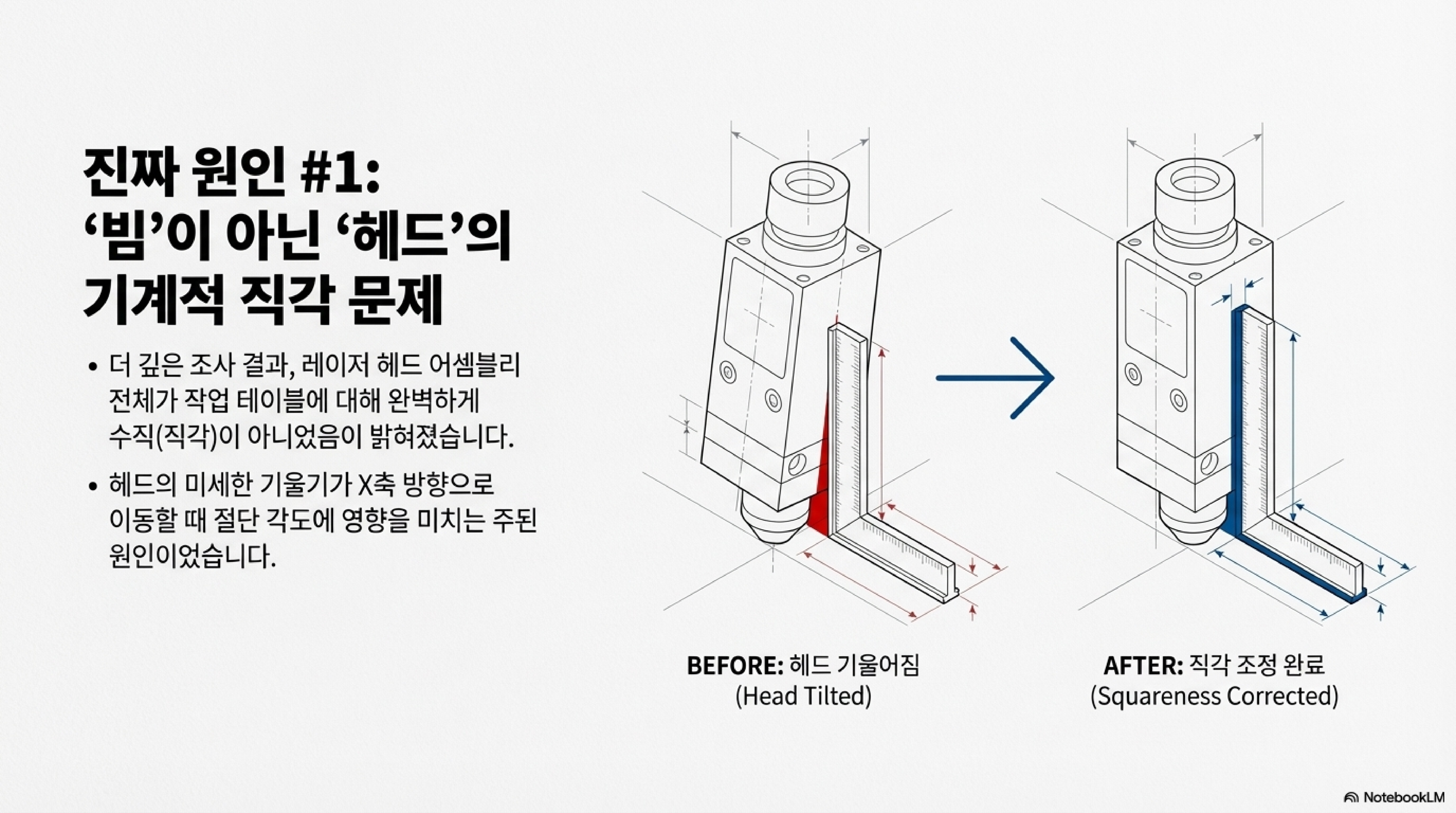 진짜 원인은 훨씬 더 간단하고 기계적인 것이었습니다. 바로 레이저 헤드 전체가 작업 테이블에 대해 물리적으로 직각이 아니었던 것입니다.