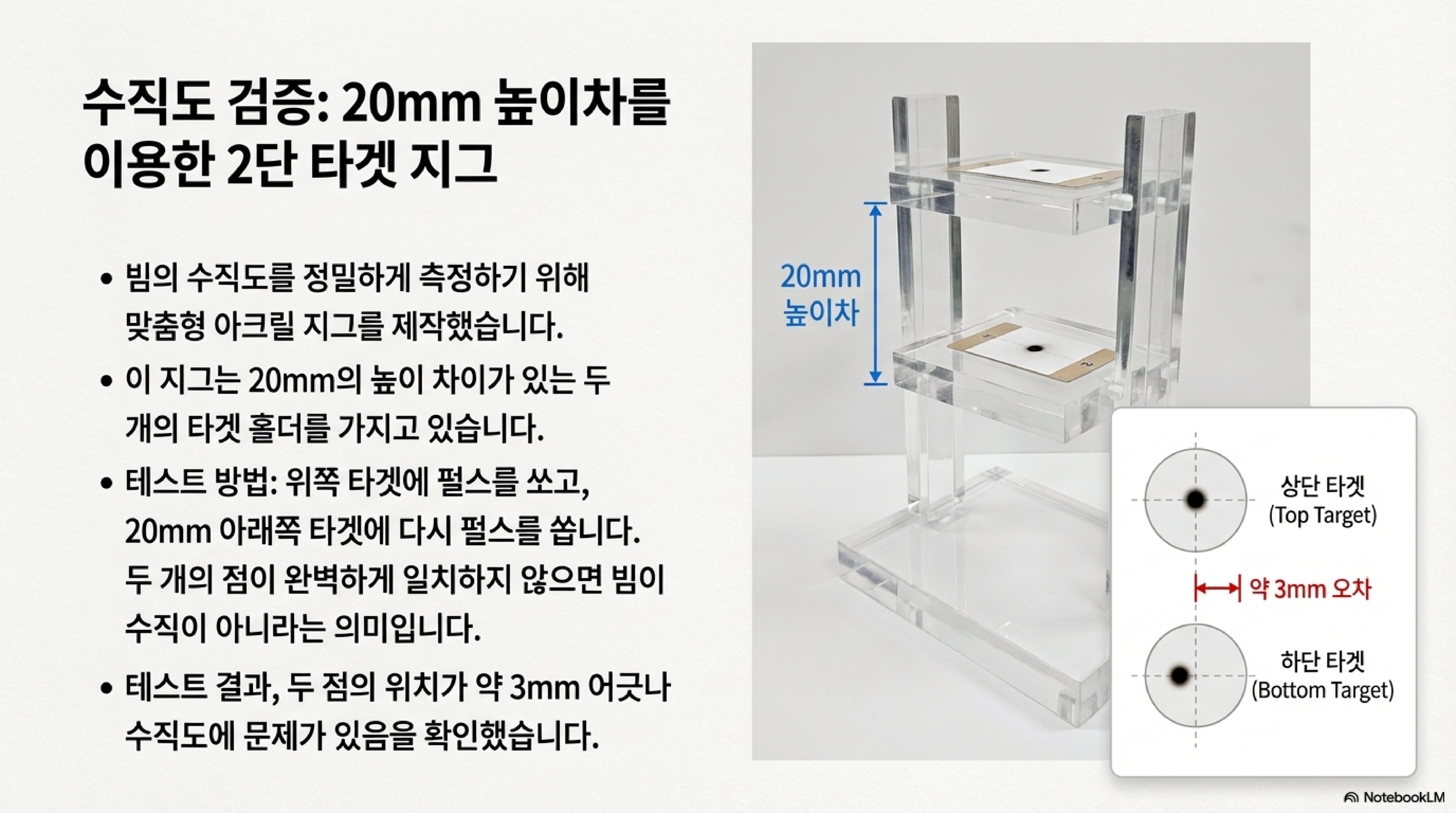 빔이 축과 평행하고 렌즈 중심을 통과하더라도, 최종적으로 작업 표면에 완벽하게 수직으로 떨어지지 않을 수 있다는 것이었습니다. 이를 확인하기 위해 저는 간단한 아크릴 지그를 만들었습니다. 이 지그는 렌즈 바로 아래와 그보다 20mm 더 낮은 두 위치에서 빔의 위치를 확인할 수 있게 해줍니다. 테스트 결과는 충격적이었습니다. 20mm 수직 거리에서 빔이 무려 3mm나 벗어나 있었습니다. 진정한 정밀도를 얻기 위해 저는 레이저 헤드를 완전히 분해하고, 조정 범위를 확보하기 위해 장착 구멍을 5.2mm에서 6.2mm로 넓힌 후, 헤드 전체를 물리적으로 재정렬해야 했습니다.