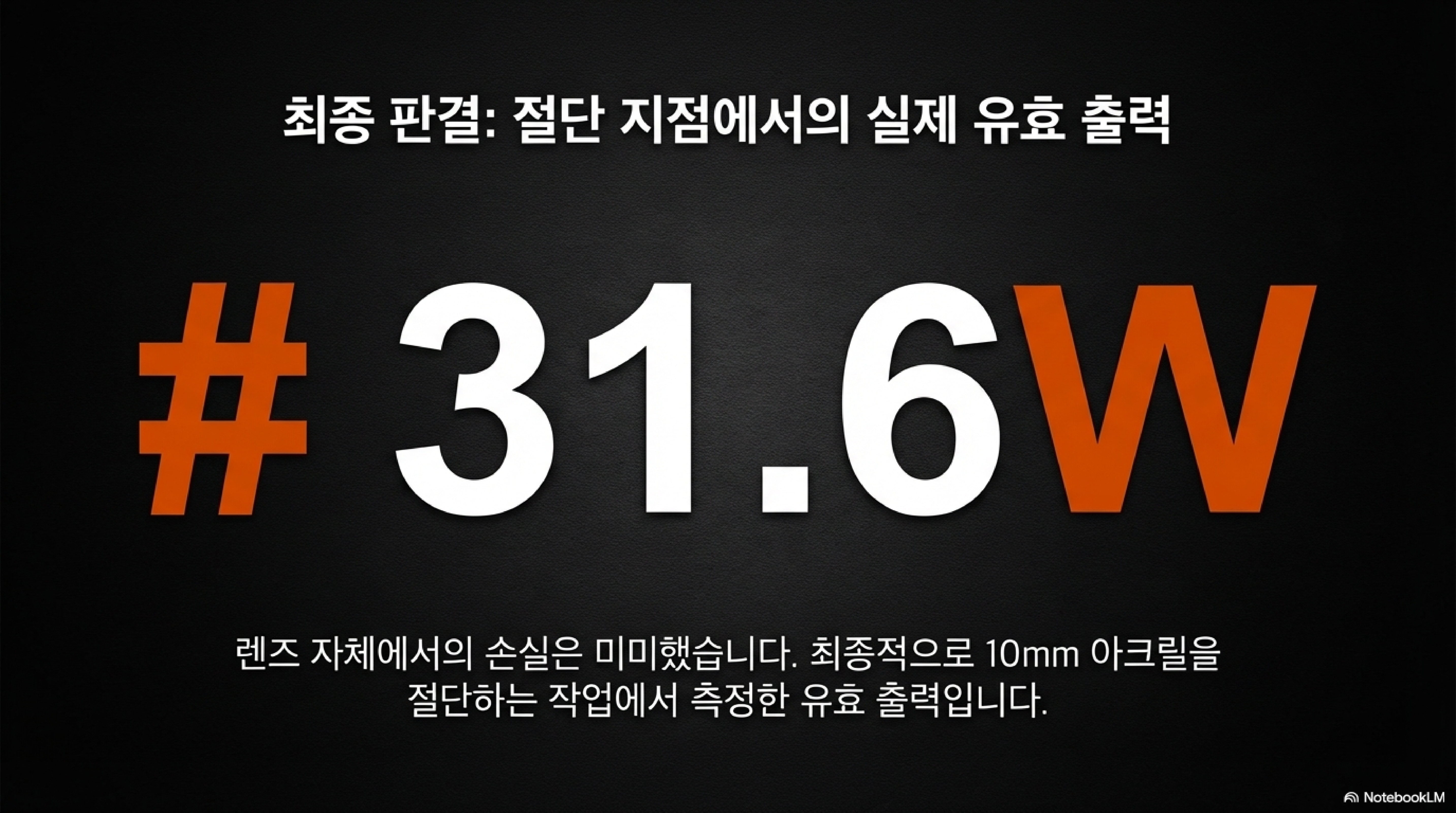 - 최종 노즐(렌즈 후) 측정: 마지막으로 렌즈를 통과한 후 노즐 끝에서 나오는 최종 출력을 측정했습니다. 결과는 31.6와트.
