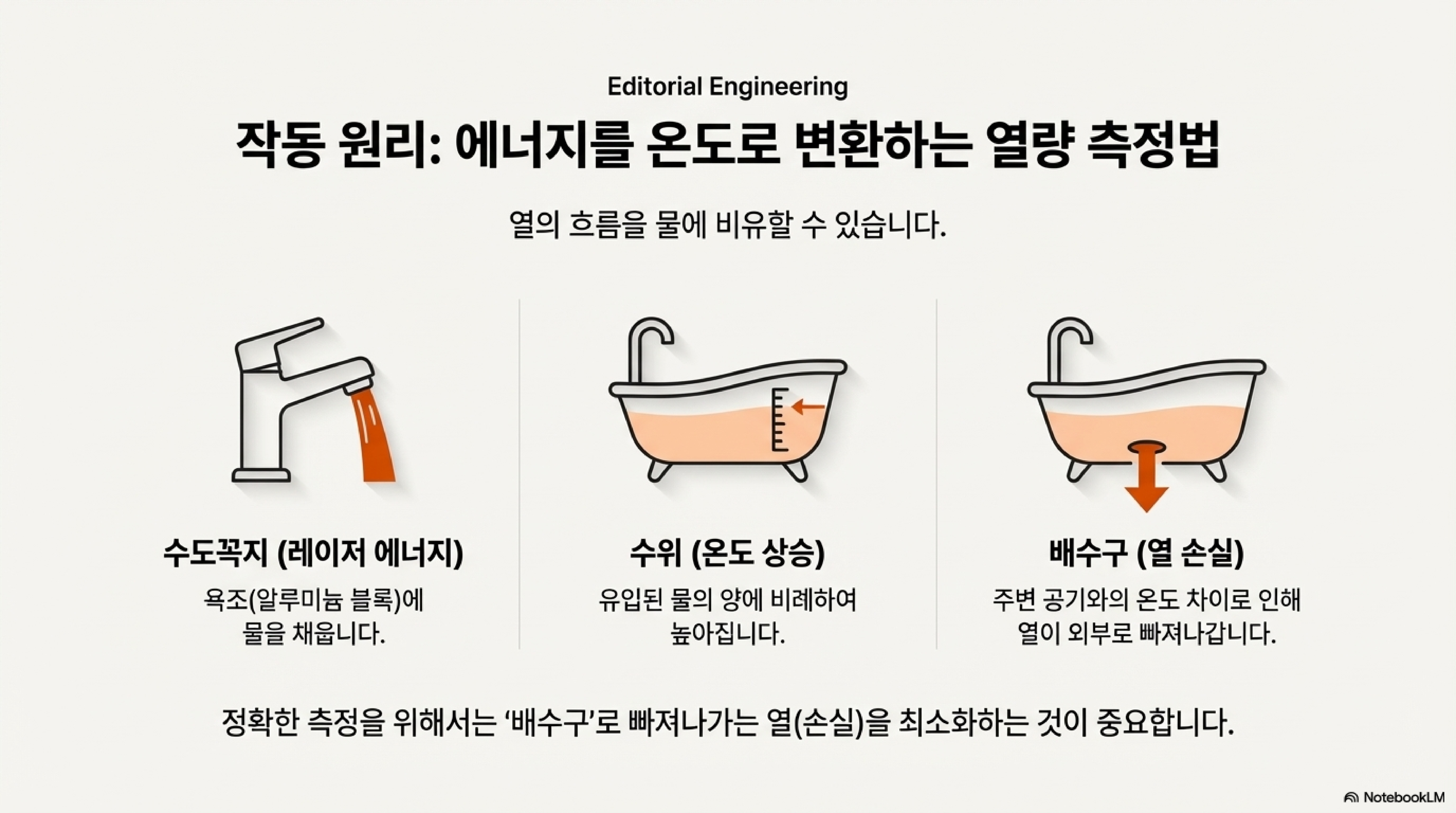 "파워미터를 '욕조', 레이저 빔을 '수도꼭지에서 나오는 물', 그리고 주변으로 뺏기는 열을 '열린 배수구'라고 상상해 보세요. 물을 채우는 동시에 배수구로 물이 빠져나가면 정확한 양을 잴 수 없죠."