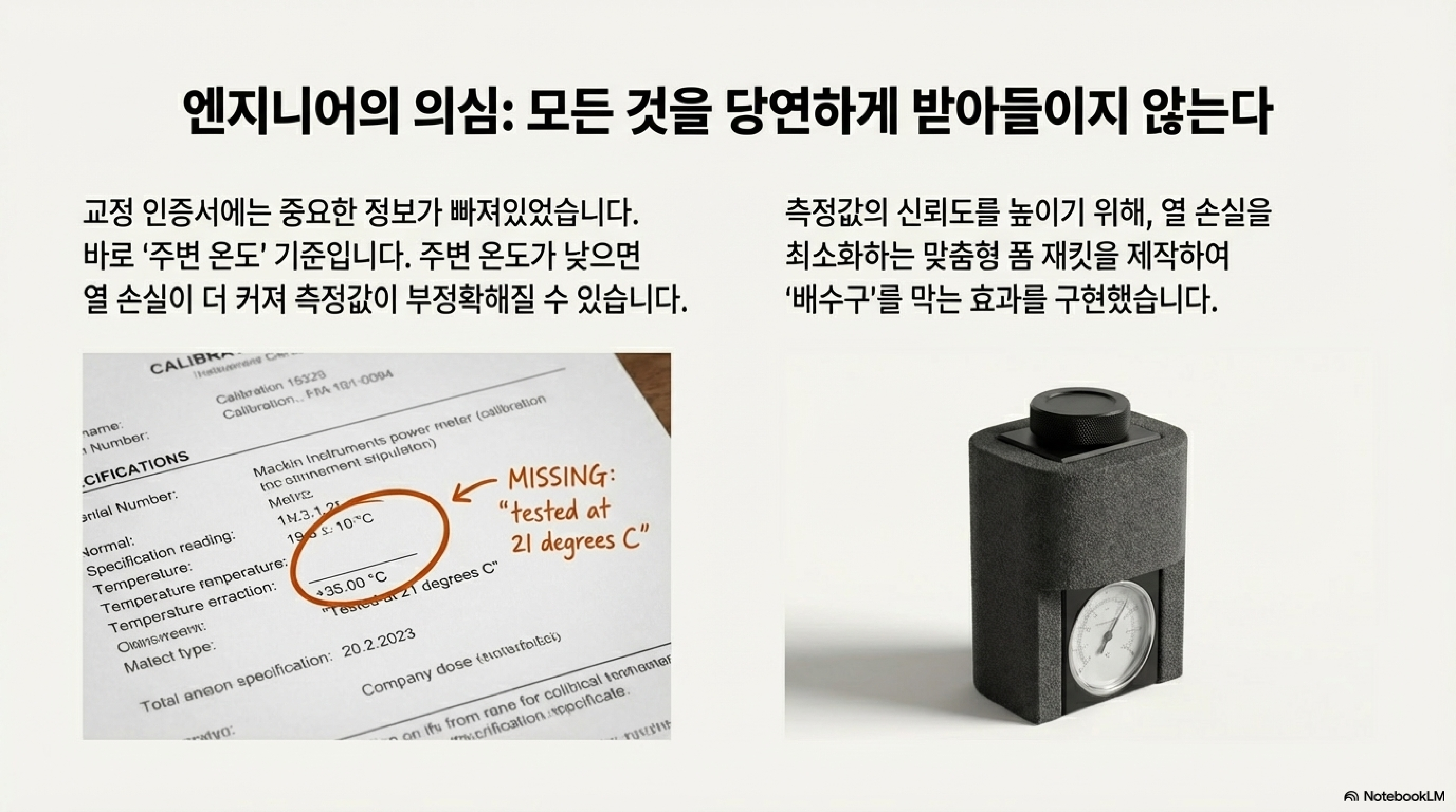 그는 측정 장비(파워미터)의 교정 인증서를 맹신하지 않았습니다. 인증서에 측정 당시의 '주변 온도' 기준이 명시되지 않았다는 점을 지적하며, 온도가 측정값에 미칠 영향을 의심했습니다. 이 의문을 설명하기 위해 그는 아주 멋진 비유를 사용했습니다.