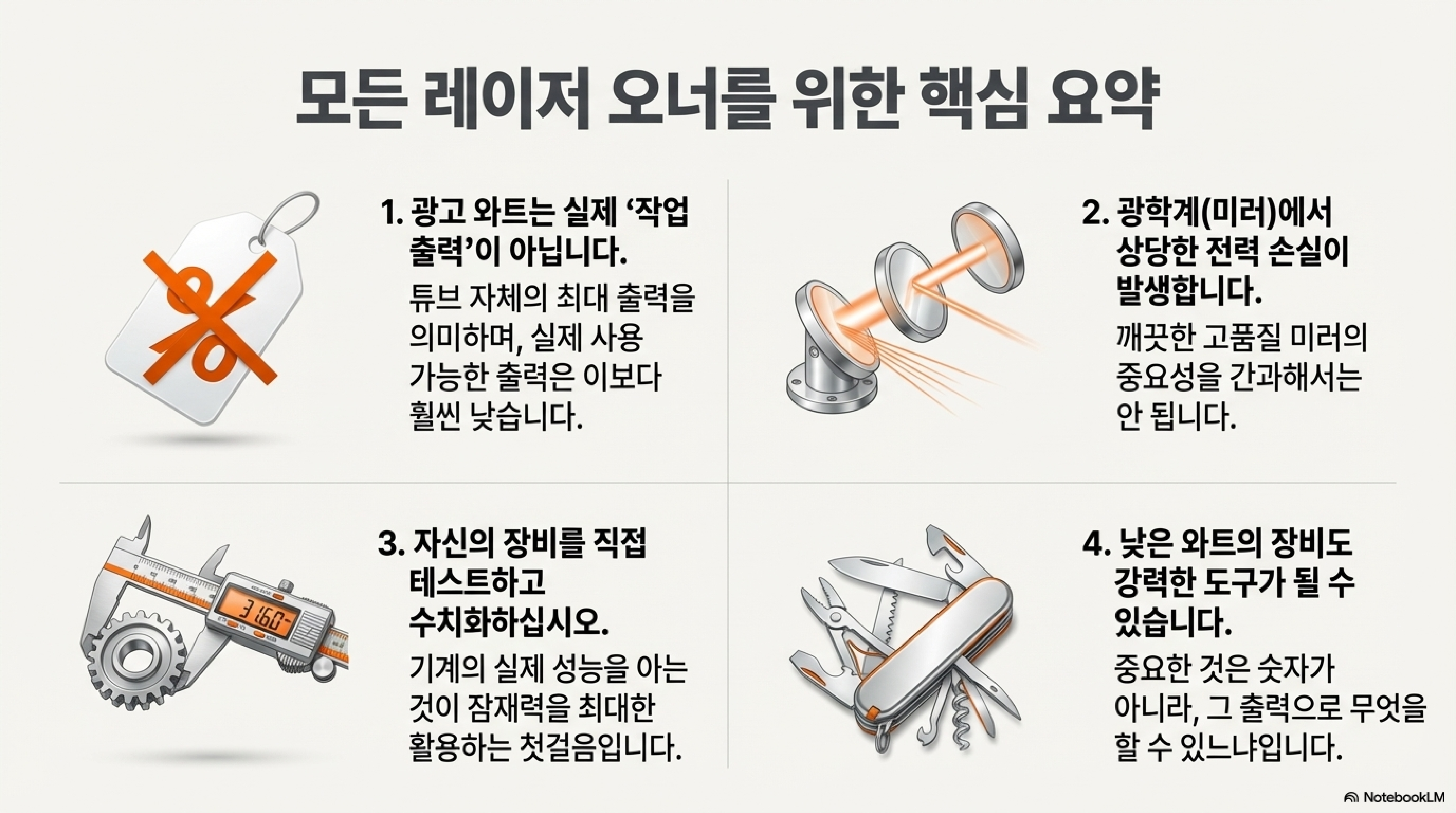 결론적으로, 이 엔지니어의 집요한 탐구는 광고된 스펙이 현실과 다를 수 있다는 사실을 명확히 보여주었습니다. 레이저 커터의 실제 성능은 튜브의 출력뿐만 아니라 거울의 상태, 기계의 예열 여부 등 복잡한 요인들이 얽혀 결정되는 것이었습니다. 그리고 그 진실은 오직 세심하고 체계적인 측정을 통해서만 알 수 있습니다.