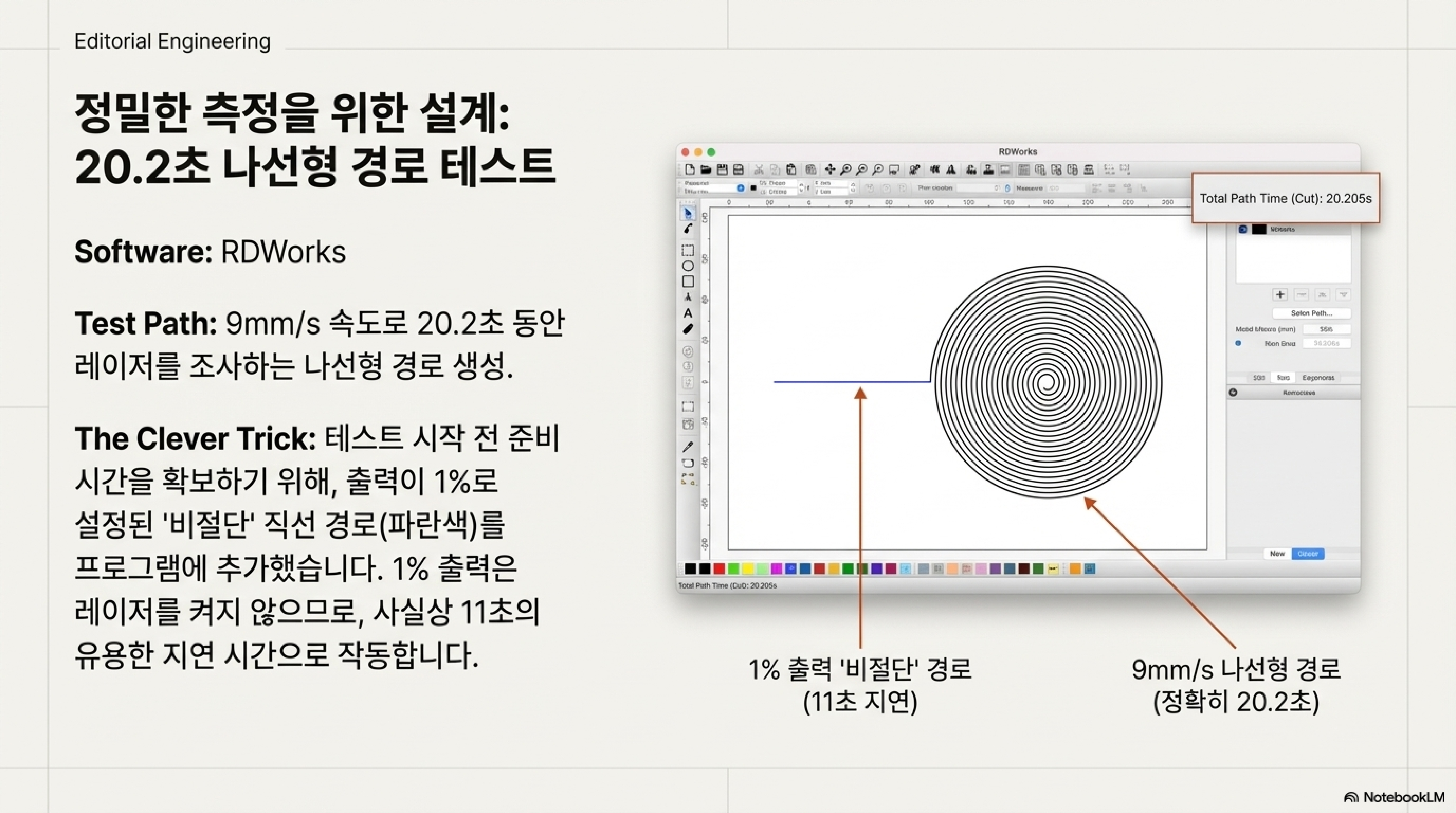 또한, 레이저 경로를 소프트웨어에서 정밀하게 프로그래밍하여, 측정기의 교정 기준 시간인 '정확히 20.2초' 동안만 빔이 조사되도록 설정했습니다. 이는 임의의 시간이 아니라, 측정 장비의 공식적인 교정 표준을 지키기 위한 필수적인 과정이었습니다. 결과의 신뢰도를 높이려는 그의 체계적인 접근 방식은 우리 모두에게 큰 교훈을 줍니다.