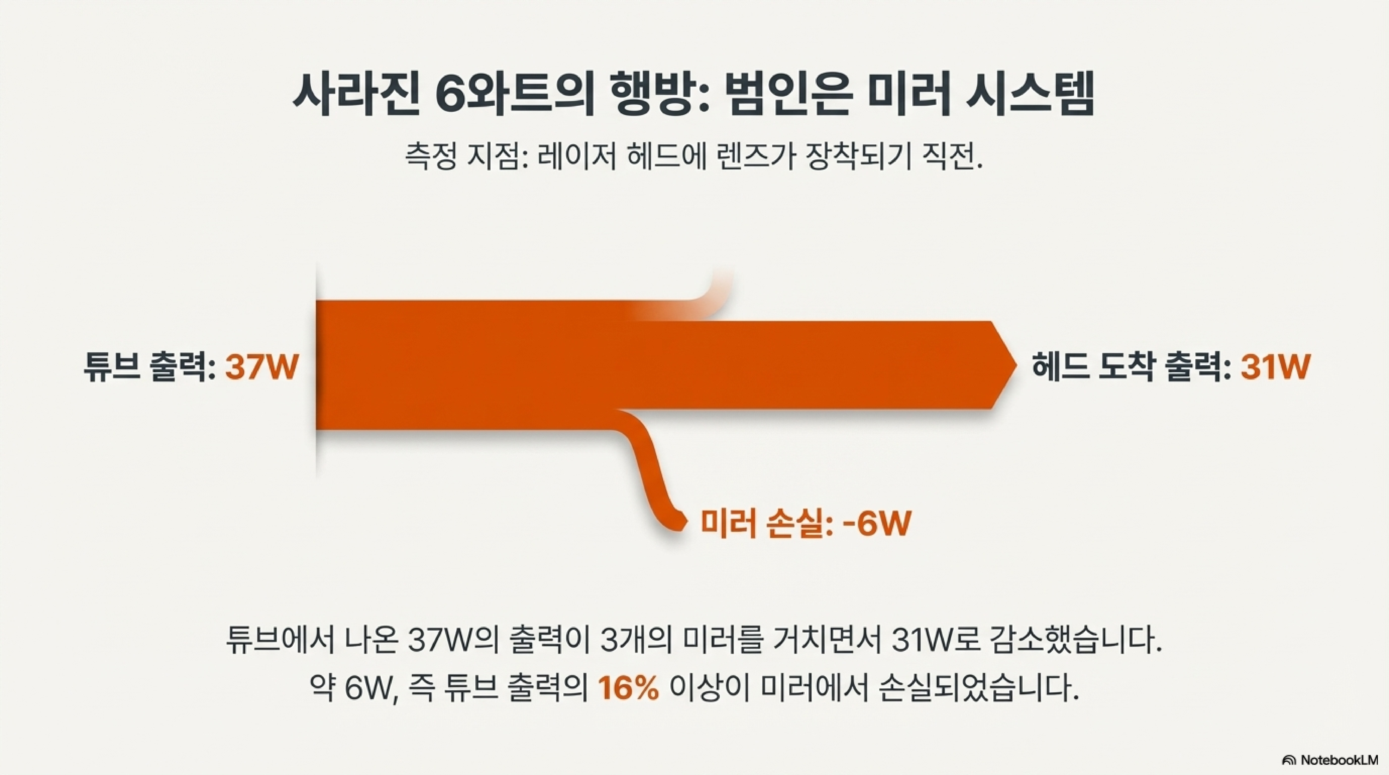 이 단계별 측정은 범인을 명확히 지목했습니다. 바로 '거울 시스템'이었습니다. 튜브에서 나온 37와트의 출력 중 약 6와트가 3개의 거울을 거치면서 손실된 것입니다. 반면, 마지막 초점 렌즈로 인한 손실은 거의 없었습니다. 많은 사용자가 렌즈 청결에만 신경 쓰지만, 실제로는 거울의 정렬 상태와 청결도가 사용 가능한 출력에 훨씬 큰 영향을 미친다는 사실이 증명된 셈입니다.
