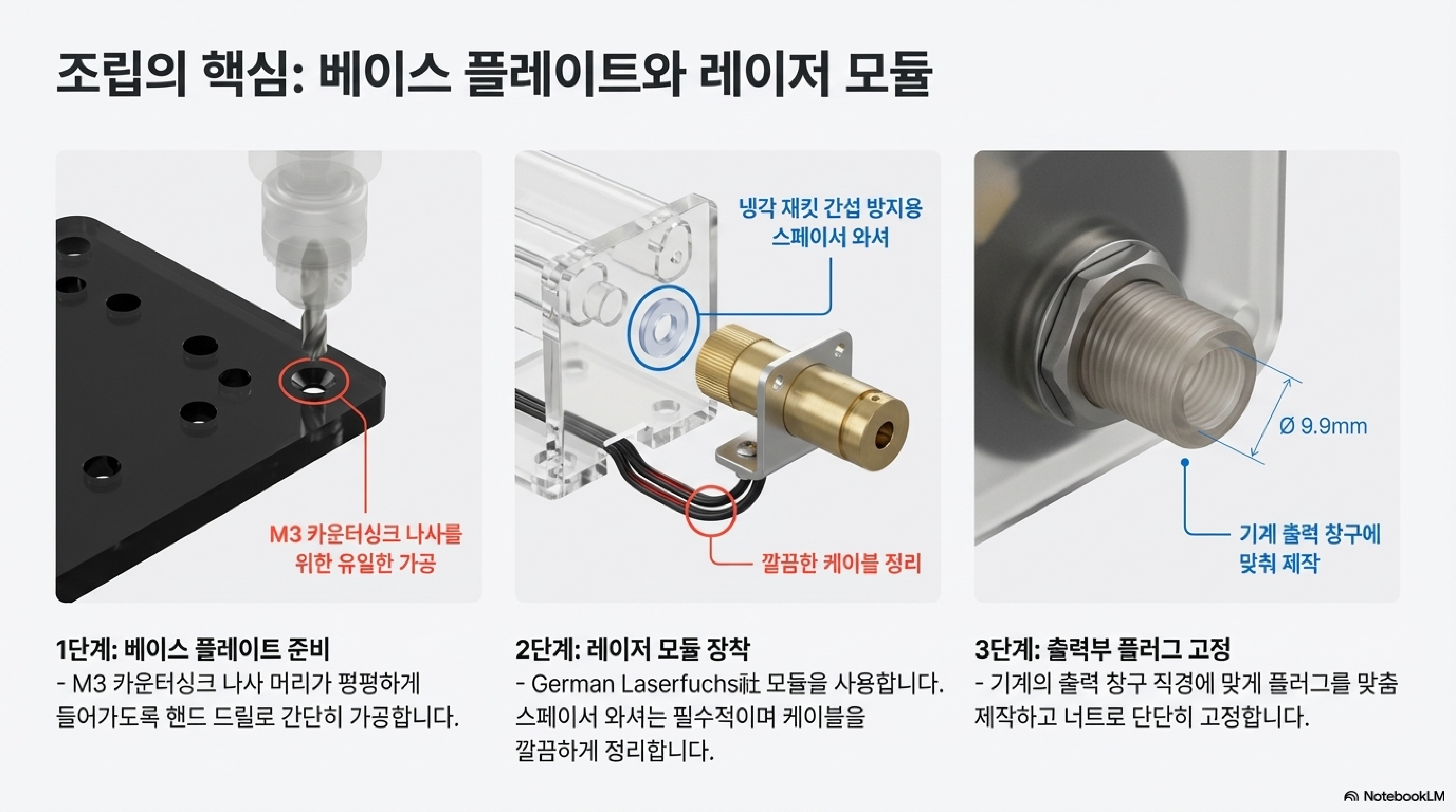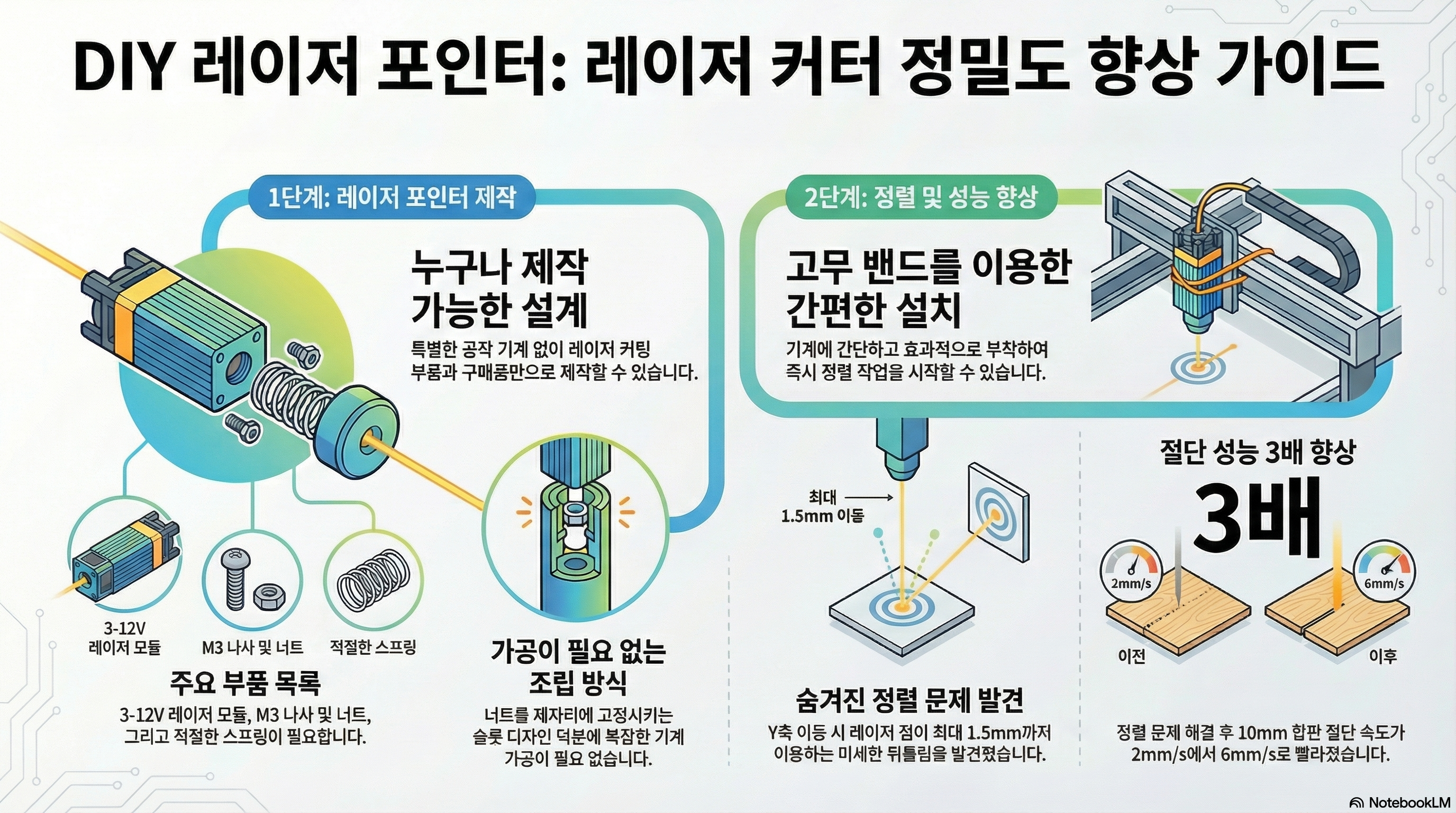 이 레이저 포인터 도구의 진정한 아름다움은 그 설계 철학에 있습니다. 값비싼 선반이나 밀링 머신 없이, 오직 레이저 커터로 자른 부품과 쉽게 구할 수 있는 부품들로만 만들어졌습니다.