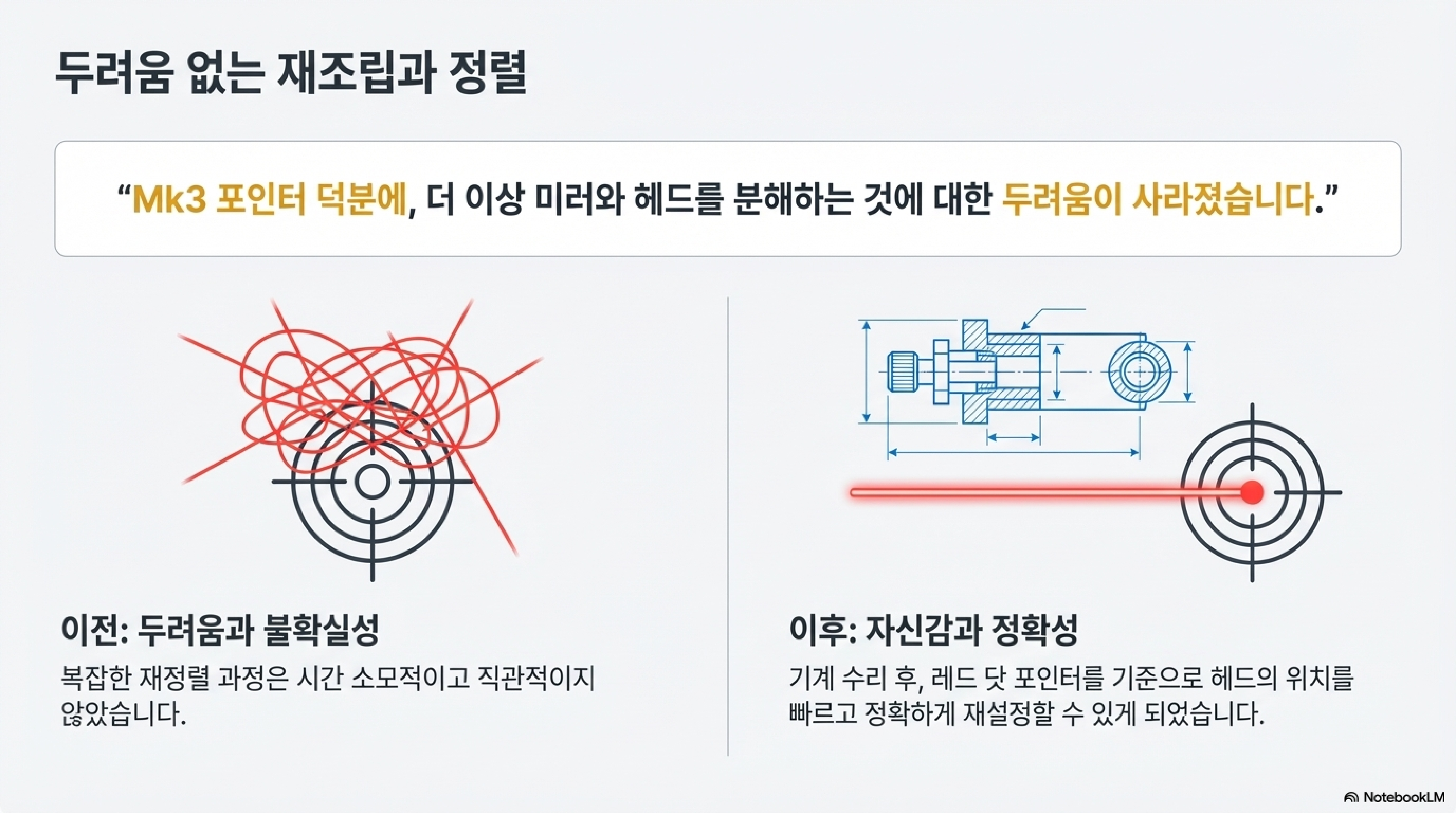 "솔직히 말해, 이 작은 도구 덕분에 저는 더 이상 미러와 헤드를 '찢어발기는' 것에 대한 두려움이 전혀 없습니다. 그것들을 다시 조립하고 정렬하는 것이 정말 쉬운 일이 되었기 때문입니다."