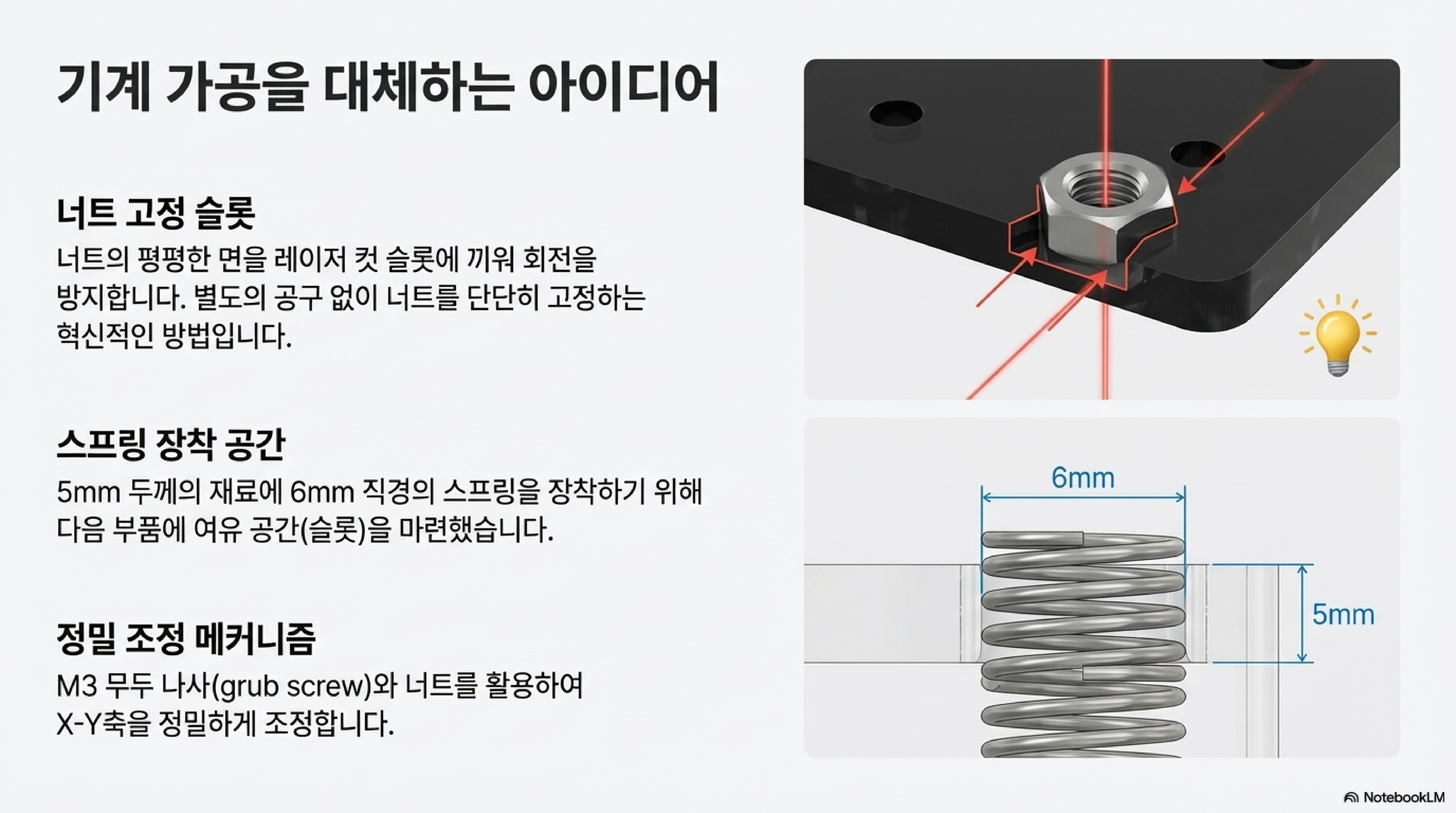 특히 너트를 고정하는 방식은 정말 기발합니다. 보통은 구멍을 뚫고 탭으로 나사산을 내야 하지만, 이 설계는 레이저로 너트 모양의 완벽한 '열쇠 구멍'을 파내 너트를 그 안에 가두어 버립니다. 특별한 공구나 복잡한 가공 없이, 오직 똑똑한 기하학만으로 문제를 해결한 것이죠. 여기서 우리는 메이커 정신의 가장 흥미로운 아이러니를 발견합니다. 바로 정밀 CNC 기계인 레이저 커터를 사용해, 오히려 전통적인 정밀 가공의 필요성을 없애버리는 해결책을 만들어냈다는 점입니다. 말 그대로 도구를 이용해 도구를 개선한 것입니다.