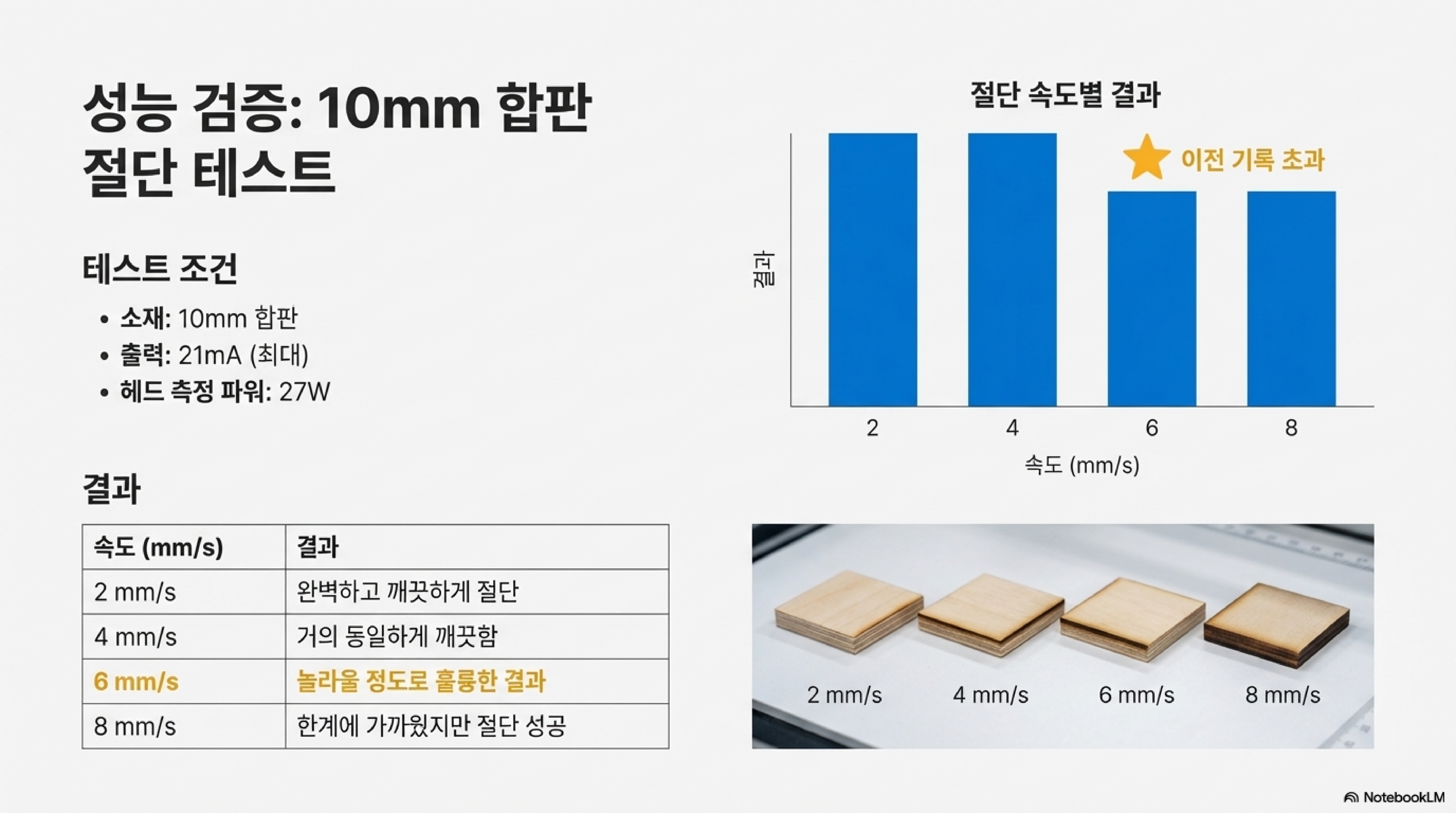 물리적 왜곡을 바로잡고 모든 것을 정밀하게 재조정한 결과는 기적이었습니다. 제작자는 10mm 두께의 합판을 이전에는 상상도 못 했던 초당 6mm, 심지어 8mm의 속도로 완벽하게 커팅하는 데 성공했습니다. 8mm/s에서는 표면에 약간의 그을음이 생겼는데, 이는 기계의 절대적인 성능 한계에 도달했다는 짜릿한 증거였습니다.