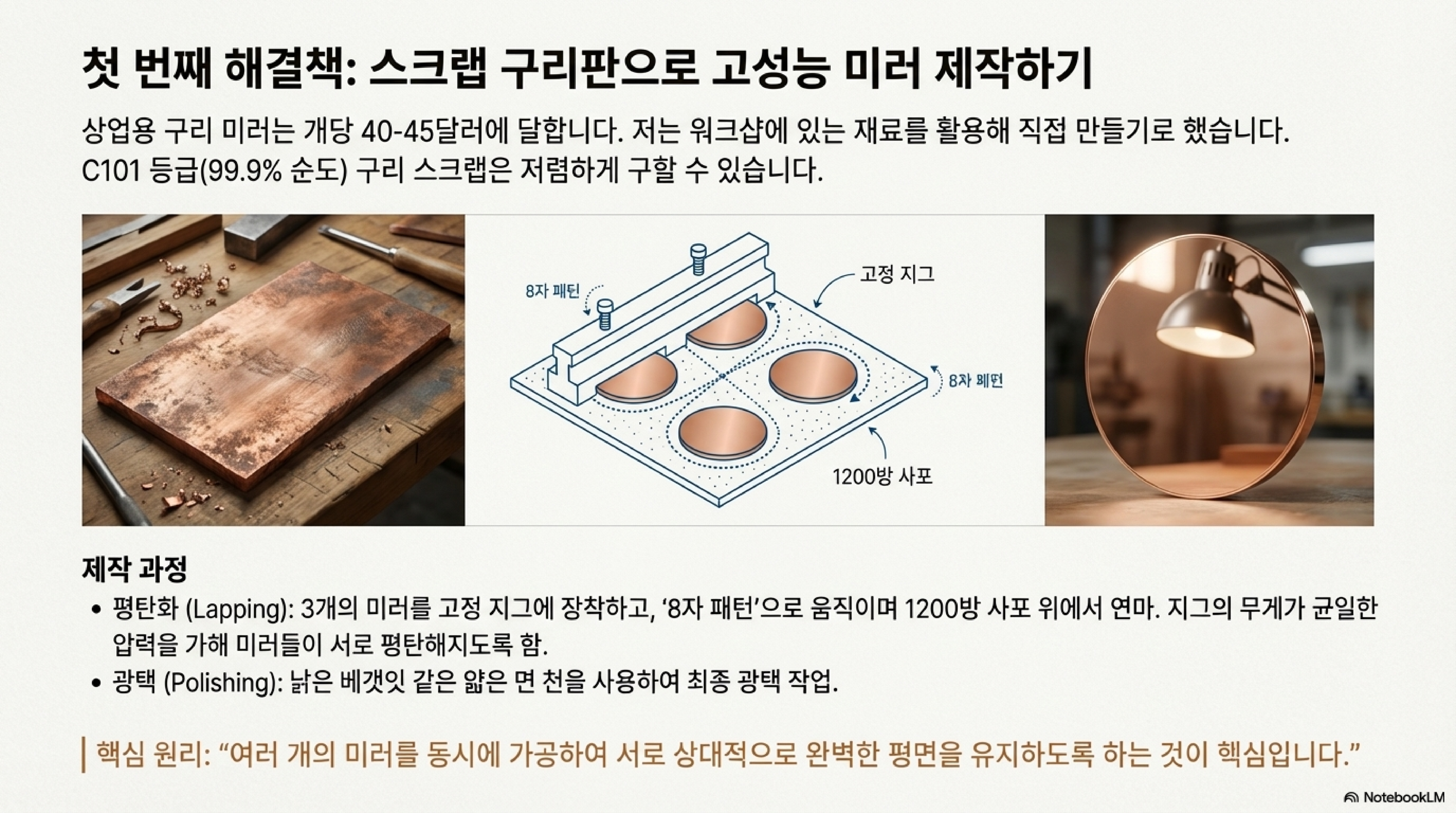제작 과정은 놀라울 정도로 간단했습니다. 1200방 사포 위에 물을 뿌리고, 세 개의 구리 거울을 하나의 고정판에 붙인 뒤, 낡은 면 베갯잇과 연마제를 사용하여 '8자 모양'으로 문질러 광을 내는 것이 전부였습니다. 여기서 가장 기발한 비결은 세 개의 거울을 동시에 연마하는 것이었습니다. 이는 단순히 효율을 위한 것이 아니라, 거울들이 서로를 마모시키며 상대적으로 완벽하게 평탄해지도록 보장하는 고전적인 광학 기술입니다.