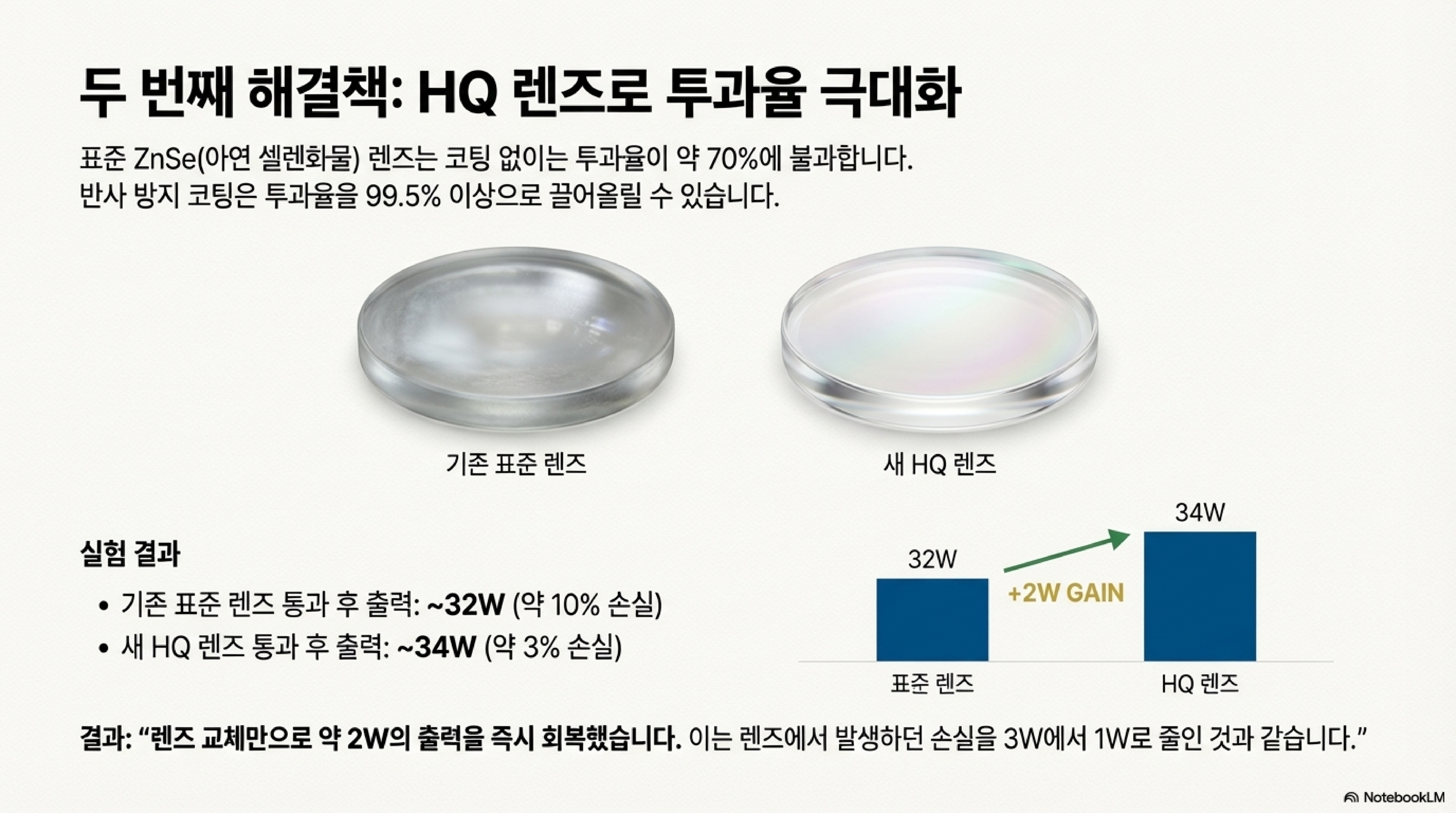 유튜버는 기존의 표준 렌즈에서 약 10%의 출력 손실이 발생하는 것을 확인했습니다. 그는 아연 셀렌화물이 독성 물질이라는 데이터 시트를 읽은 후, 조심스럽게 장갑을 끼고 렌즈를 고품질(HQ) 렌즈로 교체했습니다. 그러자 손실률은 단 3%로 극적으로 줄어들었습니다. 렌즈 교체 하나만으로 약 2W의 출력을 되찾은 것입니다. 이는 거울만큼이나 렌즈의 품질이 전체 시스템 효율에 얼마나 큰 영향을 미치는지, 그리고 종종 간과되는 이 부품이 어떻게 '숨겨진 출력 도둑'이 될 수 있는지를 명확히 보여줍니다.