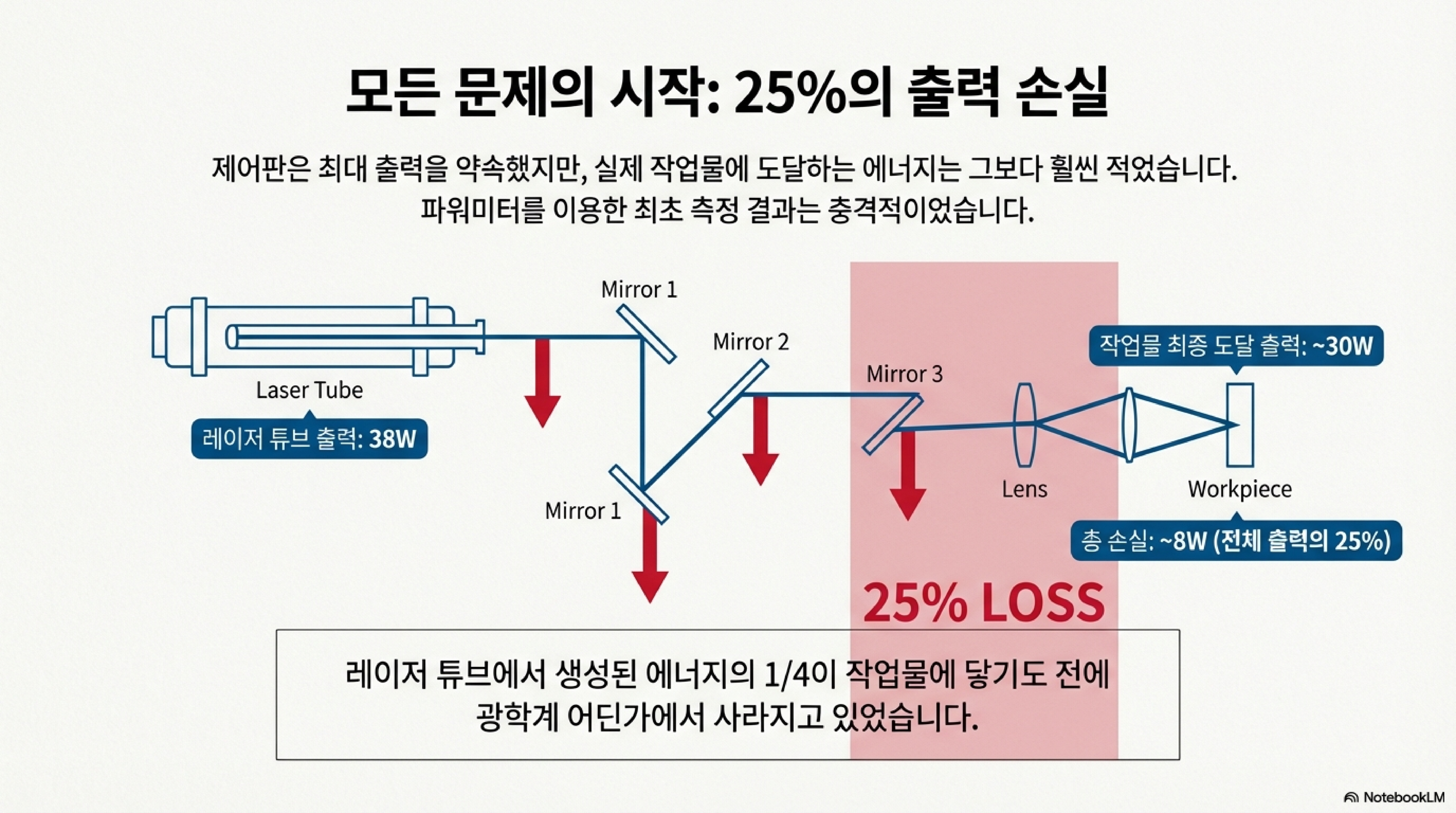 이야기의 시작은 충격적인 발견과 함께였습니다. 유튜버는 자신의 레이저 튜브에서 나오는 출력이 약 37~38와트(W)로 측정되었지만, 이 출력이 광경로를 거쳐 실제 작업물에 도달할 때는 단 30W에 불과하다는 사실을 알아냈습니다. 이는 무려 25%의 출력 손실이 중간에 발생하고 있다는 의미였습니다. 이 손실은 마치 4기통 자동차를 샀는데 실린더 하나가 처음부터 작동하지 않았다는 사실을 뒤늦게 깨달은 것과 같습니다. 기계는 작동하지만, 항상 힘겨워하며 제 성능을 내지 못하고 있었던 것입니다.