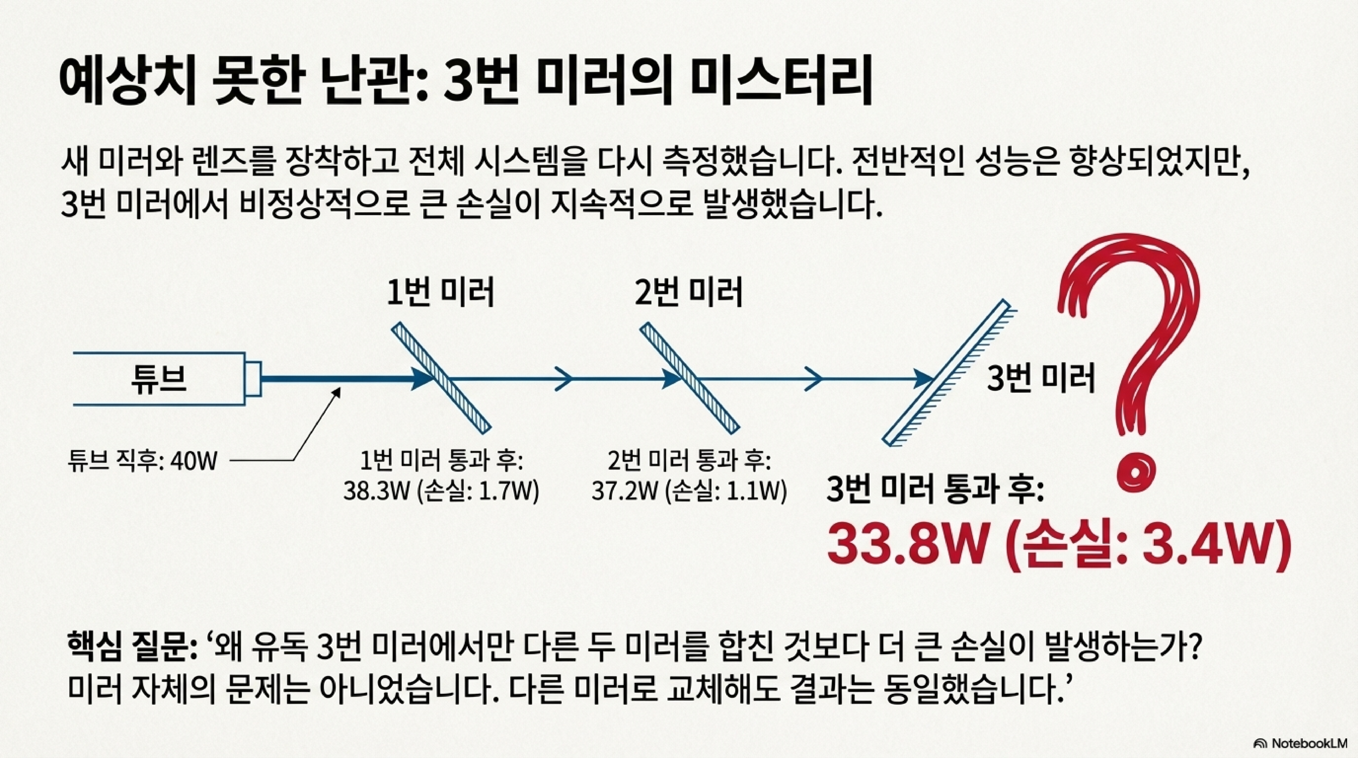 초기 용의자는 거울이었습니다. 성능이 낮은 부품은 흔한 범인이니까요. 하지만 파워 미터의 데이터는 훨씬 더 놀랍고 숨겨진 공범을 지목했습니다. 측정을 계속한 결과, 가장 큰 출력 손실(약 3.4W)이 특정 거울, 즉 세 번째 거울에서 집중적으로 발생한다는 사실을 발견했습니다. 하지만 거울을 교체해도 문제는 해결되지 않았습니다.