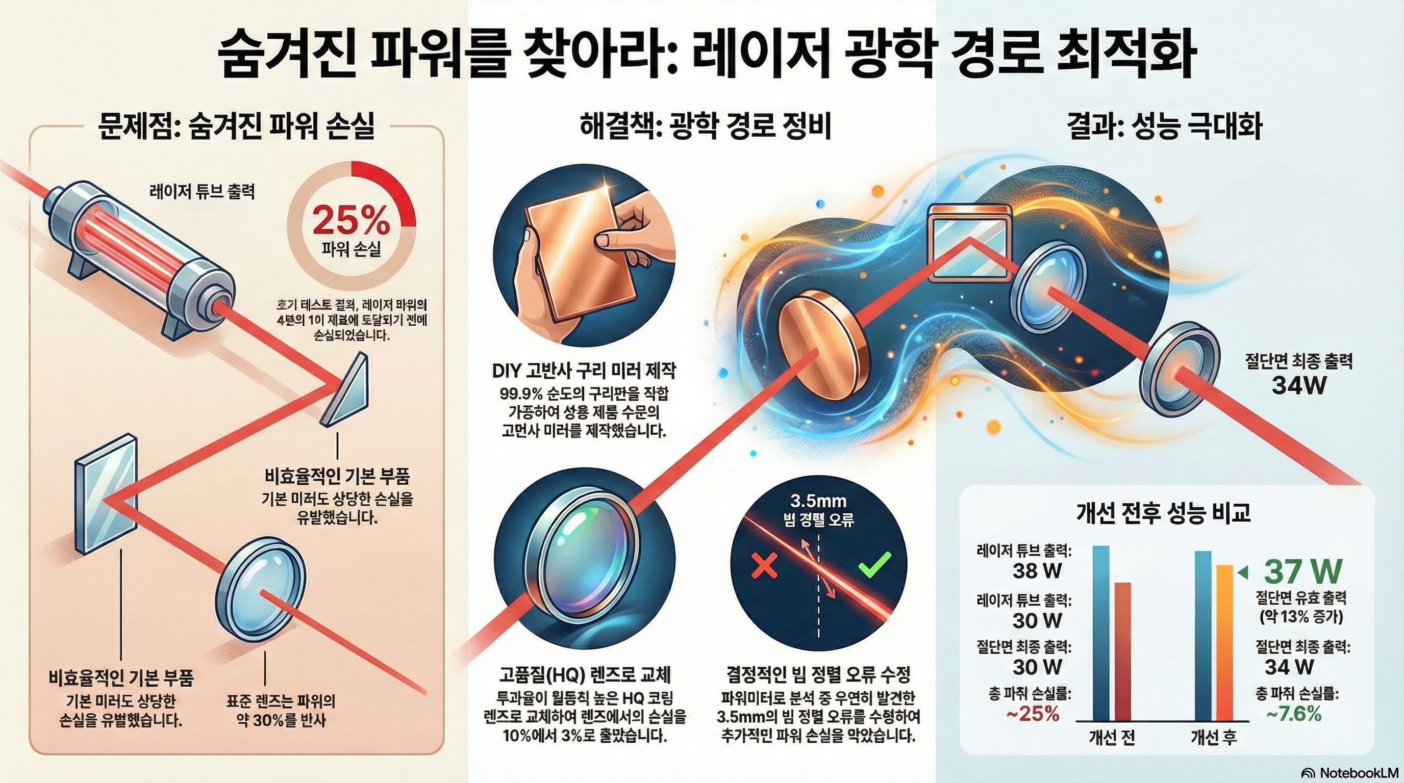 이 글은 한 유튜버가 간단한 구리 거울 제작 프로젝트를 진행하다가, 자신의 레이저 커터에서 엄청난 출력 손실의 근본 원인을 우연히 발견하게 된 여정을 따라갑니다. 이 과정에서 그는 자신의 기계 성능을 극적으로 향상시킨, 놀랍고도 반직관적인 사실들을 마주하게 됩니다. 여러분의 작업 효율을 바꿀 수도 있는 그의 발견을 지금부터 하나씩 살펴보겠습니다.