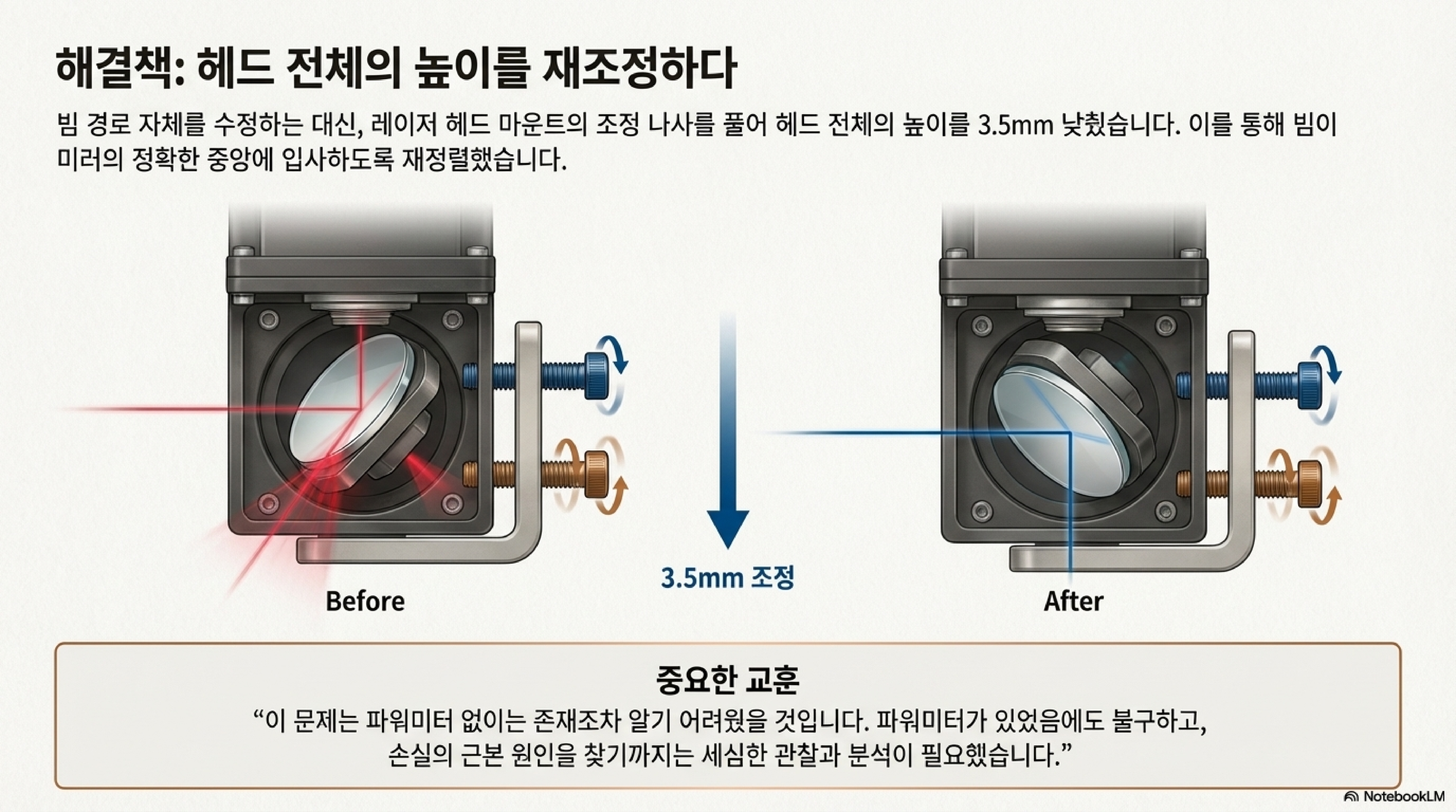 여기서 반전이 일어납니다. 이 발견의 핵심은 문제가 광학적(나쁜 거울)인 것이 아니라 기계적(잘못 정렬된 헤드)이라는 점이었습니다. 레이저 빔이 거울의 중앙을 통과하지 못하고 가장자리를 스치면서 지나가고 있었던 것입니다. 정밀하게 측정해보니, 레이저 헤드 전체가 무려 3.5mm나 낮게 설치되어 있었습니다. 이는 눈에 보이지 않는 단순한 기계적 오류가 복잡한 광학 문제처럼 위장하고 있었던 셈입니다. 순수주의자들은 눈살을 찌푸리겠지만, 그는 버니어 캘리퍼스를 스크라이버처럼 사용해 정확한 위치를 표시하고 헤드를 재조정했습니다.